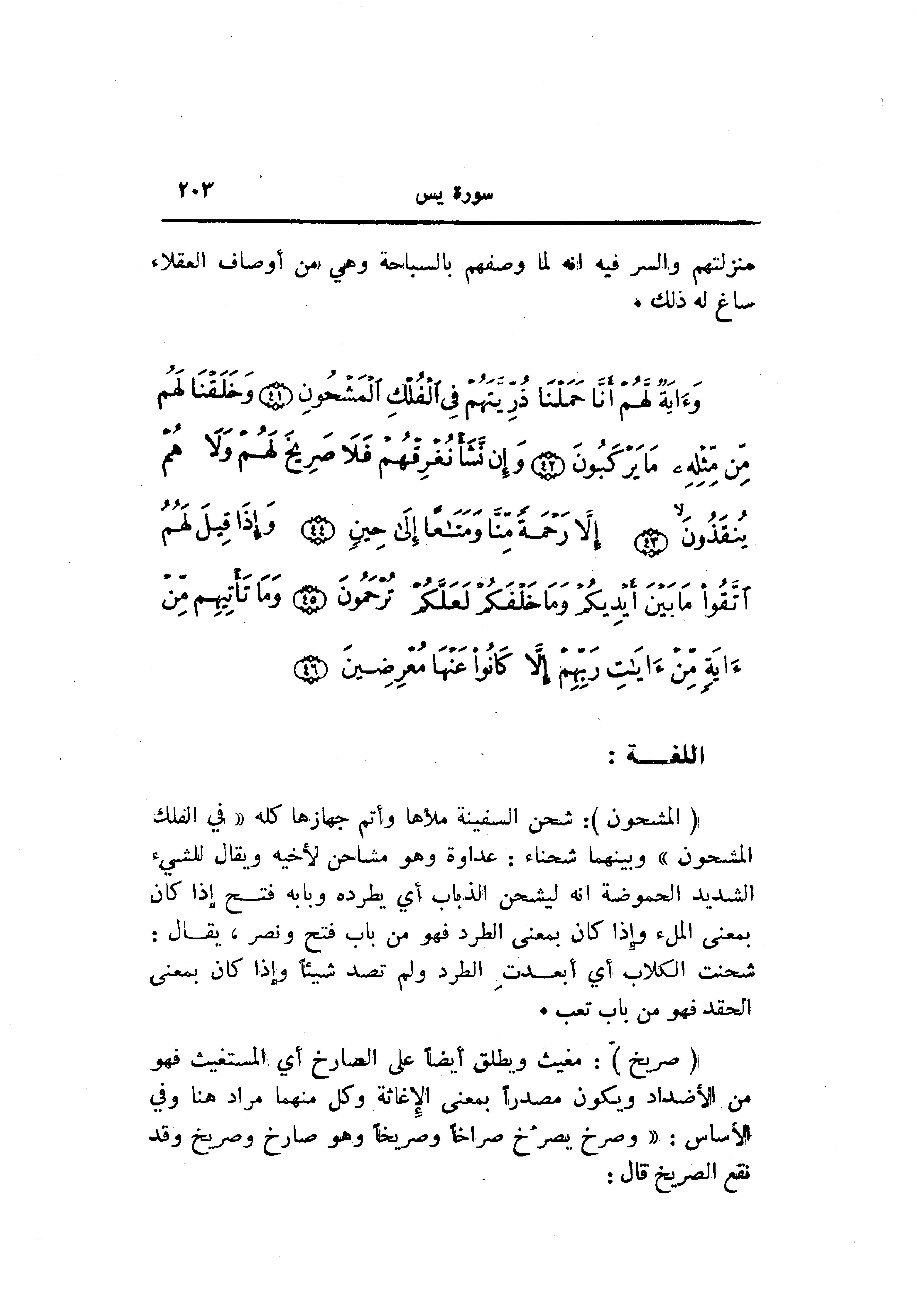 (الْمَشْحُونِ) : شحن السفينة ملأها وأتم جهازها كله «في الفلك المشحون» وبينهما شحناء: عداوة وهو مشاحن لأخيه ويقال للشيء الشديد الحموضة انه ليشحن الذباب أي يطرده وبابه فتح إذا كان بمعنى الملء وإذا كان بمعنى الطرد فهو من باب فتح ونصر، يقال: