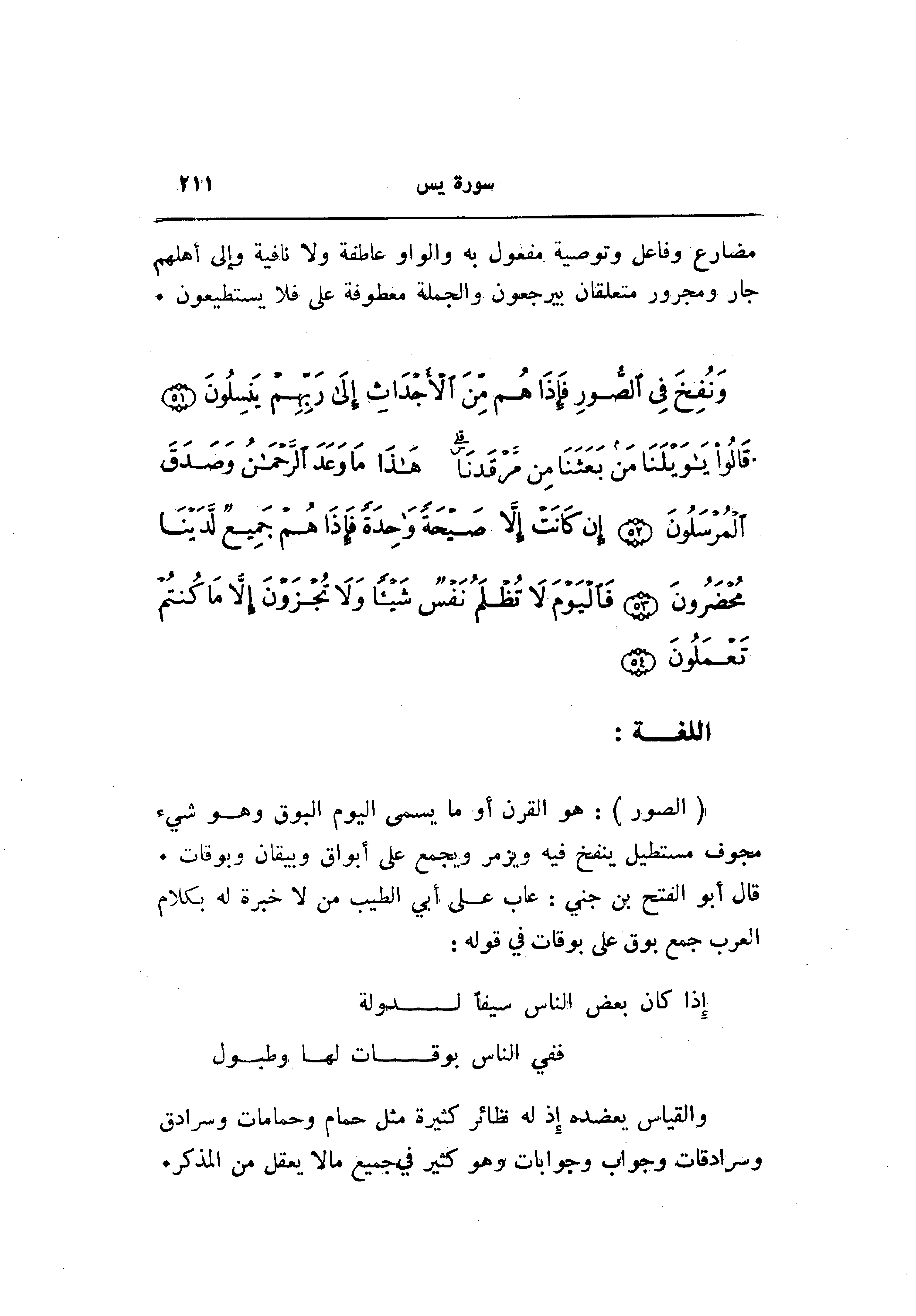 وَنُفِخَ فِي الصُّورِ فَإِذا هُمْ مِنَ الْأَجْداثِ إِلى رَبِّهِمْ يَنْسِلُونَ (51) قالُوا يا وَيْلَنا مَنْ بَعَثَنا مِنْ مَرْقَدِنا هذا ما وَعَدَ الرَّحْمنُ وَصَدَقَ الْمُرْسَلُونَ (52) إِنْ كانَتْ إِلاَّ صَيْحَةً واحِدَةً فَإِذا هُمْ جَمِيعٌ لَدَيْنا مُحْضَرُونَ (53) فَالْيَوْمَ لا تُظْلَمُ نَفْسٌ شَيْئاً وَلا تُجْزَوْنَ إِلاَّ ما كُنْتُمْ تَعْمَلُونَ (54)