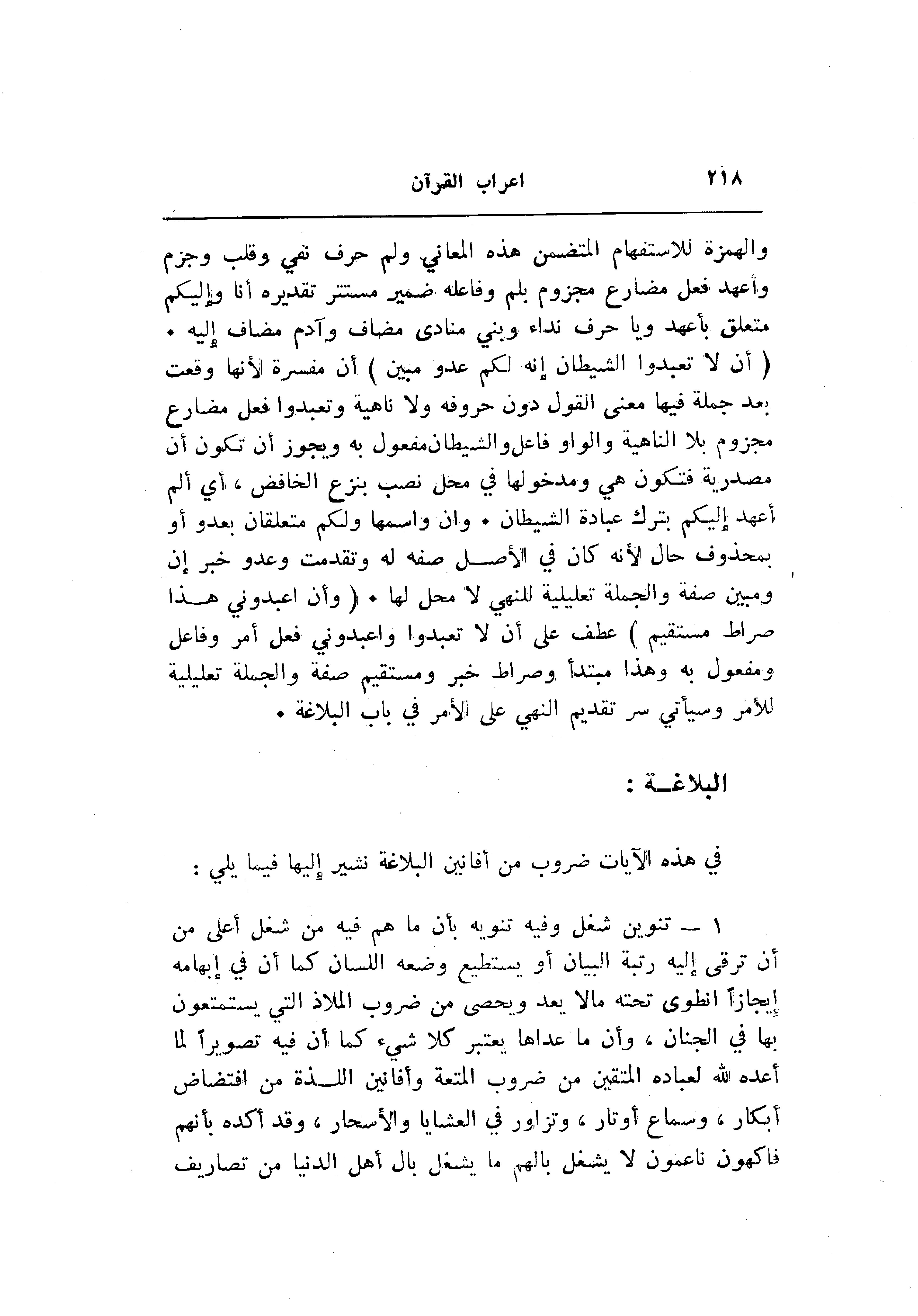 (أَنْ لا تَعْبُدُوا الشَّيْطانَ إِنَّهُ لَكُمْ عَدُوٌّ مُبِينٌ) أن مفسرة لأنها وقعت بعد جملة فيها معنى القول دون حروفه ولا ناهية وتعبدوا فعل مضارع مجزوم بلا الناهية والواو فاعل والشيطان مفعول به ويجوز أن تكون أن مصدرية فتكون هي ومدخولها في محل نصب بنزع الخافض، أي ألم أعهد إليكم بترك عبادة الشيطان. وان واسمها ولكم متعلقان بعدو أو بمحذوف حال لأنه كان في الأصل صفه له وتقدمت وعدو خبر إن ومبين صفة والجملة تعليلية للنهي لا محل لها. (وَأَنِ اعْبُدُونِي هذا صِراطٌ مُسْتَقِيمٌ) عطف على أن لا تعبدوا واعبدوني فعل أمر وفاعل ومفعول به وهذا مبتدأ وصراط خبر ومستقيم صفة والجملة تعليلية للأمر وسيأتي سر تقديم النهي على الأمر في باب البلاغة.