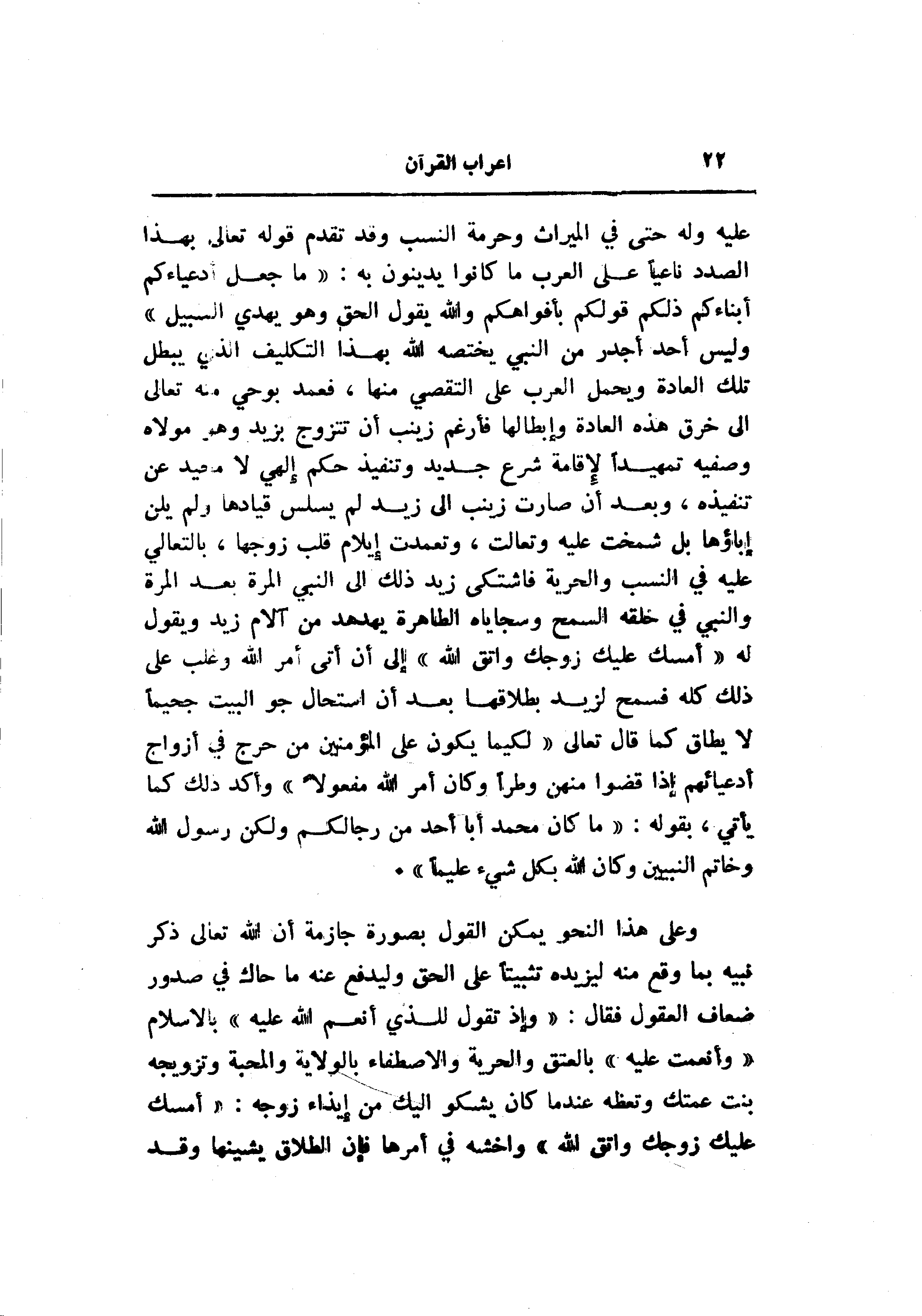عليه وله حتى في الميراث وحرمة النسب وقد تقدم قوله تعالى بهذا الصدد ناعيا على العرب ما كانوا يدينون به: «ما جعل أدعياءكم أبناءكم ذلكم قولكم بأفواهكم والله يقول الحق وهو يهدي السبيل» وليس أحد أجدر من النبي يختصه الله بهذا التكليف الذي يبطل تلك العادة ويحمل العرب على التقصي منها، فعمد بوحي منه تعالى الى خرق هذه العادة وإبطالها فأرغم زينب أن تتزوج بزيد وهو مولاه وصفيه تمهيدا لإقامة شرع جديد وتنفيذ حكم إلهي لا محيد عن تنفيذه، وبعد أن صارت زينب الى زيد لم يسلس قيادها ولم يلن إباؤها بل شمخت عليه وتعالت، وتعمدت إيلام قلب زوجها، بالتعالي عليه في النسب والحرية فاشتكى زيد ذلك إلى النبي المرة بعد المرة والنبي في خلقه السمح وسجاياه الطاهرة يهدهد من آلام زيد ويقول له «أمسك عليك زوجك واتق الله» إلى أن أتى أمر الله وغلب على ذلك كله فسمح لزيد بطلاقها بعد أن استحال جو البيت جحيما لا يطاق كما قال تعالى «لكيما يكون على المؤمنين من حرج في أزواج أدعيائهم إذا قضوا منهن وطرا وكان أمر الله مفعولا» وأكد ذلك كما يأتي، بقوله: «ما كان محمد أبا أحد من رجالكم ولكن رسول الله وخاتم النبيين وكان الله بكل شيء عليما» .