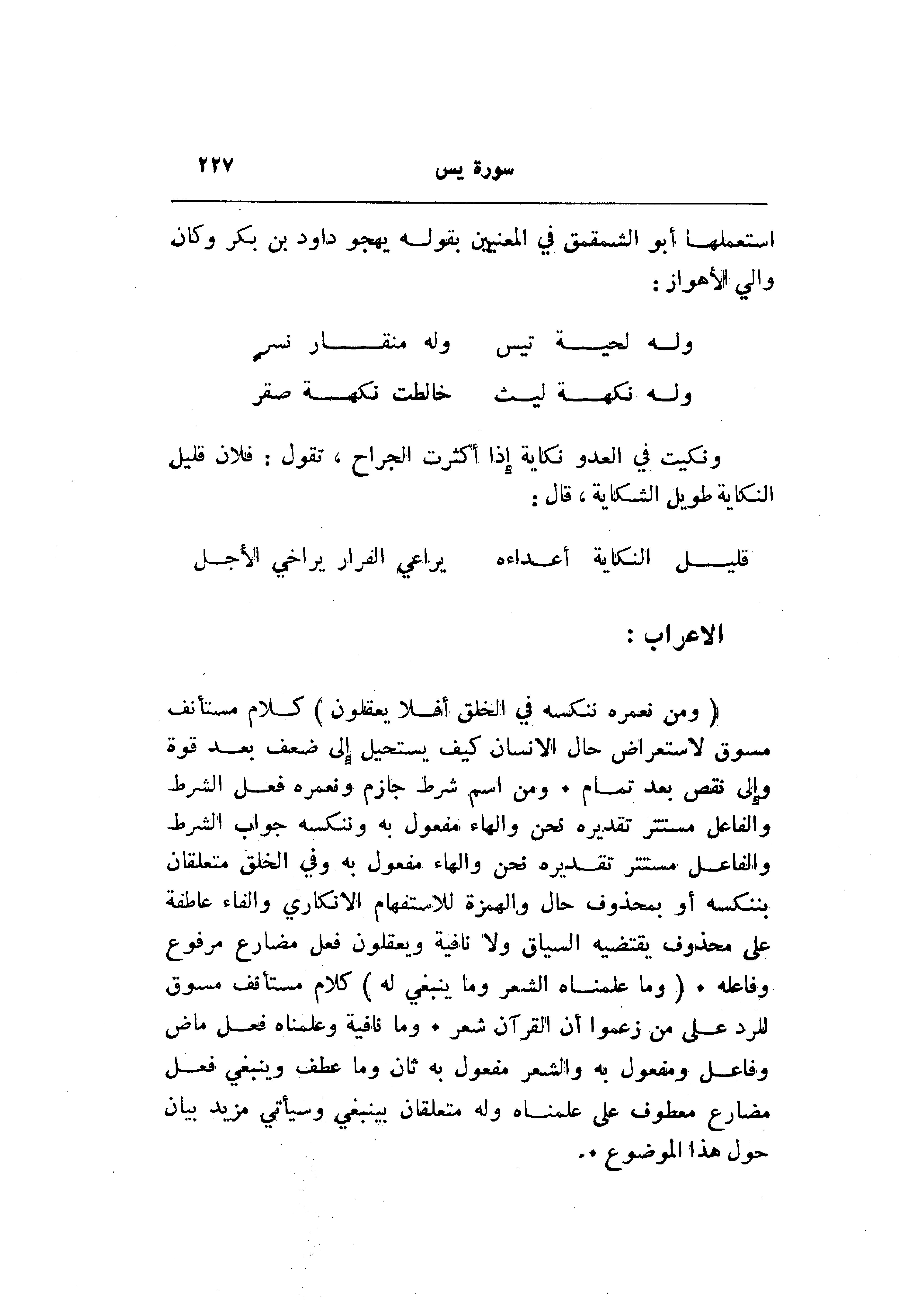 (وَمَنْ نُعَمِّرْهُ نُنَكِّسْهُ فِي الْخَلْقِ أَفَلا يَعْقِلُونَ) كلام مستأنف مسوق لاستعراض حال الإنسان كيف يستحيل إلى ضعف بعد قوة وإلى نقص بعد تمام. ومن اسم شرط جازم ونعمره فعل الشرط والفاعل مستتر تقديره نحن والهاء مفعول به وننكسه جواب الشرط والفاعل مستتر تقديره نحن والهاء مفعول به وفي الخلق متعلقان بننكسه أو بمحذوف حال والهمزة للاستفهام الانكاري والفاء عاطفة على محذوف يقتضيه السياق ولا نافية ويعقلون فعل مضارع مرفوع وفاعله. (وَما عَلَّمْناهُ الشِّعْرَ وَما يَنْبَغِي لَهُ) كلام مستأنف مسوق للرد على من زعموا أن القرآن شعر. وما نافية وعلمناه فعل ماض وفاعل ومفعول به والشعر مفعول به ثان وما عطف وينبغي فعل مضارع معطوف على علمناه وله متعلقان بينبغي وسيأتي مزيد بيان حول هذا الموضوع.