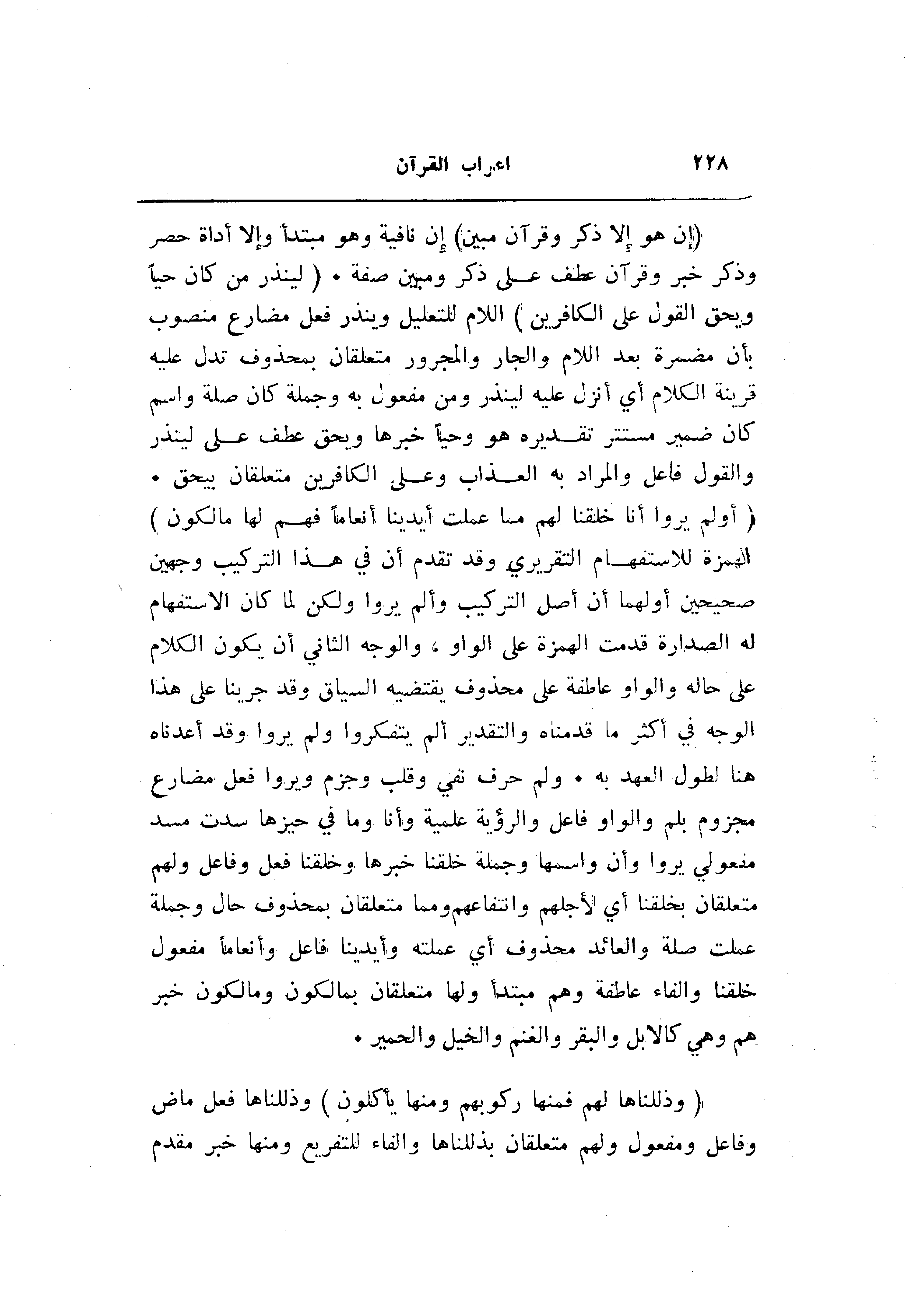 (إِنْ هُوَ إِلَّا ذِكْرٌ وَقُرْآنٌ مُبِينٌ) إن نافية وهو مبتدأ وإلا أداة حصر وذكر خبر وقرآن عطف على ذكر ومبين صفة. (لِيُنْذِرَ مَنْ كانَ حَيًّا وَيَحِقَّ الْقَوْلُ عَلَى الْكافِرِينَ) اللام للتعليل وينذر فعل مضارع منصوب بأن مضمرة بعد اللام والجار والمجرور متعلقان بمحذوف تدل عليه قرينة الكلام أي أنزل عليه لينذر ومن مفعول به وجملة كان صلة واسم كان ضمير مستتر تقديره هو وحيا خبرها ويحق عطف على لينذر والقول فاعل والمراد به العذاب وعلى الكافرين متعلقان بيحق.