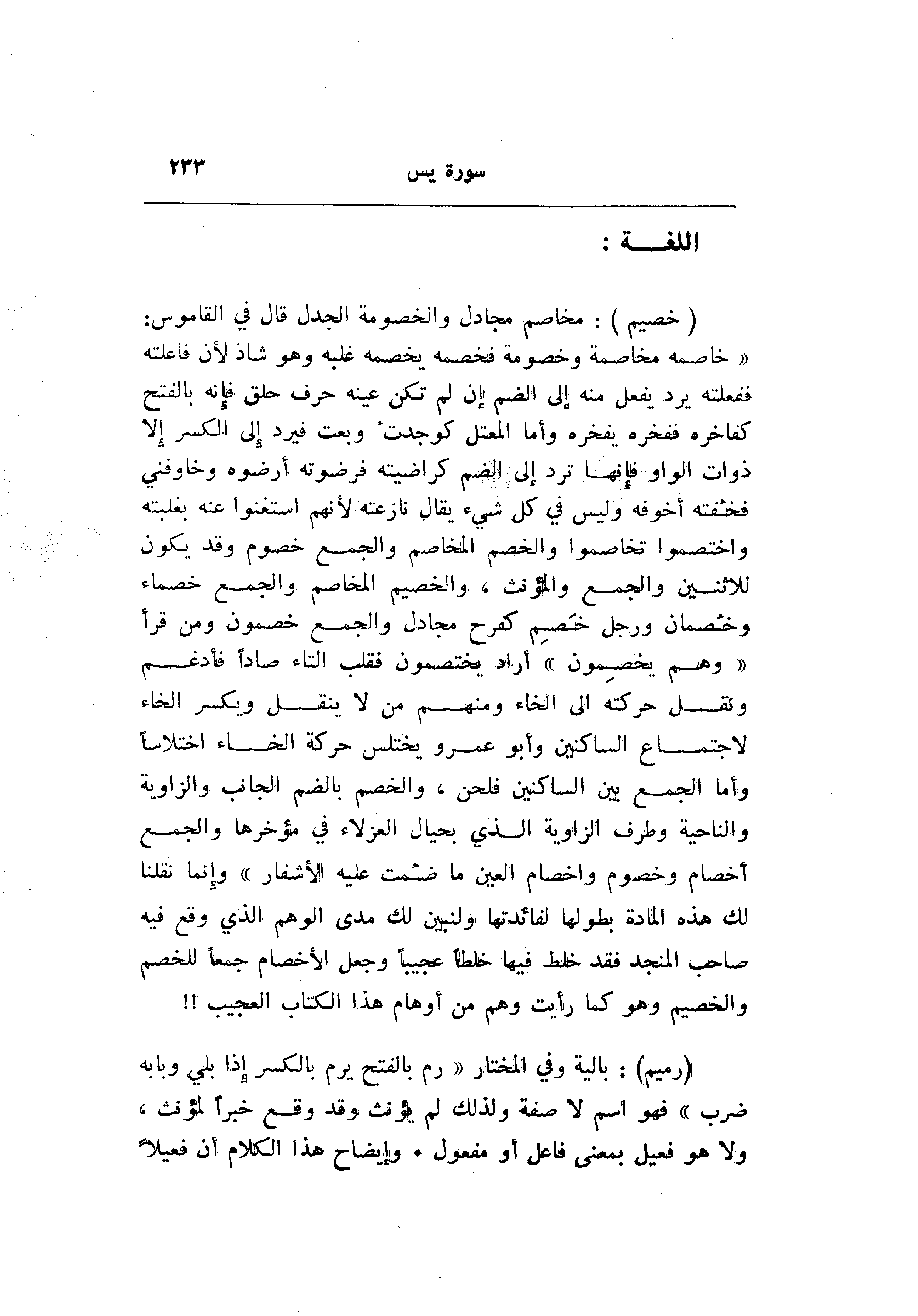 «خاصمه مخاصمة وخصومة فخصمه يخصمه غلبه وهو شاذ لأن فاعلته ففعلته يرد يفعل منه إلى الضم إن لم تكن عينه حرف حلق فإنه بالفتح كفاخره ففخره يفخره وأما المعتل كوجدت وبعت فيرد إلى الكسر إلا ذوات الواو فإنها ترد إلى الضم كراضيته فرضوته أرضوه وخاوفني فخفته أخوفه وليس في كل شيء يقال نازعته لأنهم استغنوا عنه بغلبته واختصموا تخاصموا والخصم المخاصم والجمع خصوم وقد يكون للاثنين والجمع والمؤنث، والخصيم المخاصم والجمع خصماء وخصمان ورجل خصم كفرح مجادل والجمع خصمون ومن قرأ «وهم يخصمون» أراد يختصمون فقلب التاء صادا فأدغم ونقل حركته إلى الخاء ومنهم من لا ينقل ويكسر الخاء لاجتماع الساكنين وأبو عمرو يختلس حركة الخاء اختلاسا وأما الجمع بين الساكنين فلحن، والخصم بالضم الجانب والزاوية والناحية وطرف الزاوية الذي بحيال العزلاء في مؤخرها والجمع أخصام وخصوم واخصام العين ما ضمت عليه الأشفار» وإنما نقلنا لك هذه المادة بطولها لفائدتها ولنبين لك مدى الوهم الذي وقع فيه صاحب المنجد فقد خلط فيها خلطا عجيبا وجعل الأخصام جمعا للخصم والخصيم وهو كما رأيت وهم من أوهام هذا الكتاب العجيب!! (رَمِيمٌ) : بالية وفي المختار «رم بالفتح يرم بالكسر إذا بلي وبابه ضرب» فهو اسم لا صفة ولذلك لم يؤنث وقد وقع خبرا لمؤنث، ولا هو فعيل بمعنى فاعل أو مفعول. وإيضاح هذا الكلام أن فعيلا