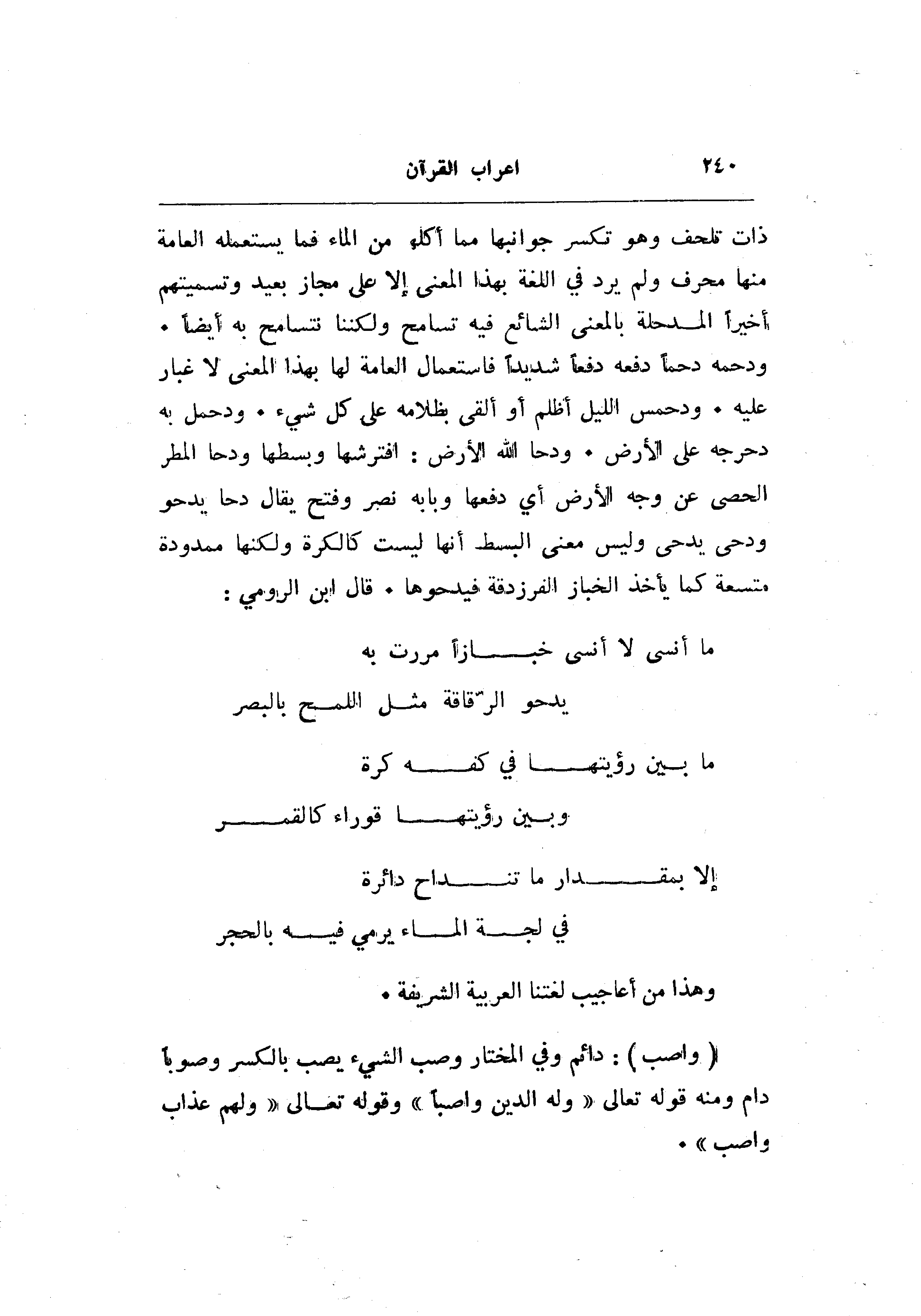 (واصِبٌ) : دائم وفي المختار وصب الشيء يصب بالكسر وصوبا دام ومنه قوله تعالى «وله الدين واصبا» وقوله تعالى «ولهم عذاب واصب» .