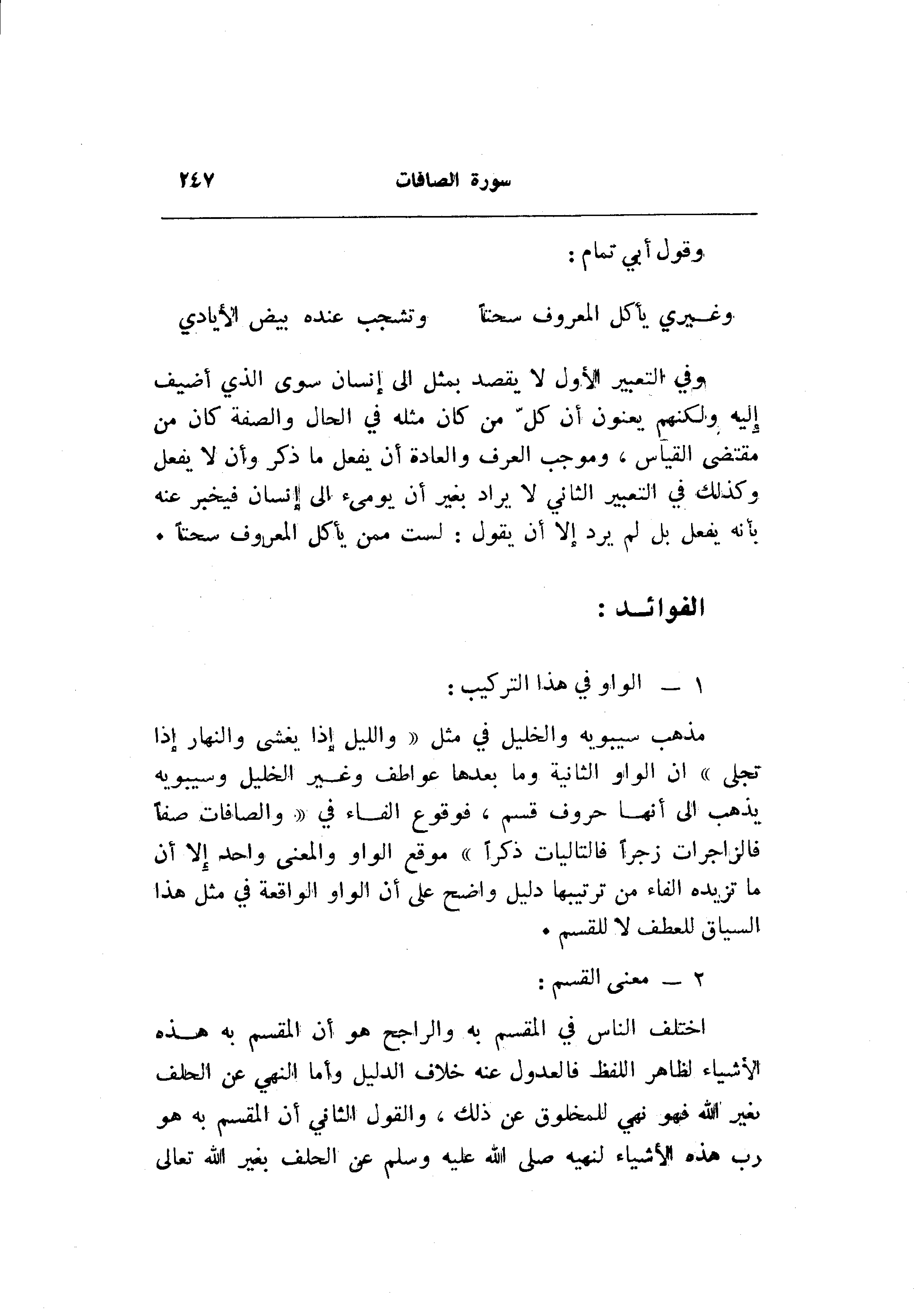 مذهب سيبويه والخليل في مثل «والليل إذا يغشى والنهار إذا تجلى» ان الواو الثانية وما بعدها عواطف وغير الخليل وسيبويه يذهب الى أنها حروف قسم، فوقوع الفاء في «والصافات صفا فالزاجرات زجرا فالتاليات ذكرا» موقع الواو والمعنى واحد إلا أن ما تزيده الفاء من ترتيبها دليل واضح على أن الواو الواقعة في مثل هذا السياق للعطف لا للقسم.