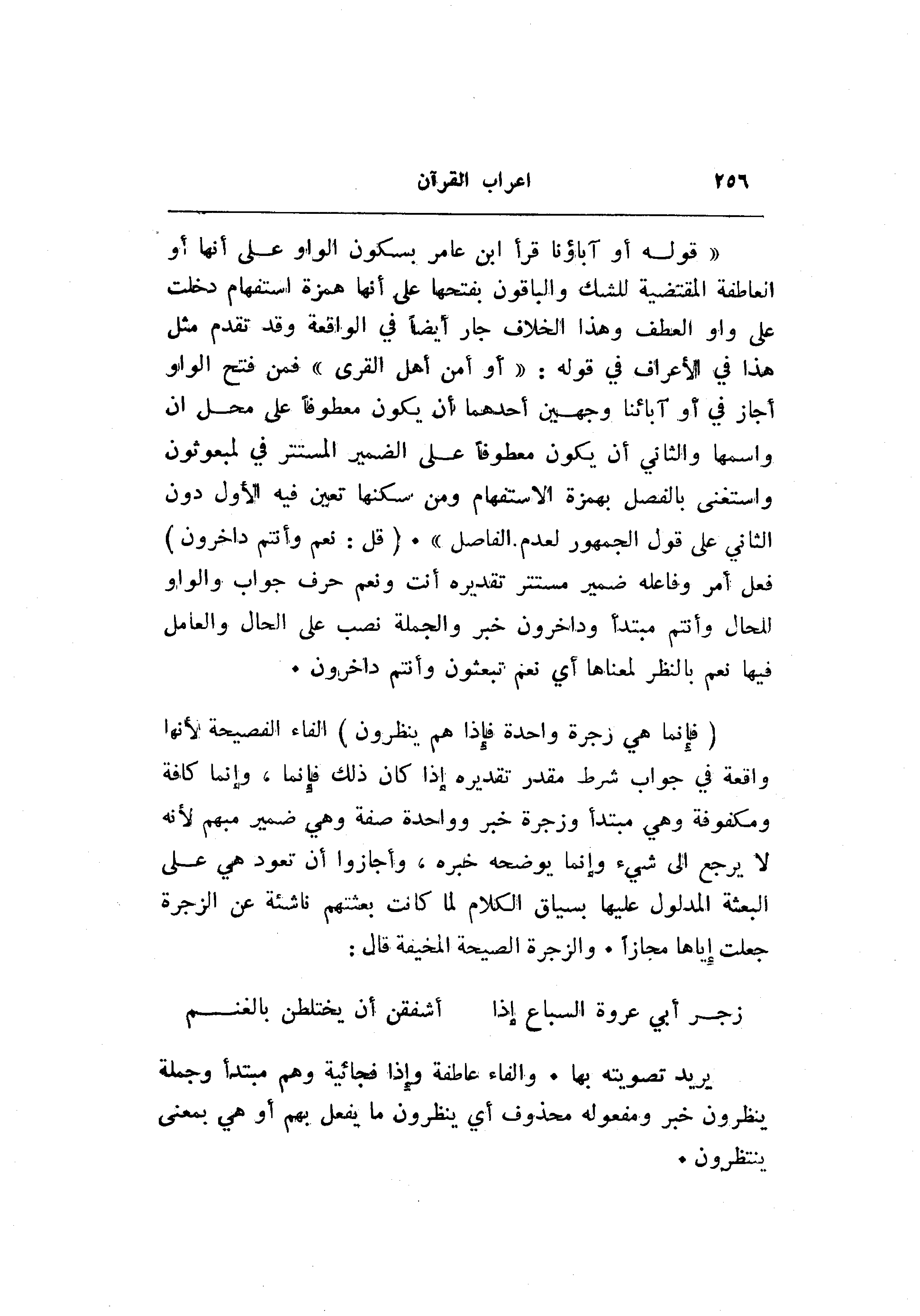 «قوله أو آباؤنا قرأ ابن عامر بسكون الواو على أنها أو العاطفة المقتضية للشك والباقون بفتحها على أنها همزة استفهام دخلت على واو العطف وهذا الخلاف جار أيضا في الواقعة وقد تقدم مثل هذا في الأعراف في قوله: «أو أمن أهل القرى» فمن فتح الواو أجاز في أو آبائنا وجهين أحدهما أن يكون معطوفا على محل ان واسمها والثاني أن يكون معطوفا على الضمير المستتر في لمبعوثون واستغنى بالفصل بهمزة الاستفهام ومن سكنها تعين فيه الأول دون الثاني على قول الجمهور لعدم الفاصل» . (قُلْ: نَعَمْ وَأَنْتُمْ داخِرُونَ) فعل أمر وفاعله ضمير مستتر تقديره أنت ونعم حرف جواب والواو للحال وأنتم مبتدأ وداخرون خبر والجملة نصب على الحال والعامل فيها نعم بالنظر لمعناها أي نعم تبعثون وأنتم داخرون.
