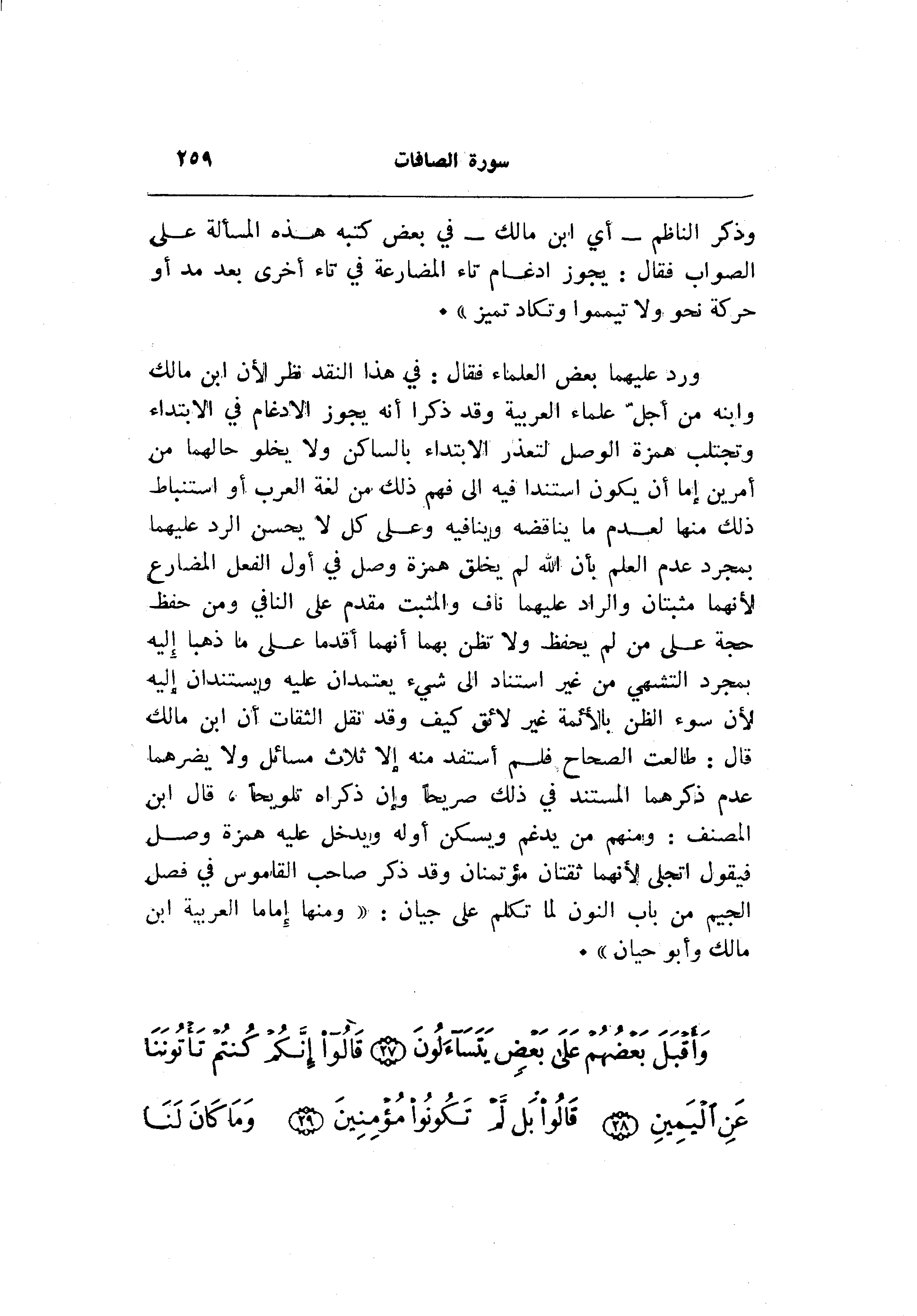 ورد عليهما بعض العلماء فقال: في هذا النقد نظر لأن ابن مالك وابنه من أجلّ علماء العربية وقد ذكرا أنه يجوز الإدغام في الابتداء وتجتلب همزة الوصل لتعذر الابتداء بالساكن ولا يخلو حالهما من أمرين إما أن يكون استندا فيه الى فهم ذلك من لغة العرب أو استنباط ذلك منها لعدم ما يناقضه وينافيه وعلى كل لا يحسن الرد عليهما بمجرد عدم العلم بأن الله لم يخلق همزة وصل في أول الفعل المضارع لأنهما مثبتان والراد عليهما ناف والمثبت مقدم على النافي ومن حفظ حجة على من لم يحفظ ولا تظن بهما أنهما أقدما على ما ذهبا إليه بمجرد التشهي من غير استناد الى شيء يعتمدان عليه ويستندان إليه لأن سوء الظن بالأئمة غير لائق كيف وقد نقل الثقات أن ابن مالك قال: طالعت الصحاح فلم أستفد منه إلا ثلاث مسائل ولا يضرهما عدم ذكرهما المستند في ذلك صريحا وإن ذكراه تلويحا، قال ابن المصنف: ومنهم من يدغم ويسكن أوله ويدخل عليه همزة وصل فيقول اتجلى لأنهما ثقتان مؤتمنان وقد ذكر صاحب القاموس في فصل الجيم من باب النون لما تكلم على جيان: «ومنها إماما العربية ابن مالك وأبو حيان» .