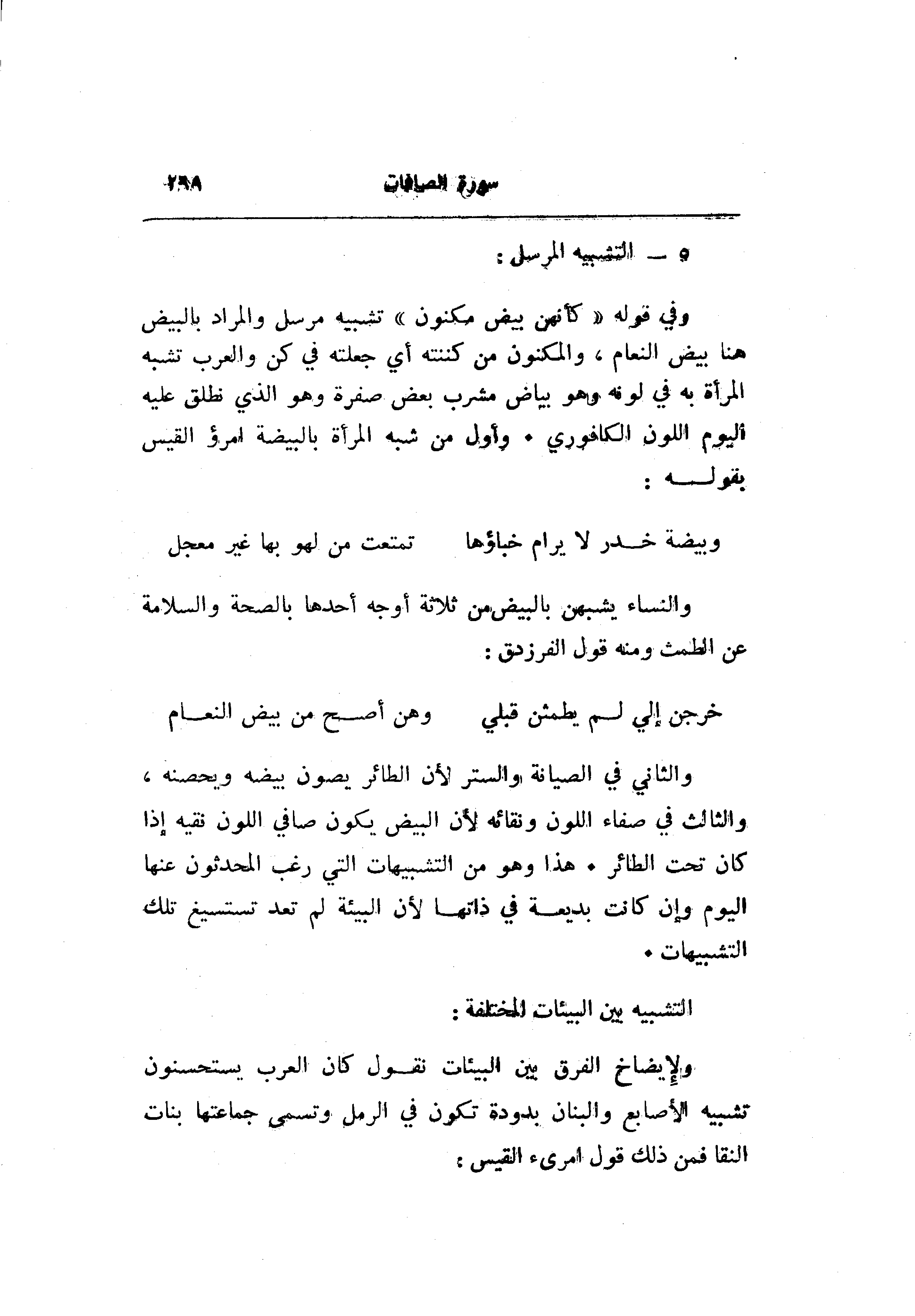 وفي قوله «كأنهن بيض مكنون» تشبيه مرسل والمراد بالبيض هنا بيض النعام، والمكنون من كننته أي جعلته في كن والعرب تشبه المرأة به في لونه وهو بياض مشرب بعض صفرة وهو الذي نطلق عليه اليوم اللون الكافوري. وأول من شبه المرأة بالبيضة امرؤ القيس بقوله: