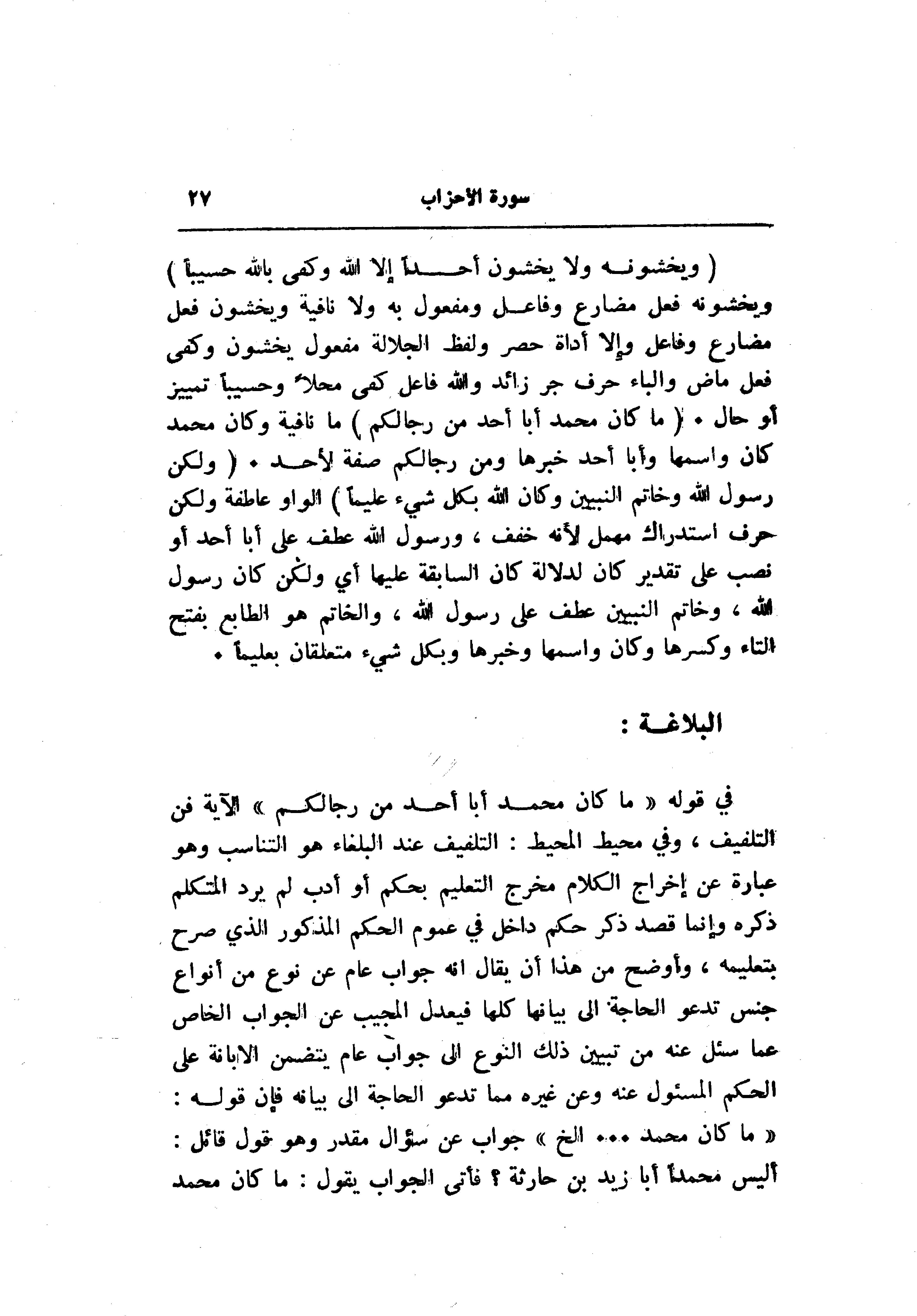 (وَيَخْشَوْنَهُ وَلا يَخْشَوْنَ أَحَداً إِلَّا اللَّهَ وَكَفى بِاللَّهِ حَسِيباً) ويخشونه فعل مضارع وفاعل ومفعول به ولا نافية ويخشون فعل مضارع وفاعل وإلا أداة حصر ولفظ الجلالة مفعول يخشون وكفى فعل ماض والباء حرف جر زائد والله فاعل كفى محلا وحسيبا تمييز أو حال. (ما كانَ مُحَمَّدٌ أَبا أَحَدٍ مِنْ رِجالِكُمْ) ما نافية وكان محمد كان واسمها وأبا أحد خبرها ومن رجالكم صفة لأحد (وَلكِنْ رَسُولَ اللَّهِ وَخاتَمَ النَّبِيِّينَ وَكانَ اللَّهُ بِكُلِّ شَيْءٍ عَلِيماً) الواو عاطفة ولكن حرف استدراك مهمل لأنه خفف، ورسول الله عطف على أبا أحد أو نصب على تقدير كان لدلالة كان السابقة عليها أي ولكن كان رسول الله، وخاتم النبيين عطف على رسول الله، والخاتم هو الطابع بفتح التاء وكسرها وكان واسمها وخبرها وبكل شيء متعلقان بعليما.