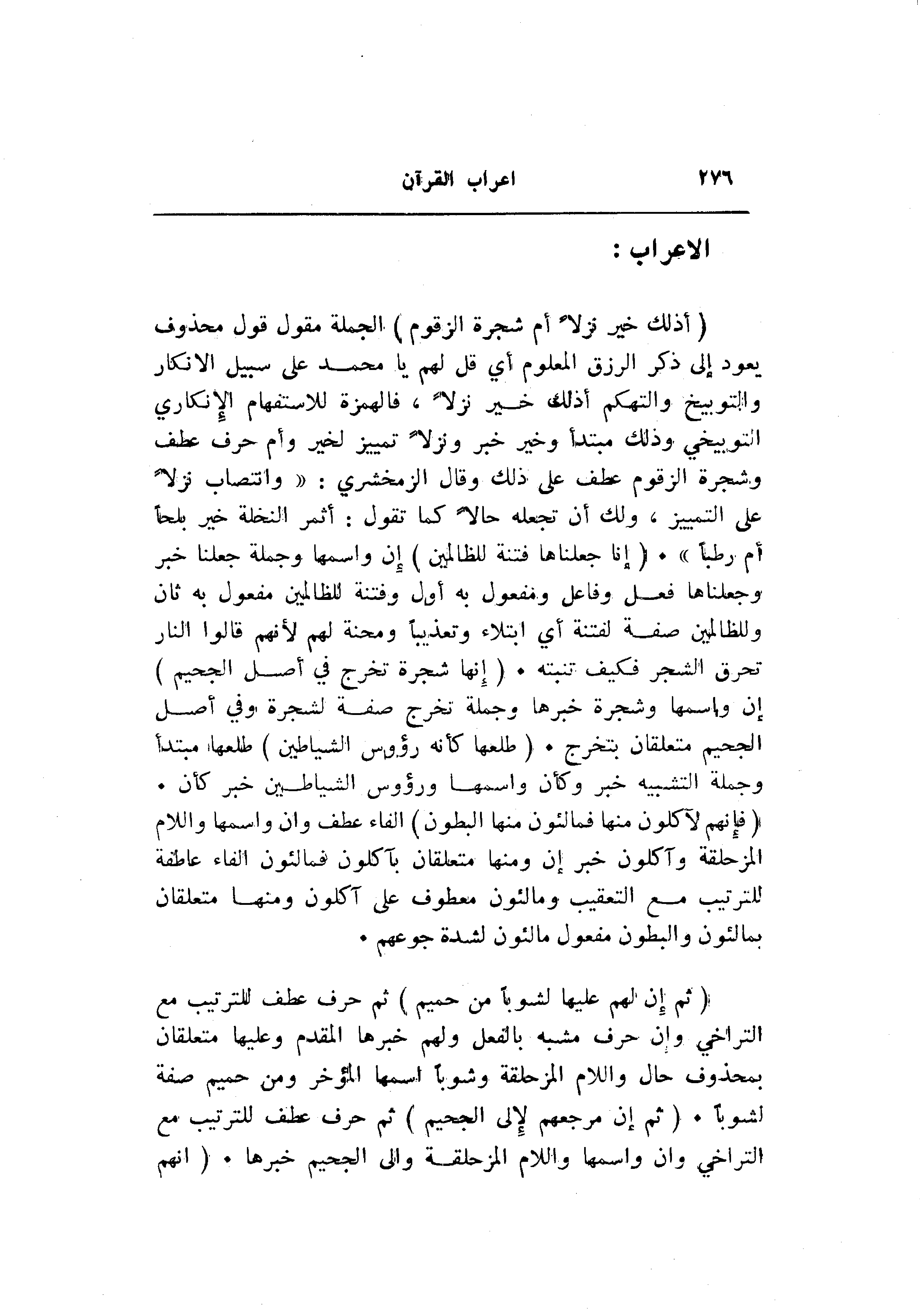 (أَذلِكَ خَيْرٌ نُزُلًا أَمْ شَجَرَةُ الزَّقُّومِ) الجملة مقول قول محذوف يعود إلى ذكر الرزق المعلوم أي قل لهم يا محمد على سبيل الإنكار والتوبيخ والتهكم أذلك خير نزلا، فالهمزة للاستفهام الإنكاري التوبيخي وذلك مبتدأ وخير خبر ونزلا تمييز لخير وأم حرف عطف وشجرة الزقوم عطف على ذلك وقال الزمخشري: «وانتصاب نزلا على التمييز، ولك أن تجعله حالا كما تقول: أثمر النخلة خير بلحا أم رطبا» . (إِنَّا جَعَلْناها فِتْنَةً لِلظَّالِمِينَ) إن واسمها وجملة جعلنا خبر وجعلناها فعل وفاعل ومفعول به أول وفتنة للظالمين مفعول به ثان وللظالمين صفة لفتنة أي ابتلاء وتعذيبا ومحنة لهم لأنهم قالوا النار تحرق الشجر فكيف تنبته. (إِنَّها شَجَرَةٌ تَخْرُجُ فِي أَصْلِ الْجَحِيمِ) إن واسمها وشجرة خبرها وجملة تخرج صفة لشجرة وفي أصل الجحيم متعلقان بتخرج. (طَلْعُها كَأَنَّهُ رُؤُسُ الشَّياطِينِ) طلعها مبتدأ وجملة التشبيه خبر وكأن واسمها ورؤوس الشياطين خبر كأن.