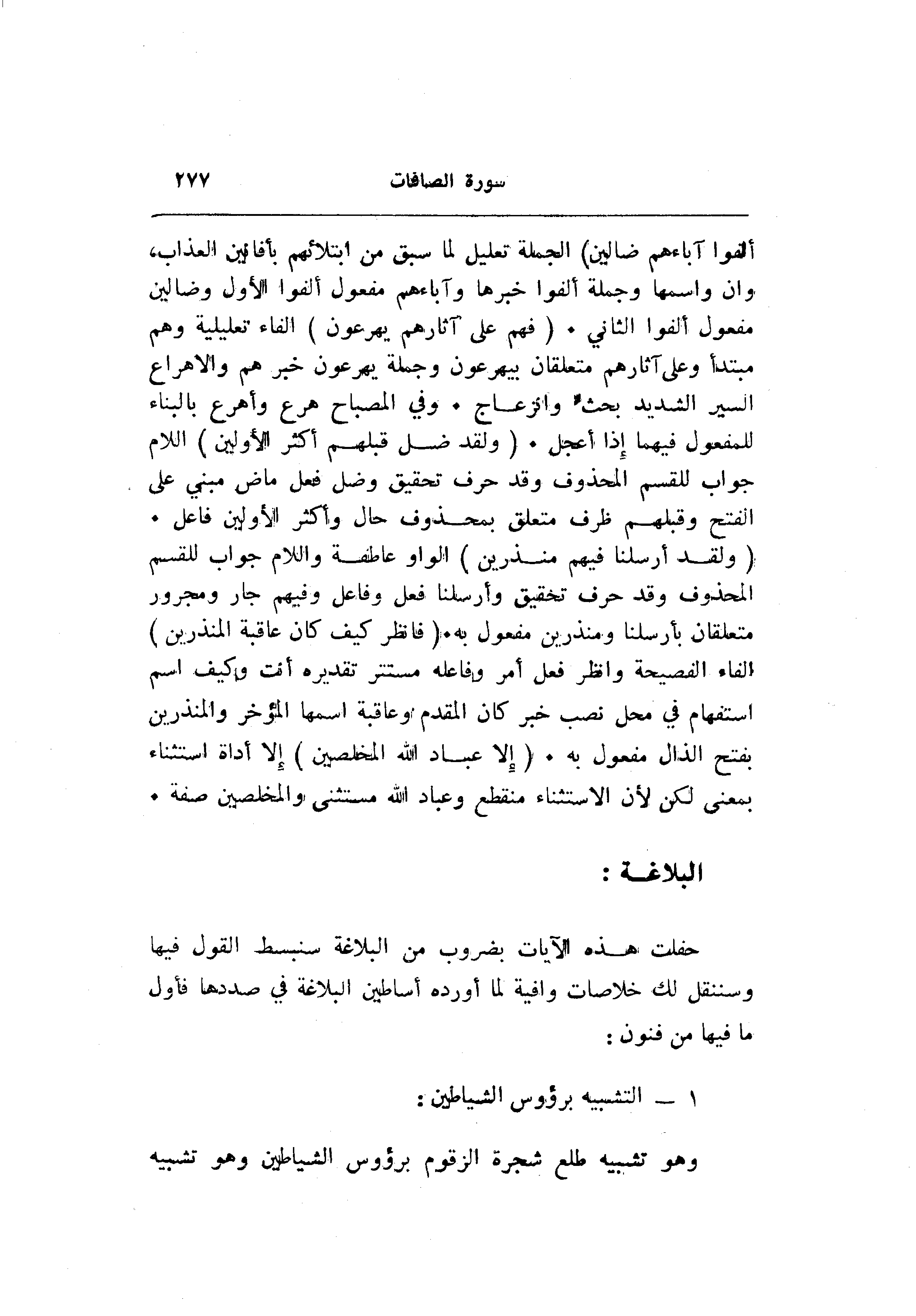 (وَلَقَدْ أَرْسَلْنا فِيهِمْ مُنْذِرِينَ) الواو عاطفة واللام جواب للقسم المحذوف وقد حرف تحقيق وأرسلنا فعل وفاعل وفيهم جار ومجرور متعلقان بأرسلنا ومنذرين مفعول به. (فَانْظُرْ كَيْفَ كانَ عاقِبَةُ الْمُنْذَرِينَ) الفاء الفصيحة وانظر فعل أمر وفاعله مستتر تقديره أنت وكيف اسم استفهام في محل نصب خبر كان المقدم وعاقبة اسمها المؤخر والمنذرين بفتح الذال مفعول به. (إِلَّا عِبادَ اللَّهِ الْمُخْلَصِينَ) إلا أداة استثناء بمعنى لكن لأن الاستثناء منقطع وعباد الله مستثنى والمخلصين صفة.