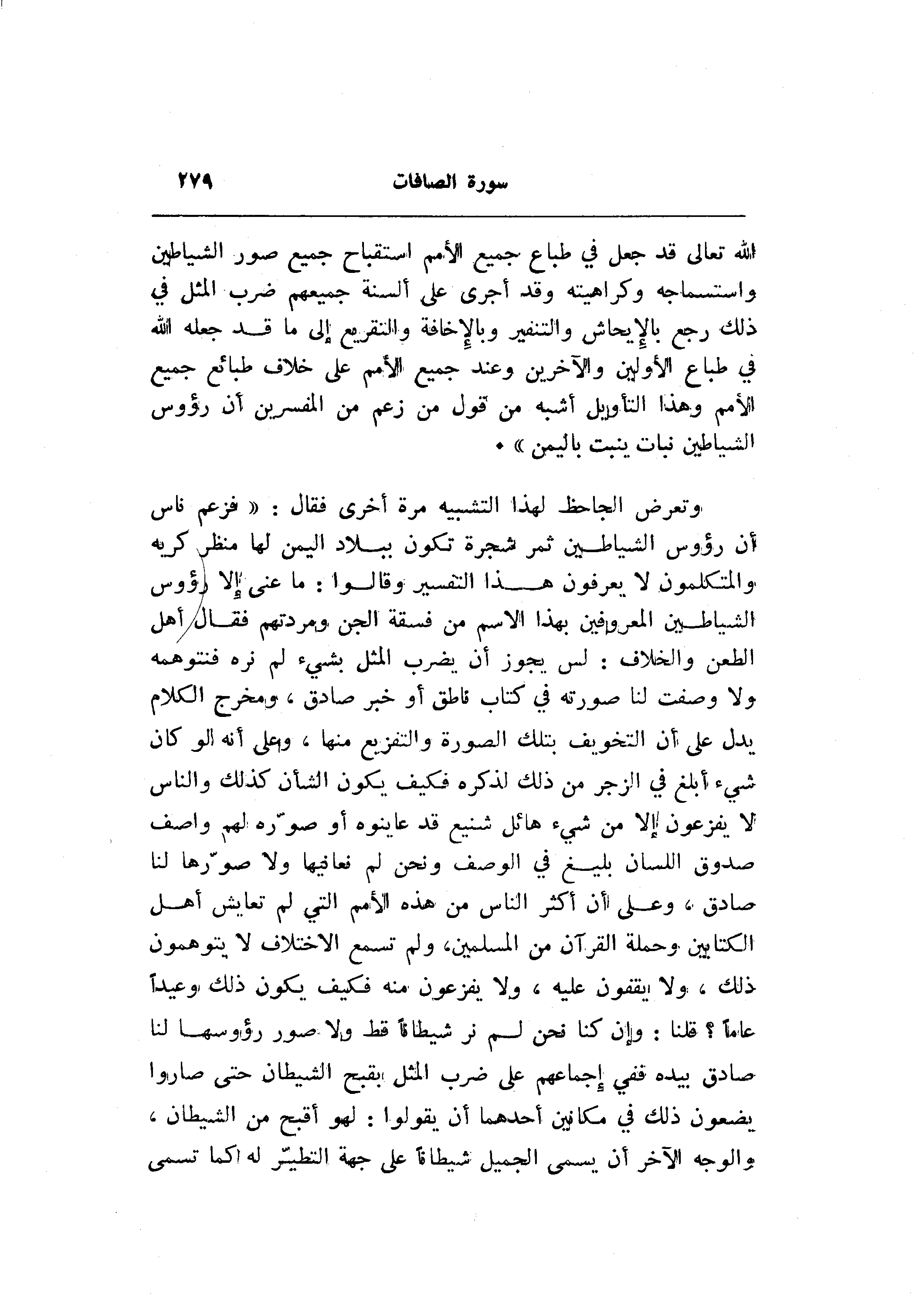 وتعرض الجاحظ لهذا التشبيه مرة أخرى فقال: «فزعم ناس أن رؤوس الشياطين ثمر شجرة تكون ببلاد اليمن لها منظر كريه والمتكلمون لا يعرفون هذا التفسير وقالوا: ما عنى إلا رؤوس الشياطين المعروفين بهذا الاسم من فسقة الجن ومردتهم فقال أهل الطعن والخلاف: لس يجوز أن يضرب المثل بشيء لم نره فنتوهمه ولا وصفت لنا صورته في كتاب ناطق أو خبر صادق، ومخرج الكلام يدل على أن التخويف بتلك الصورة والتفزيع منها، وعلى أنه لو كان شيء أبلغ في الزجر من ذلك لذكره فكيف يكون الشأن كذلك والناس لا يفزعون إلا من شيء هائل شنيع قد عاينوه أو صوّره لهم واصف صدوق اللسان بليغ في الوصف ونحن لم نعافيها ولا صوّرها لنا صادق، وعلى أن أكثر الناس من هذه الأمم التي لم تعايش أهل الكتابين وحملة القرآن من المسلمين، ولم تسمع الاختلاف لا يتوهمون ذلك، ولا يقفون عليه، ولا يفزعون منه فكيف يكون ذلك وعيدا عاما؟ قلنا: وإن كنا نحن لم نر شيطانا قط ولا صور رؤوسها لنا صادق بيده ففي إجماعهم على ضرب المثل بقبح الشيطان حتى صاروا يضعون ذلك في مكانين أحدهما أن يقولوا: لهو أقبح من الشيطان، والوجه الآخر أن يسمى الجميل شيطانا على جهة التطيّر له كما تسمى