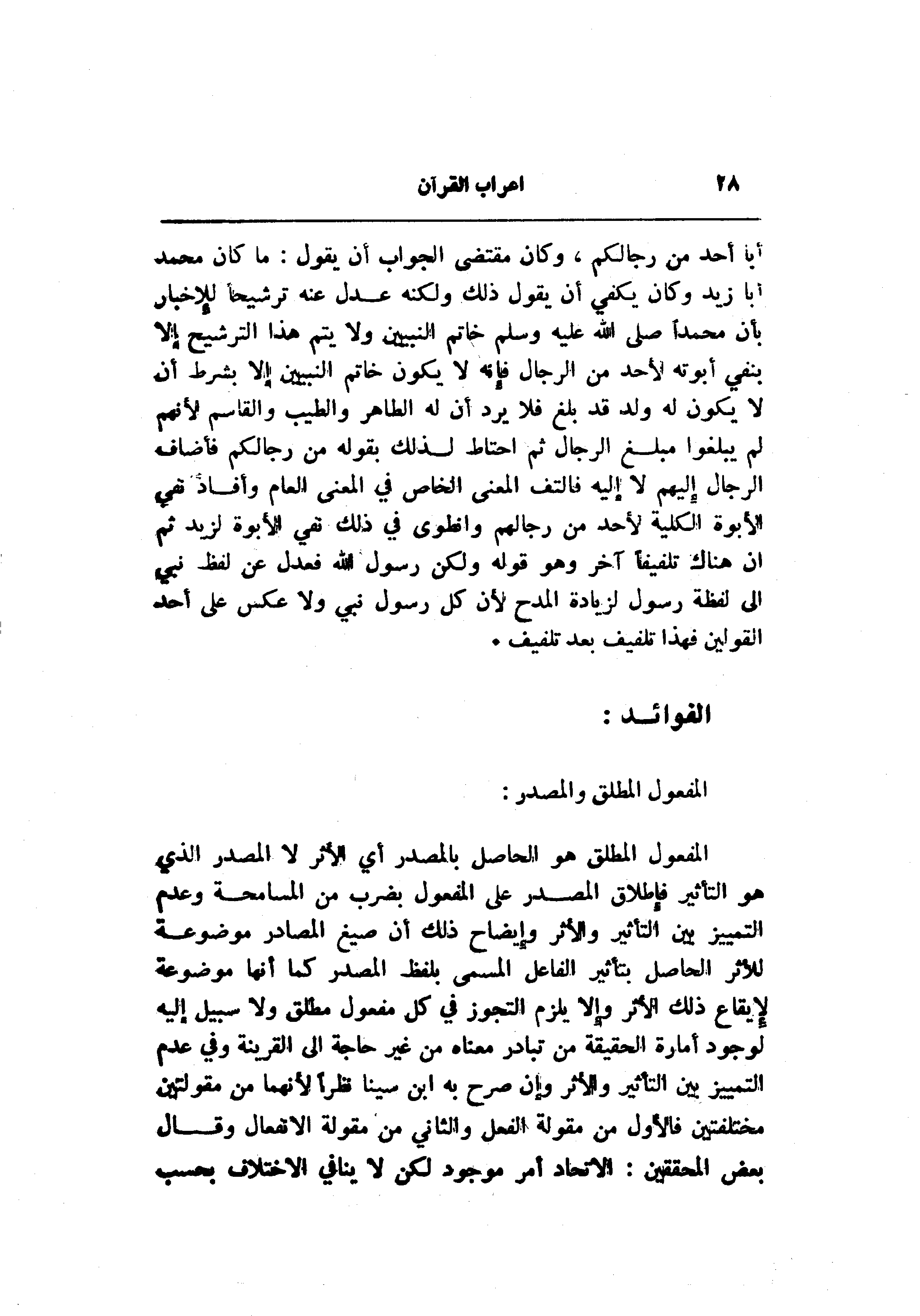 المفعول المطلق هو الحاصل بالمصدر أي الأثر لا المصدر الذي هو التأثير فإطلاق المصدر على المفعول بضرب من المسامحة وعدم التمييز بين التأثير والأثر وإيضاح ذلك أن صيغ المصادر موضوعة للأثر الحاصل بتأثير الفاعل المسمى بلفظ المصدر كما أنها موضوعة لإيقاع ذلك الأثر وإلا يلزم التجوز في كل مفعول مطلق ولا سبيل إليه لوجود أمارة الحقيقة من تبادر معناه من غير حاجة الى القرينة وفي عدم التمييز بين التأثير والأثر وإن صرح به ابن سينا نظرا لأنهما من مقولتين مختلفتين فالأول من مقولة الفعل والثاني من مقولة الانفعال وقال بعض المحققين: الاتحاد أمر موجود لكن لا ينافي الاختلاف بحسب