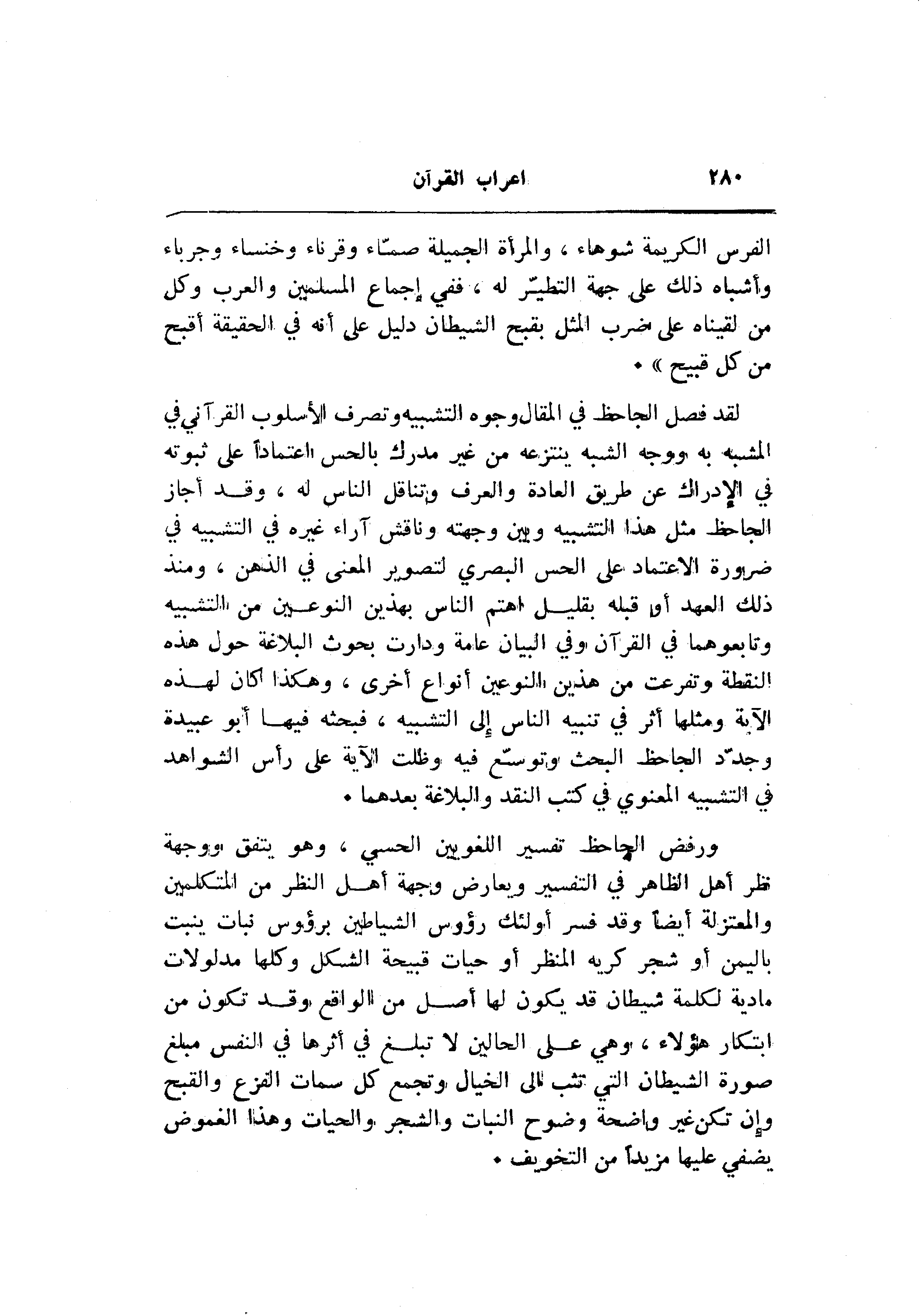 ورفض الجاحظ تفسير اللغويين الحسي، وهو يتفق ووجهة نظر أهل الظاهر في التفسير ويعارض وجهة أهل النظر من المتكلمين والمعتزلة أيضا وقد فسر أولئك رؤوس الشياطين برؤوس نبات ينبت باليمن أو شجر كريه المنظر أو حيات قبيحة الشكل وكلها مدلولات مادية لكلمة شيطان قد يكون لها أصل من الواقع وقد تكون من ابتكار هؤلاء، وهي على الحالين لا تبلغ في أثرها في النفس مبلغ صورة الشيطان التي تثب الى الخيال وتجمع كل سمات الفزع والقبح وإن تكن غير واضحة وضوح النبات والشجر والحيات وهذا الغموض يضفي عليها مزيدا من التخويف.