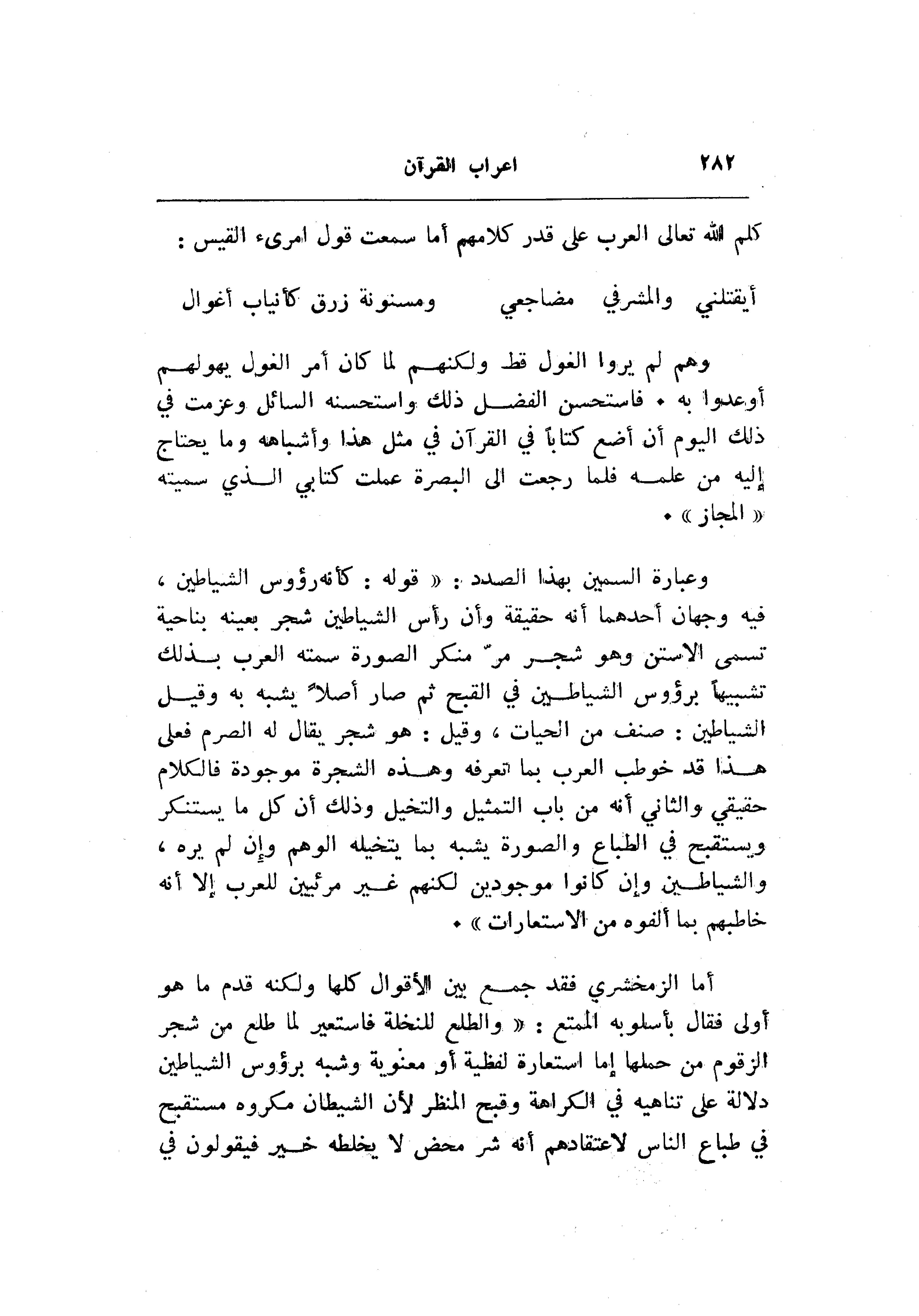 وعبارة السمين بهذا الصدد: «قوله: كأنه رؤوس الشياطين، فيه وجهان أحدهما أنه حقيقة وأن رأس الشياطين شجر بعينه بناحية تسمى الاستن وهو شجر مرّ منكر الصورة سمته العرب بذلك تشبيها برؤوس الشياطين في القبح ثم صار أصلا يشبه به وقيل الشياطين: صنف من الحيات، وقيل: هو شجر يقال له الصرم فعلى هذا قد خوطب العرب بما تعرفه وهذه الشجرة موجودة فالكلام حقيقي والثاني أنه من باب التمثيل والتخيل وذلك أن كل ما يستنكر ويستقبح في الطباع والصورة يشبه بما يتخيله الوهم وإن لم يره، والشياطين وإن كانوا موجودين لكنهم غير مرئبين للعرب إلا أنه خاطبهم بما ألفوه من الاستعارات» .