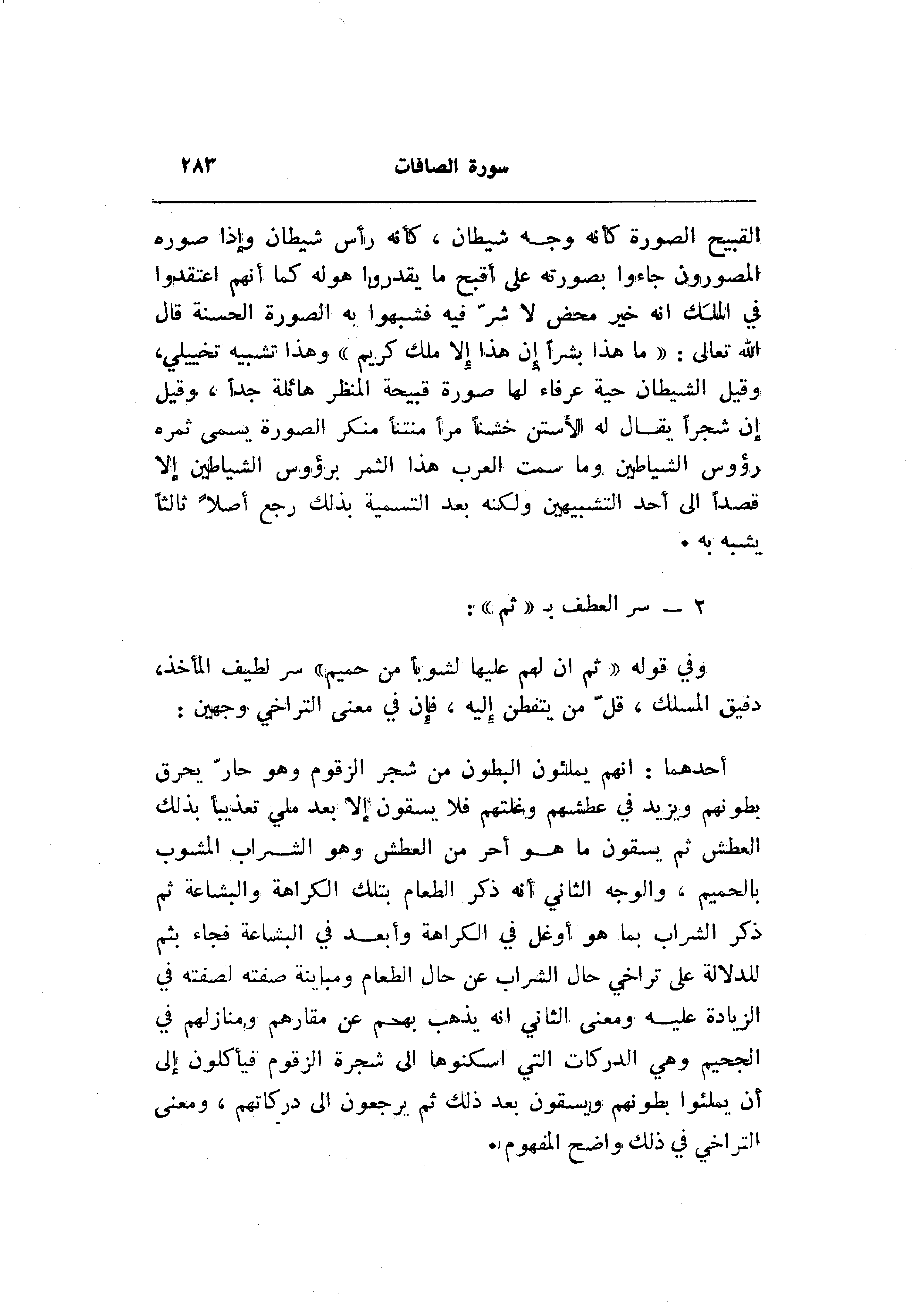 وفي قوله «ثم ان لهم عليها لشوبا من حميم» سر لطيف المأخذ، دقيق المسلك، قلّ من يتفطن إليه، فإن في معنى التراخي وجهين: