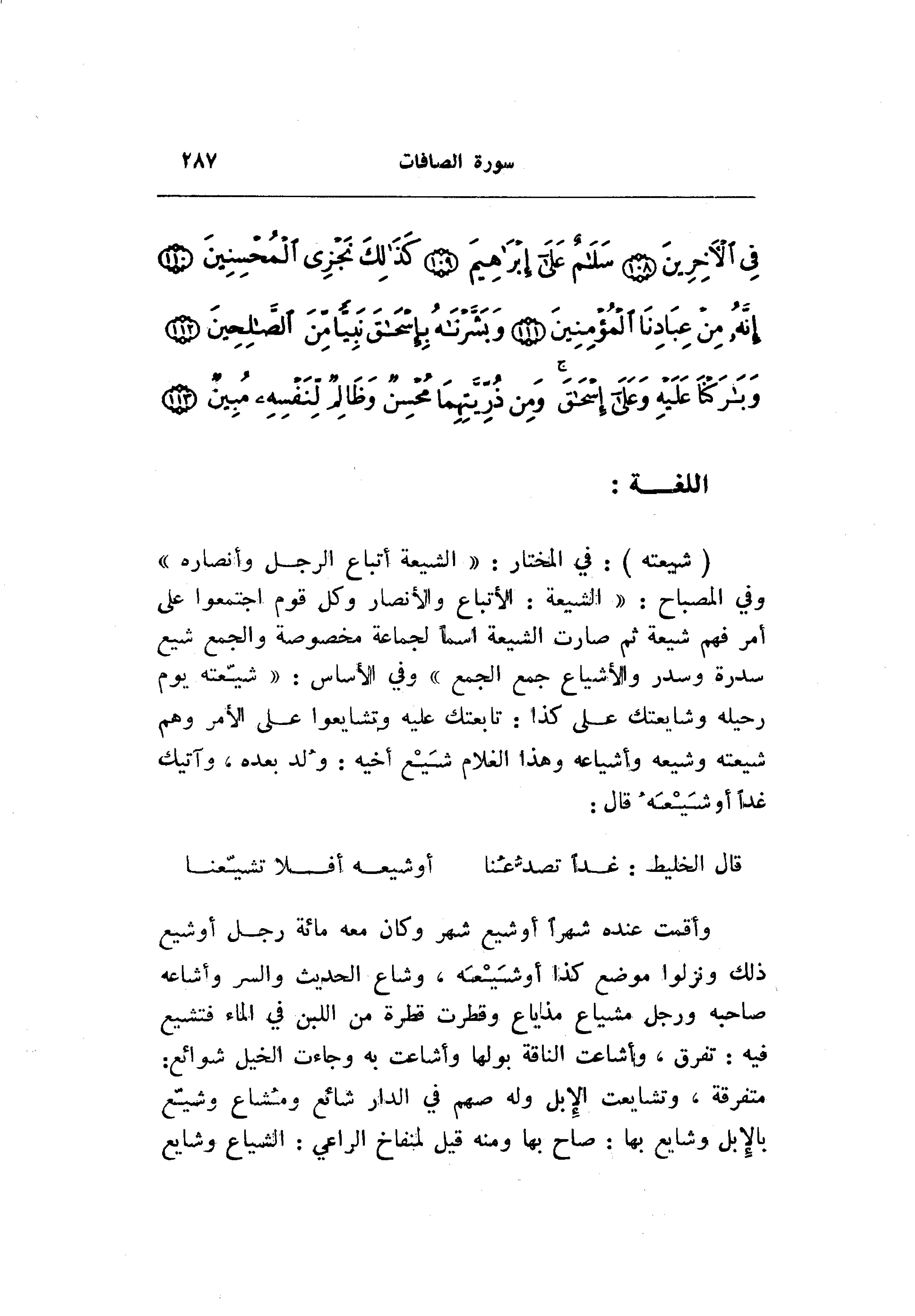 متفرقة، وتشايعت الإبل وله صهم في الدار شائع ومشاع وشيّع بالإبل وشايع بها: صاح بها ومنه قيل لنفاخ الراعي: الشياع وشايع