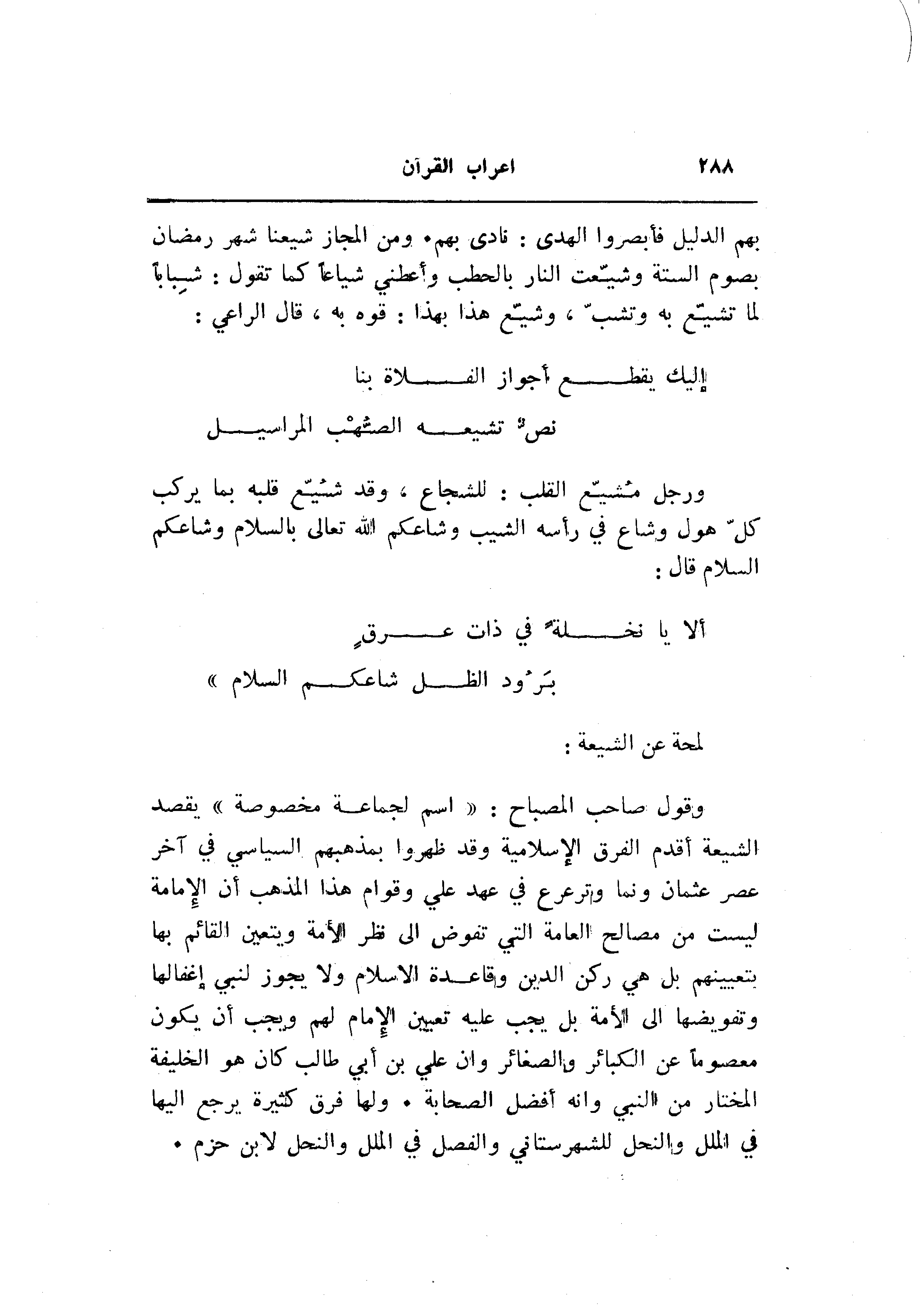 وقول صاحب المصباح: «اسم لجماعة مخصوصة» يقصد الشيعة أقدم الفرق الإسلامية وقد ظهروا بمذهبهم السياسي في آخر عصر عثمان ونما وترعرع في عهد علي وقوام هذا المذهب أن الإمامة ليست من مصالح العامة التي تفوض الى نظر الأمة ويتعين القائم بها بتعيينهم بل هي ركن الدين وقاعدة الإسلام ولا يجوز لنبي إغفالها وتفويضها الى الأمة بل يجب عليه تعيين الإمام لهم ويجب أن يكون معصوما عن الكبائر والصغائر وان علي بن أبي طالب كان هو الخليفة المختار من النبي وانه أفضل الصحابة. ولها فرق كثيرة يرجع إليها في الملل والنحل للشهرستاني والفصل في الملل والنحل لابن حزم.