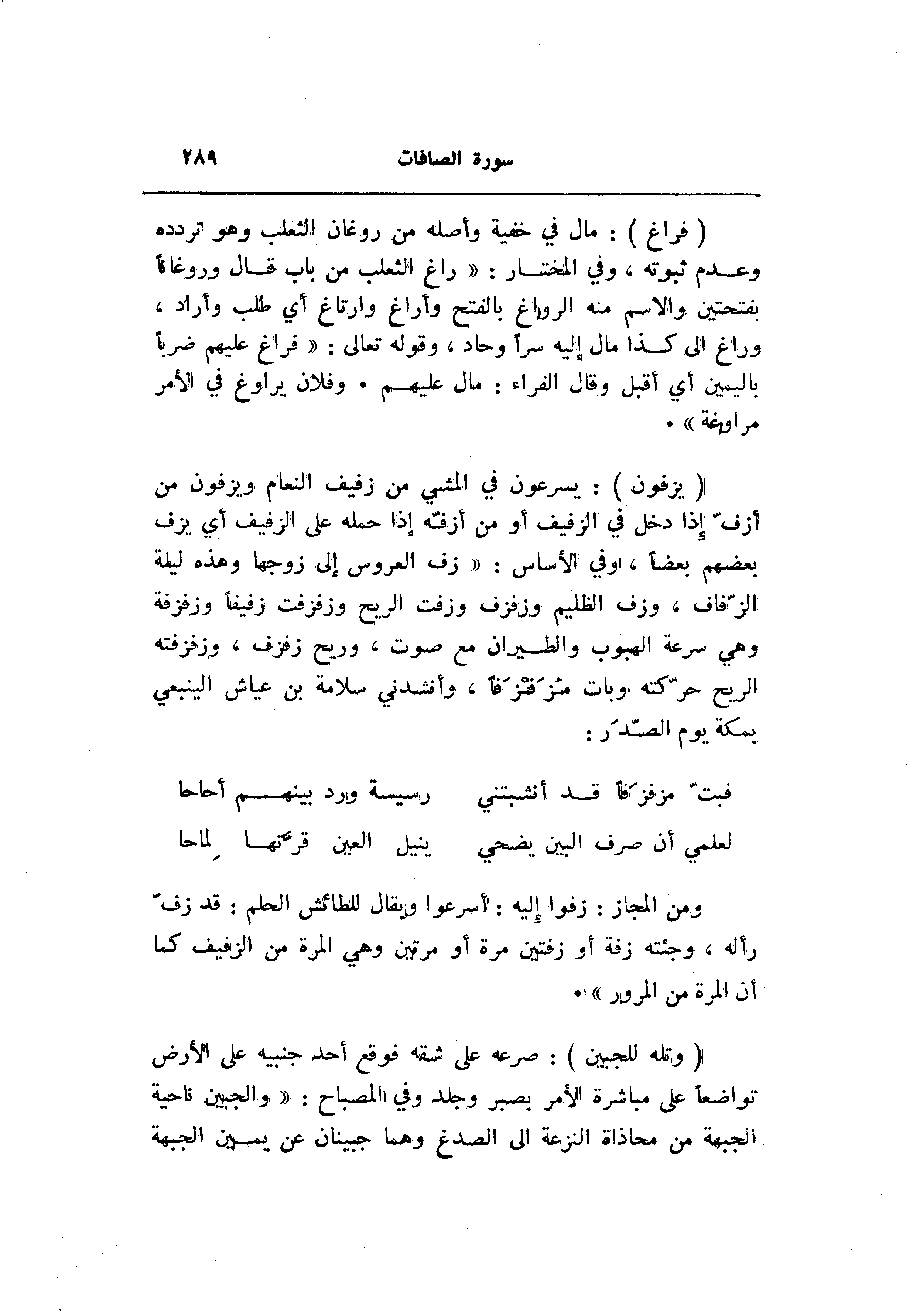 (يَزِفُّونَ) : يسرعون في المشي من زفيف النعام ويزفون من أزفّ إذا دخل في الزفيف أو من أزفّه إذا حمله على الزفيف أي يزف بعضهم بعضا، وفي الأساس: «زف العروس إلى زوجها وهذه ليلة الزّفاف، وزف الظليم وزفزف وزفت الريح وزفزفت زفيفا وزفزفة وهي سرعة الهبوب والطيران مع صوت، وريح زفزف، وزفزفته الريح حرّكته وبات مزفزفا، وأنشدني سلامة بن عياش الينبعي بمكة يوم الصّدر: