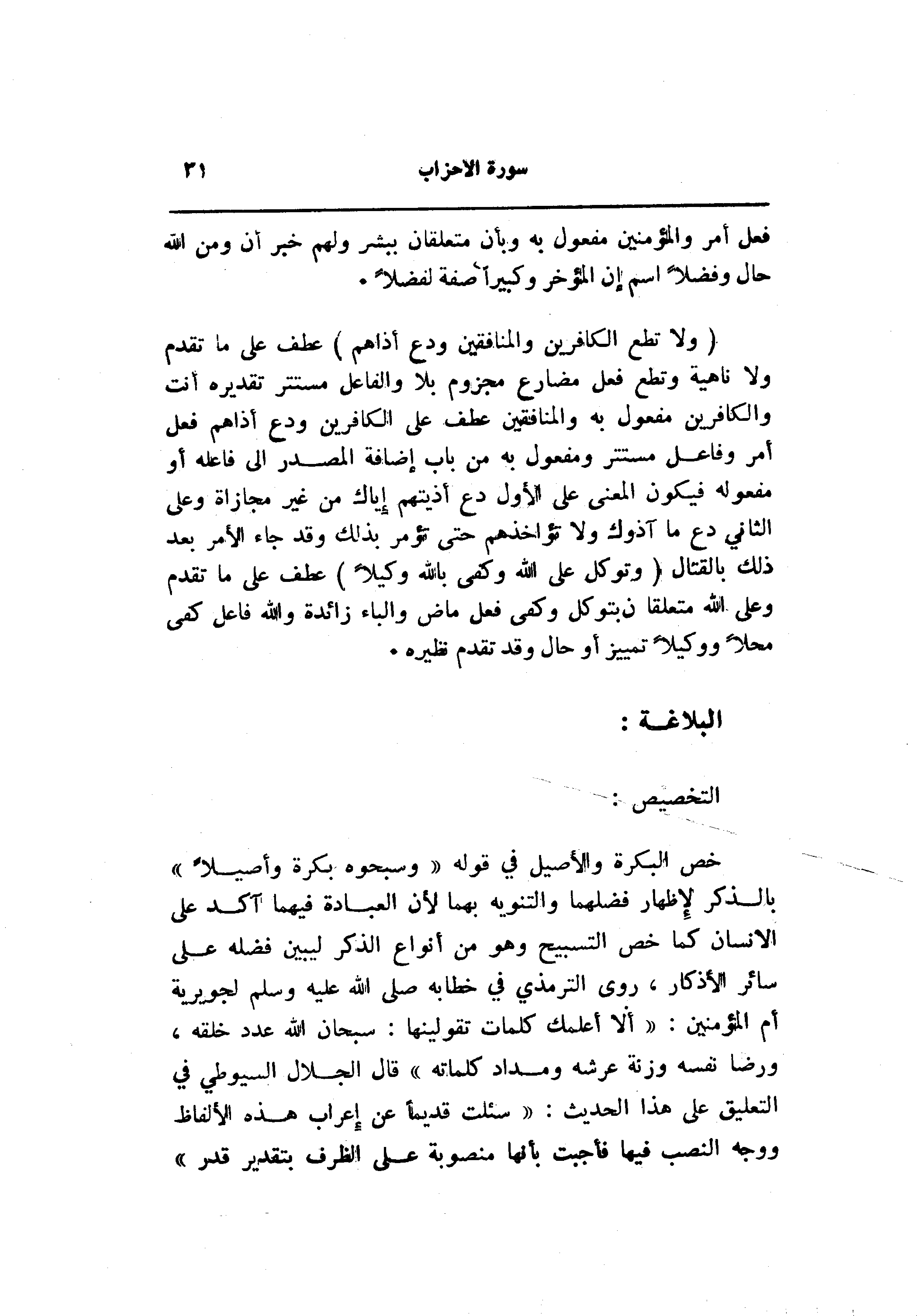 خص البكرة والأصيل في قوله «وسبحوه بكرة وأصيلا» بالذكر لإظهار فضلهما والتنويه بهما لأن العبادة فيهما آكد على الإنسان كما خص التسبيح وهو من أنواع الذكر ليبين فضله على سائر الأذكار، روى الترمذي في خطابه صلى الله عليه وسلم لجويرية أم المؤمنين: «ألا أعلمك كلمات تقولينها: سبحان الله عدد خلقه، ورضا نفسه وزنة عرشه ومداد كلماته» قال الجلال السيوطي في التعليق على هذا الحديث: «سئلت قديما عن إعراب هذه الألفاظ ووجه النصب فيها فأجبت بأنها منصوبة على الظرف بتقدير قدر»