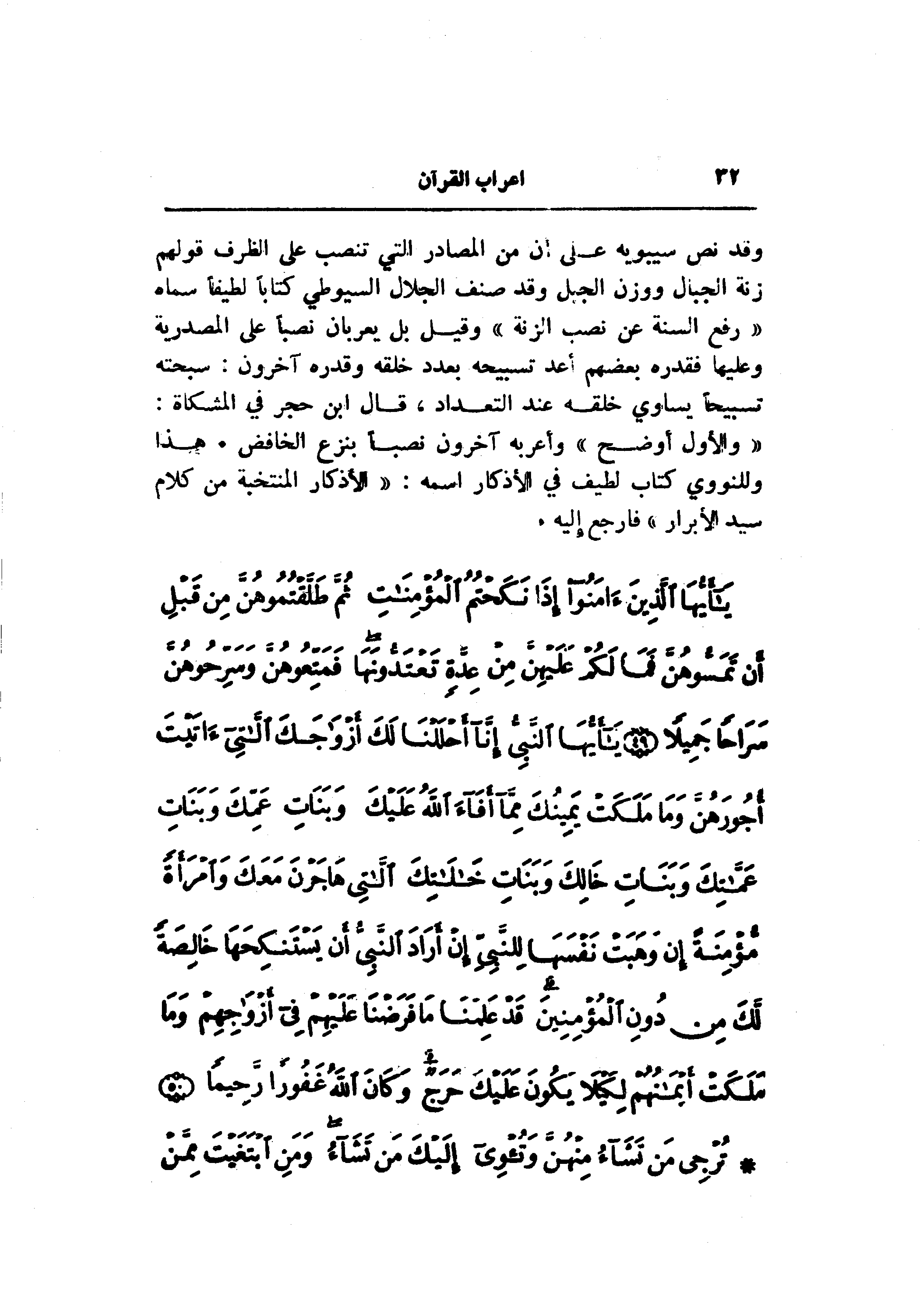 يا أَيُّهَا الَّذِينَ آمَنُوا إِذا نَكَحْتُمُ الْمُؤْمِناتِ ثُمَّ طَلَّقْتُمُوهُنَّ مِنْ قَبْلِ أَنْ تَمَسُّوهُنَّ فَما لَكُمْ عَلَيْهِنَّ مِنْ عِدَّةٍ تَعْتَدُّونَها فَمَتِّعُوهُنَّ وَسَرِّحُوهُنَّ سَراحاً جَمِيلاً (49) يا أَيُّهَا النَّبِيُّ إِنَّا أَحْلَلْنا لَكَ أَزْواجَكَ اللاَّتِي آتَيْتَ أُجُورَهُنَّ وَما مَلَكَتْ يَمِينُكَ مِمَّا أَفاءَ اللَّهُ عَلَيْكَ وَبَناتِ عَمِّكَ وَبَناتِ عَمَّاتِكَ وَبَناتِ خالِكَ وَبَناتِ خالاتِكَ اللاَّتِي هاجَرْنَ مَعَكَ وَامْرَأَةً مُؤْمِنَةً إِنْ وَهَبَتْ نَفْسَها لِلنَّبِيِّ إِنْ أَرادَ النَّبِيُّ أَنْ يَسْتَنْكِحَها خالِصَةً لَكَ مِنْ دُونِ الْمُؤْمِنِينَ قَدْ عَلِمْنا ما فَرَضْنا عَلَيْهِمْ فِي أَزْواجِهِمْ وَما مَلَكَتْ أَيْمانُهُمْ لِكَيْلا يَكُونَ عَلَيْكَ حَرَجٌ وَكانَ اللَّهُ غَفُوراً رَحِيماً (50) تُرْجِي مَنْ تَشاءُ مِنْهُنَّ وَتُؤْوِي إِلَيْكَ مَنْ تَشاءُ وَمَنِ ابْتَغَيْتَ مِمَّنْ عَزَلْتَ فَلا جُناحَ عَلَيْكَ ذلِكَ أَدْنى أَنْ تَقَرَّ أَعْيُنُهُنَّ وَلا يَحْزَنَّ وَيَرْضَيْنَ بِما آتَيْتَهُنَّ كُلُّهُنَّ وَاللَّهُ يَعْلَمُ ما فِي قُلُوبِكُمْ وَكانَ اللَّهُ عَلِيماً حَلِيماً (51) لا يَحِلُّ لَكَ النِّساءُ مِنْ بَعْدُ وَلا أَنْ تَبَدَّلَ بِهِنَّ مِنْ أَزْواجٍ وَلَوْ أَعْجَبَكَ حُسْنُهُنَّ إِلاَّ ما مَلَكَتْ يَمِينُكَ وَكانَ اللَّهُ عَلى كُلِّ شَيْءٍ رَقِيباً (52)