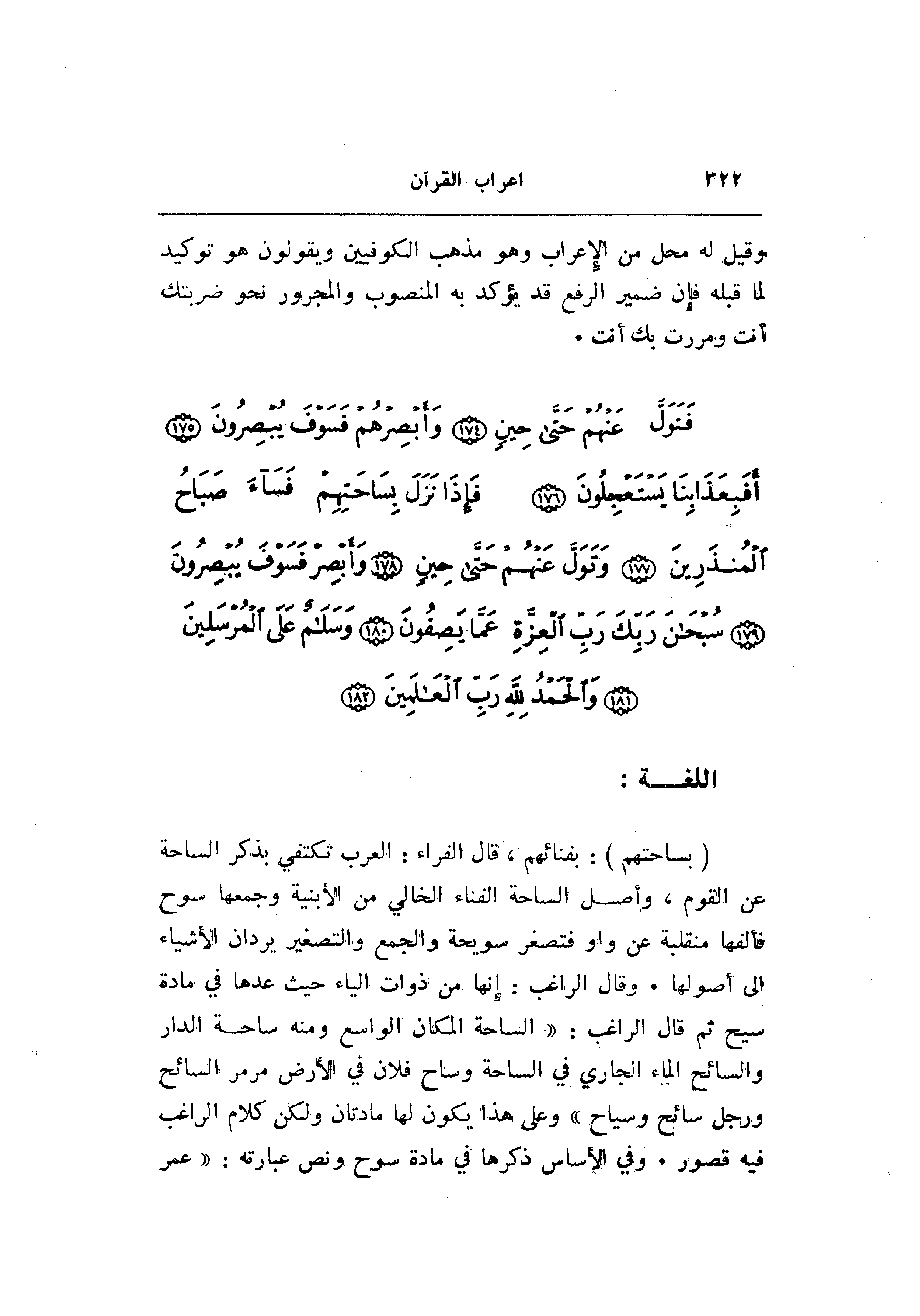 (بِساحَتِهِمْ) : بفنائهم، قال الفراء: العرب تكتفي بذكر الساحة عن القوم، وأصل الساحة الفناء الخالي من الأبنية وجمعها سوح فألفها منقلبة عن واو فتصغر سويحة والجمع والتصغير يردان الأشياء الى أصولها. وقال الراغب: إنها من ذوات الياء حيث عدها في مادة سيح ثم قال الراغب: «الساحة المكان الواسع ومنه ساحة الدار والسائح الماء الجاري في الساحة وساح فلان في الأرض مر مر السائح ورجل سائح وسياح» وعلى هذا يكون لها مادتان ولكن كلام الراغب فيه قصور. وفي الأساس ذكرها في مادة سوح ونص عبارته: «عمر