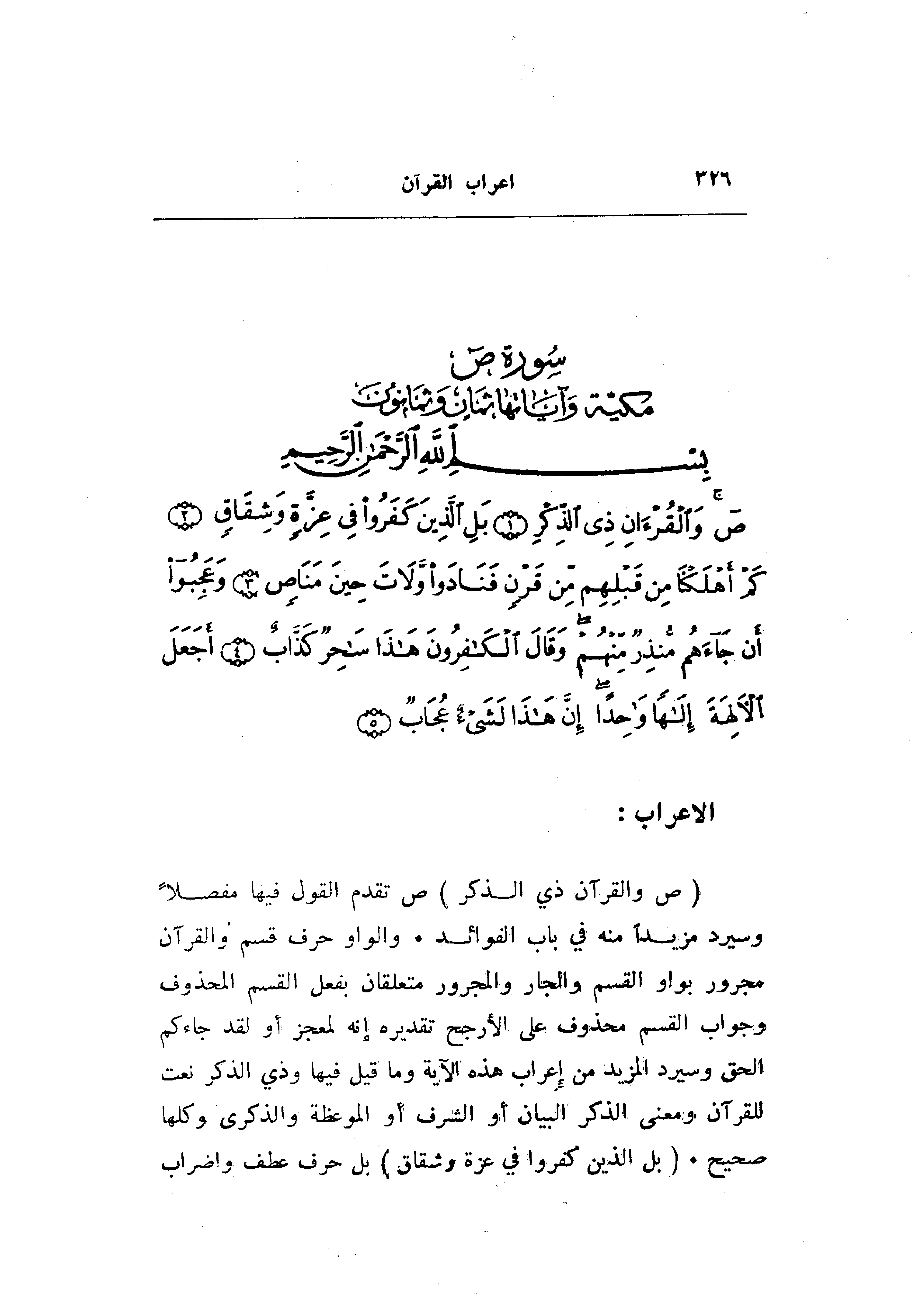 (ص وَالْقُرْآنِ ذِي الذِّكْرِ) ص تقدم القول فيها مفصلا وسيرد مزيدا منه في باب الفوائد. والواو حرف قسم والقرآن مجرور بواو القسم والجار والمجرور متعلقان بفعل القسم المحذوف وجواب القسم محذوف على الأرجح تقديره إنه لمعجز أو لقد جاءكم الحق وسيرد المزيد من إعراب هذه الآية وما قيل فيها وذي الذكر نعت للقرآن ومعنى الذكر البيان أو الشرف أو الموعظة والذكرى وكلها صحيح. (بَلِ الَّذِينَ كَفَرُوا فِي عِزَّةٍ وَشِقاقٍ) بل حرف عطف وإضراب