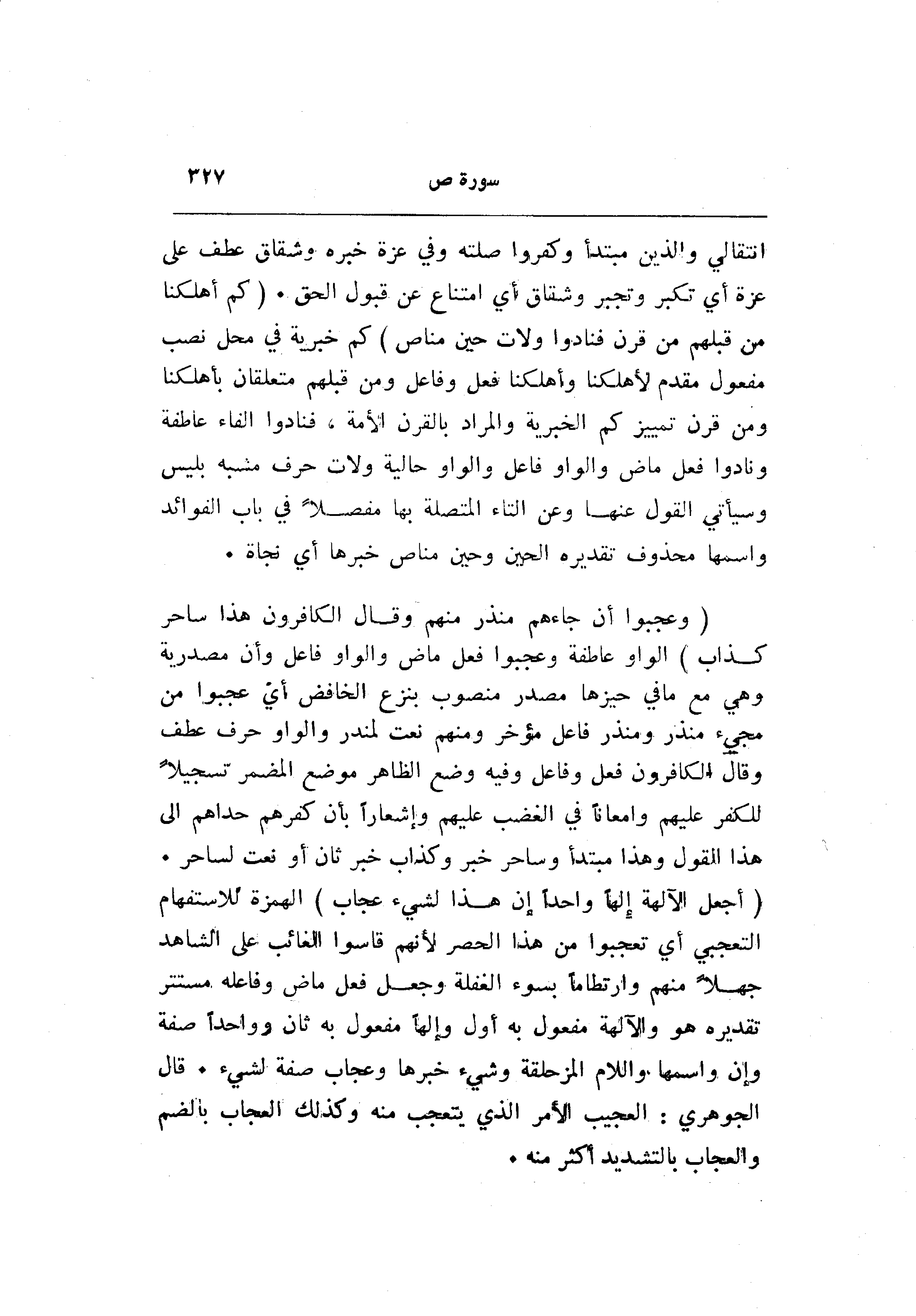 انتقالي والذين مبتدأ وكفروا صلته وفي عزة خبره وشقاق عطف على عزة أي تكبر وتجبر وشقاق أي امتناع عن قبول الحق. (كَمْ أَهْلَكْنا مِنْ قَبْلِهِمْ مِنْ قَرْنٍ فَنادَوْا وَلاتَ حِينَ مَناصٍ) كم خبرية في محل نصب مفعول مقدم لأهلكنا وأهلكنا فعل وفاعل ومن قبلهم متعلقان بأهلكنا ومن قرن تمييز كم الخبرية والمراد بالقرن الأمة، فنادوا الفاء عاطفة ونادوا فعل ماض والواو فاعل والواو حالية ولات حرف مشبه بليس وسيأتي القول عنها وعن التاء المتصلة بها مفصلا في باب الفوائد واسمها محذوف تقديره الحين وحين مناص خبرها أي نجاة.