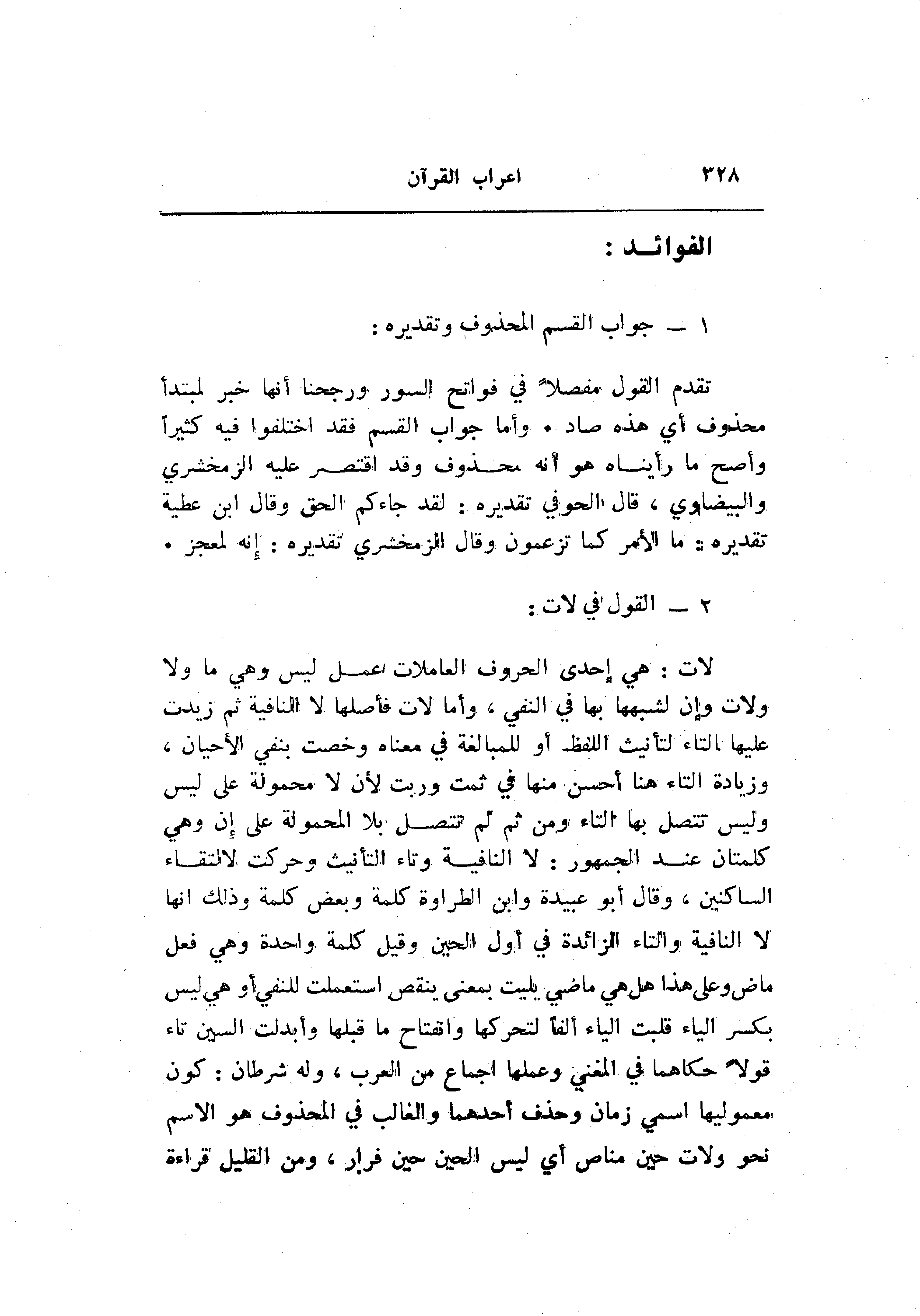 لات: هي إحدى الحروف العاملات عمل ليس وهي ما ولا ولات وإن لشبهها بها في النفي، وأما لات فأصلها لا النافية ثم زيدت عليها التاء لتأنيث اللفظ أو للمبالغة في معناه وخصت بنفي الأحيان، وزيادة التاء هنا أحسن منها في ثمت وربت لأن لا محمولة على ليس وليس تتصل بها التاء ومن ثم لم تتصل بلا المحمولة على إن وهي كلمتان عند الجمهور: لا النافية وتاء التأنيث وحركت لالتقاء الساكنين، وقال أبو عبيدة وابن الطراوة كلمة وبعض كلمة وذلك انها لا النافية والتاء الزائدة في أول الحين وقيل كلمة واحدة وهي فعل ماض وعلى هذا هل هي ماضي يليت بمعنى ينقص استعملت للنفي أو هي ليس بكسر الياء قلبت الياء ألفا لتحركها وانفتاح ما قبلها وأبدلت السين تاء قولا حكاهما في المغني وعملها إجماع من العرب، وله شرطان: كون معموليها اسمي زمان وحذف أحدهما والغالب في المحذوف هو الاسم نحو ولات حين مناص أي ليس الحين حين فرار، ومن القليل قراءة