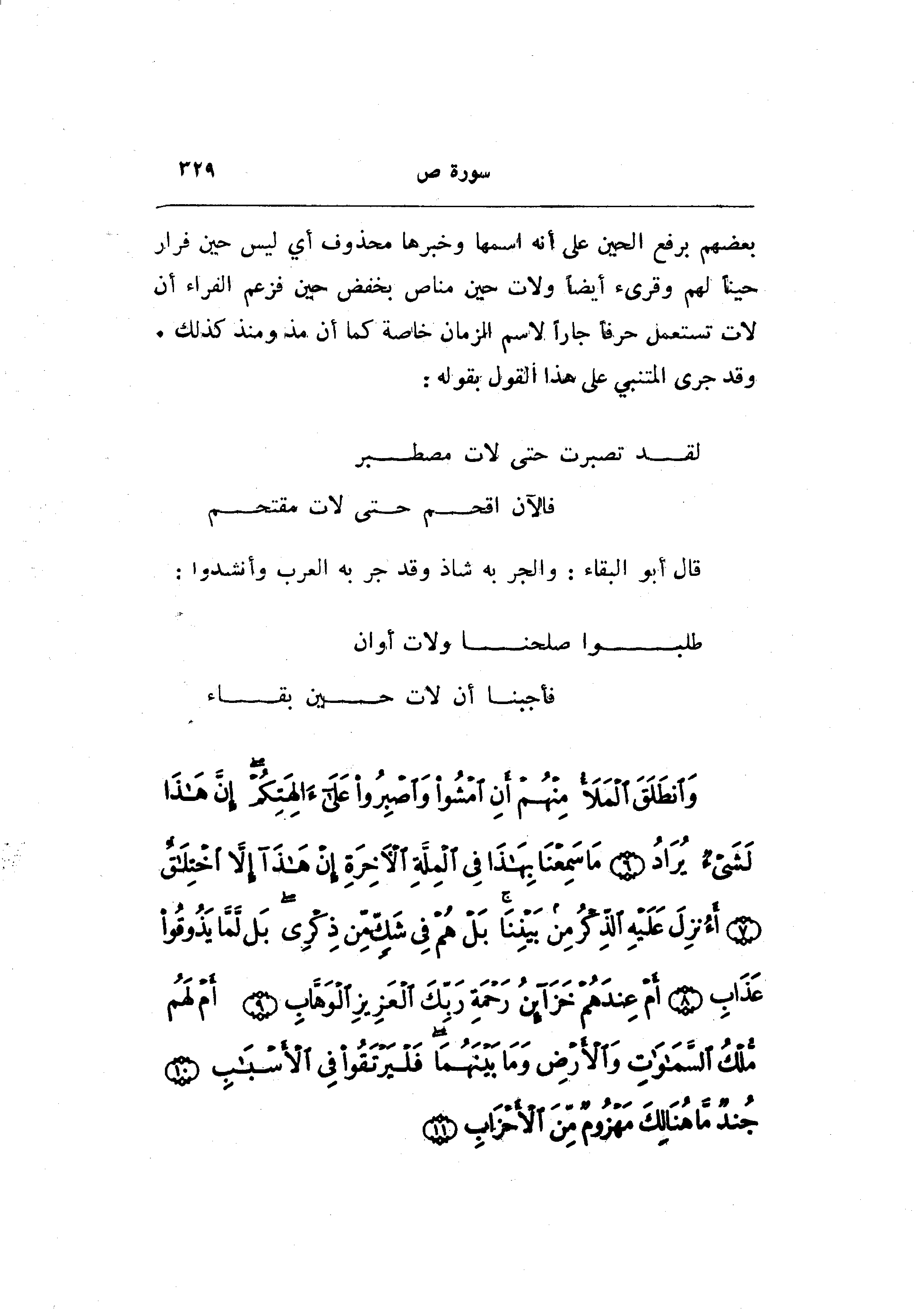بعضهم برفع الحين على أنه اسمها وخبرها محذوف أي ليس حين فرار حينا لهم وقرىء أيضا ولات حين مناص بخفض حين فزعم الفراء أن لات تستعمل حرفا جارا لاسم الزمان خاصة كما أن مذ ومنذ كذلك.