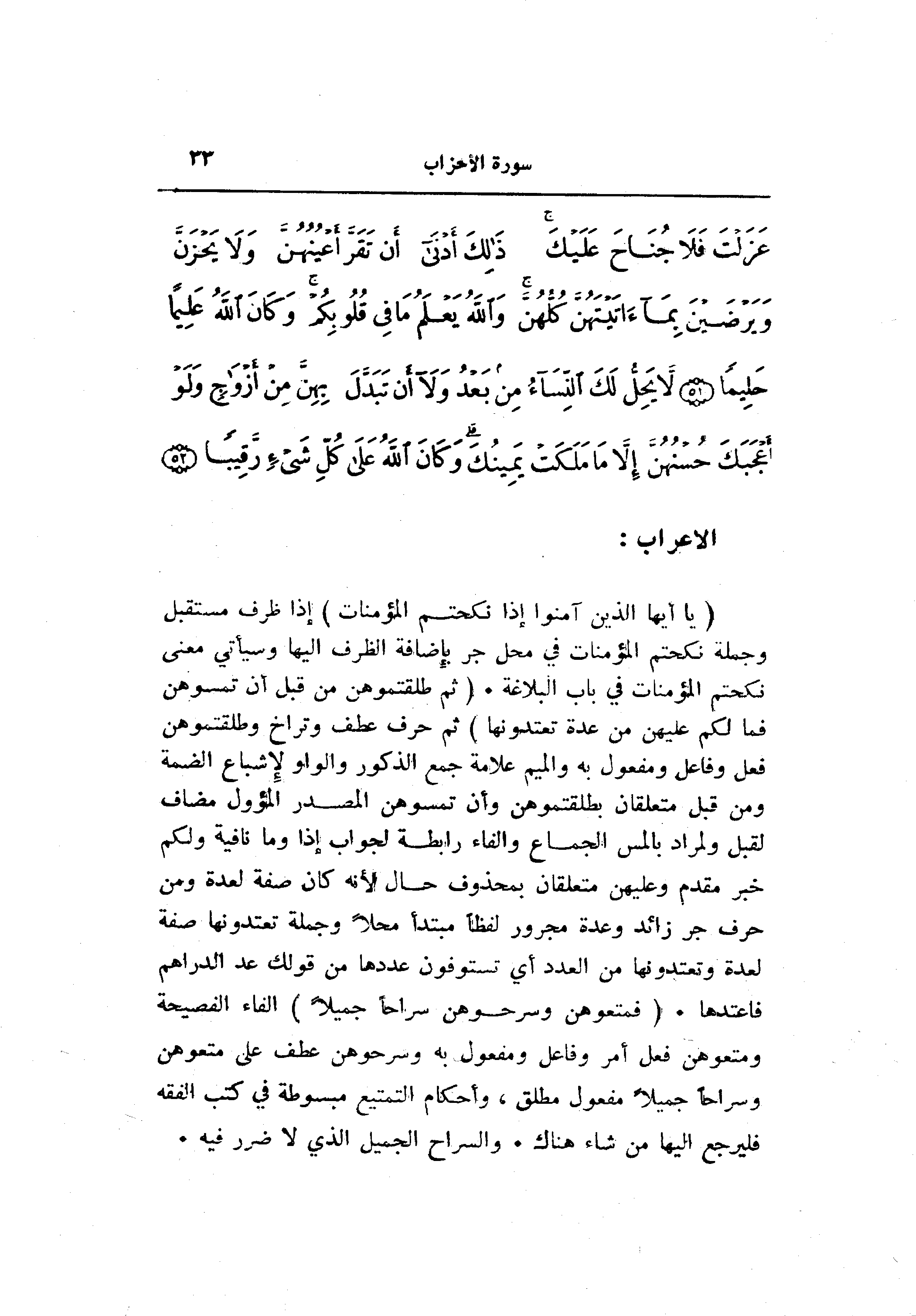 (يا أَيُّهَا الَّذِينَ آمَنُوا إِذا نَكَحْتُمُ الْمُؤْمِناتِ) إذا ظرف مستقبل وجملة نكحتم المؤمنات في محل جر بإضافة الظرف إليها وسيأتي معنى نكحتم المؤمنات في باب البلاغة. (ثُمَّ طَلَّقْتُمُوهُنَّ مِنْ قَبْلِ أَنْ تَمَسُّوهُنَّ فَما لَكُمْ عَلَيْهِنَّ مِنْ عِدَّةٍ تَعْتَدُّونَها) ثم حرف عطف وتراخ وطلقتموهن فعل وفاعل ومفعول به والميم علامة جمع الذكور والواو لإشباع الضمة ومن قبل متعلقان بطلقتموهن وأن تمسوهن المصدر المؤول مضاف لقبل ولمراد بالمس الجماع والفاء رابطة لجواب إذا وما نافية ولكم خبر مقدم وعليهن متعلقان بمحذوف حال لأنه كان صفة لعدة ومن حرف جر زائد وعدة مجرور لفظا مبتدأ محلا وجملة تعتدونها صفة لعدة وتعتدونها من العدد أي تستوفون عددها من قولك عد الدراهم فاعتدها. (فَمَتِّعُوهُنَّ وَسَرِّحُوهُنَّ سَراحاً جَمِيلًا) الفاء الفصيحة ومتعوهن فعل أمر وفاعل ومفعول به وسرحوهن عطف على متعوهن وسراحا جميلا مفعول مطلق، وأحكام التمتيع مبسوطة في كتب الفقه فليرجع إليها من شاء هناك. والسراح الجميل الذي لا ضرر فيه.
