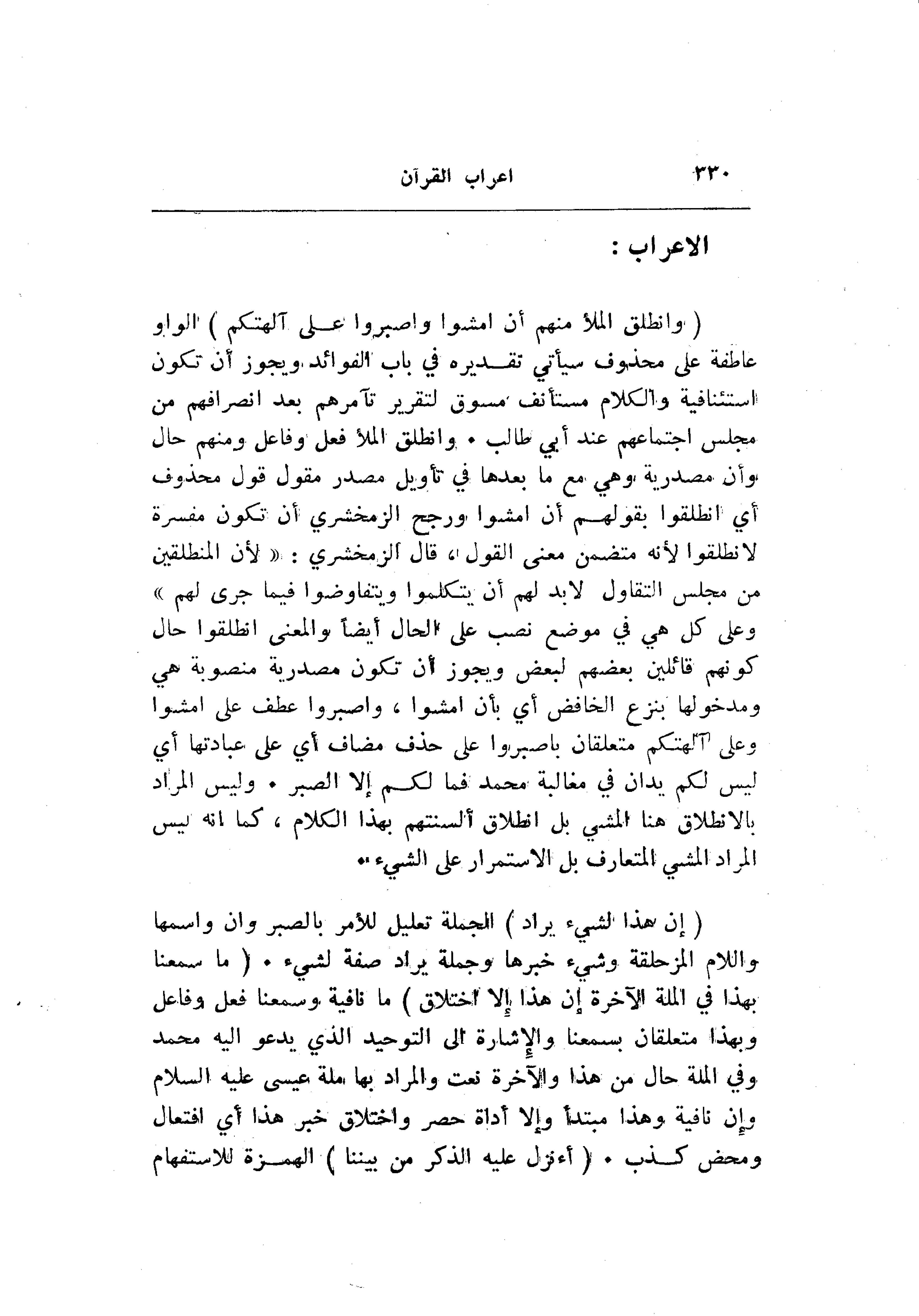 (وَانْطَلَقَ الْمَلَأُ مِنْهُمْ أَنِ امْشُوا وَاصْبِرُوا عَلى آلِهَتِكُمْ) الواو عاطفة على محذوف سيأتي تقديره في باب الفوائد ويجوز أن تكون استئنافية والكلام مستأنف مسوق لتقرير تآمرهم بعد انصرافهم من مجلس اجتماعهم عند أبي طالب. وانطلق الملا فعل وفاعل ومنهم حال وأن مصدرية وهي مع ما بعدها في تأويل مصدر مقول قول محذوف أي انطلقوا بقولهم أن امشوا ورجح الزمخشري أن تكون مفسرة لانطلقوا لأنه متضمن معنى القول، قال الزمخشري: «لأن المنطلقين من مجلس التقاول لا بد لهم أن يتكلموا ويتفاوضوا فيما جرى لهم» وعلى كل هي في موضع نصب على الحال أيضا والمعنى انطلقوا حال كونهم قائلين بعضهم لبعض ويجوز أن تكون مصدرية منصوبة هي ومدخولها بنزع الخافض أي بأن امشوا، واصبروا عطف على امشوا وعلى آلهتكم متعلقان باصبروا على حذف مضاف أي على عبادتها أي ليس لكم يدان في مغالبة محمد فما لكم إلا الصبر. وليس المراد بالانطلاق هنا المشي بل انطلاق ألسنتهم بهذا الكلام، كما انه ليس المراد المشي المتعارف بل الاستمرار على الشيء.