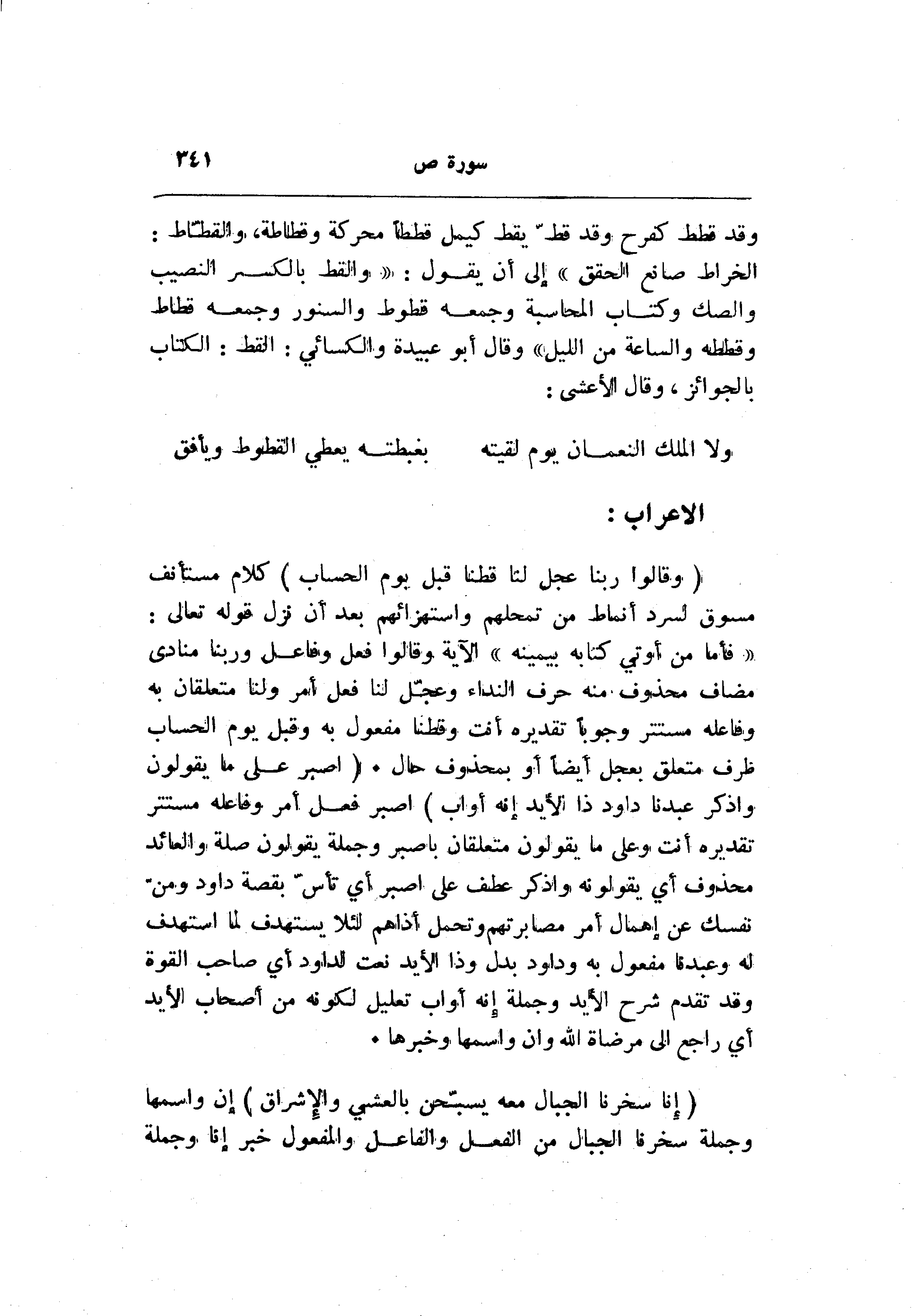 «فأما من أوتي كتابه بيمينه» الآية وقالوا فعل وفاعل وربنا منادى مضاف محذوف منه حرف النداء وعجّل لنا فعل أمر ولنا متعلقان به وفاعله مستتر وجوبا تقديره أنت وقطنا مفعول به وقبل يوم الحساب ظرف متعلق بعجل أيضا أو بمحذوف حال. (اصْبِرْ عَلى ما يَقُولُونَ وَاذْكُرْ عَبْدَنا داوُدَ ذَا الْأَيْدِ إِنَّهُ أَوَّابٌ) اصبر فعل أمر وفاعله مستتر تقديره أنت وعلى ما يقولون متعلقان باصبر وجملة يقولون صلة والعائد محذوف أي يقولونه واذكر عطف على اصبر أي تأس بقصة داود ومنّ نفسك عن إهمال أمر مصابرتهم وتحمل أذاهم لئلا يستهدف لما استهدف له وعبدنا مفعول به وداود بدل وذا الأيد نعت لداود أي صاحب القوة وقد تقدم شرح الأيد وجملة إنه أواب تعليل لكونه من أصحاب الأيد أي راجع الى مرضاة الله وان واسمها وخبرها.