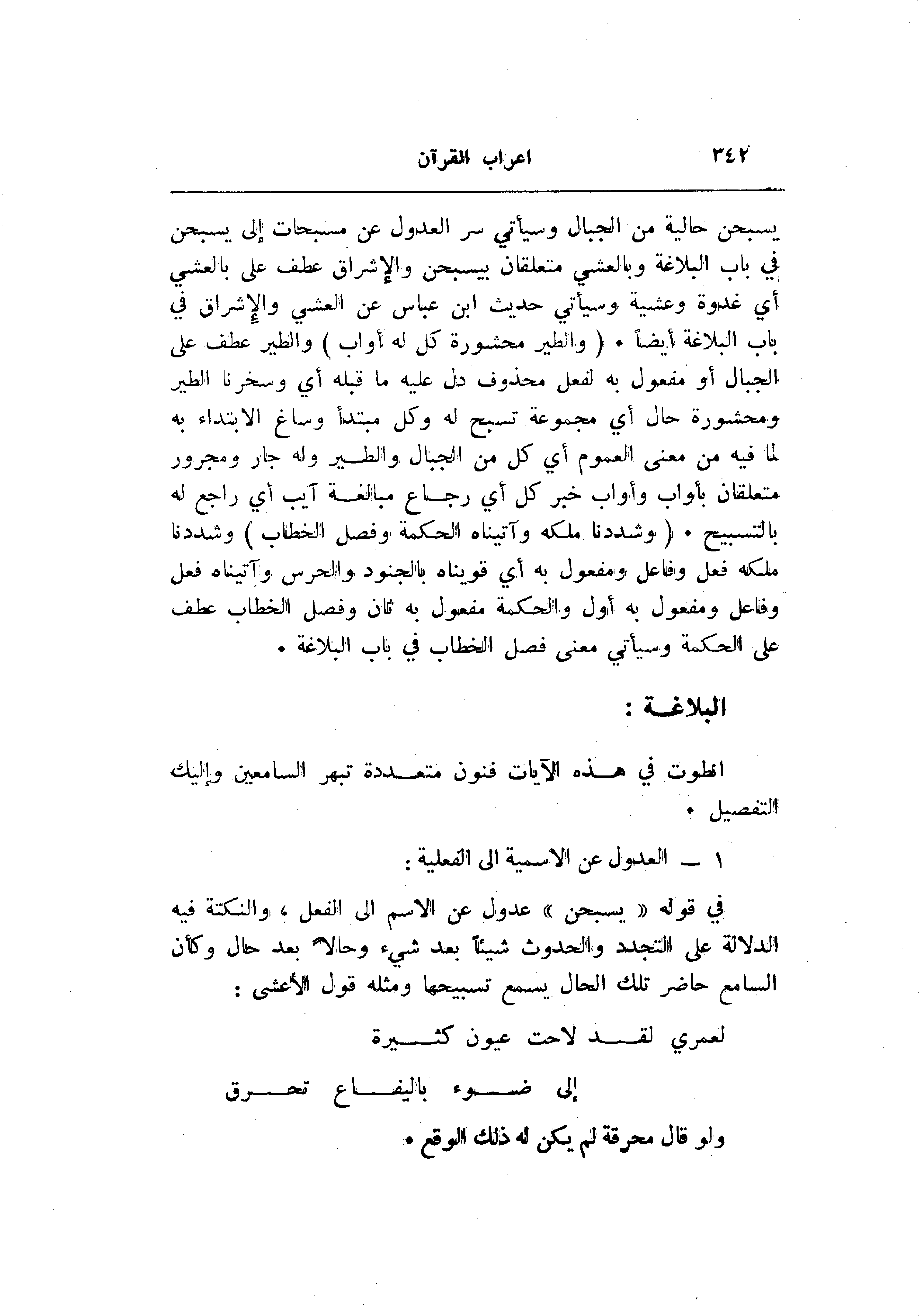 يسبحن حالية من الجبال وسيأتي سر العدول عن مسبحات إلى يسبحن في باب البلاغة وبالعشي متعلقان بيسبحن والإشراق عطف على بالعشي أي غدوة وعشية وسيأتي حديث ابن عباس عن العشي والإشراق في باب البلاغة أيضا. (وَالطَّيْرَ مَحْشُورَةً كُلٌّ لَهُ أَوَّابٌ) والطير عطف على الجبال أو مفعول به لفعل محذوف دل عليه ما قبله أي وسخرنا الطير ومحشورة حال أي مجموعة تسبح له وكل مبتدأ وساغ الابتداء به لما فيه من معنى العموم أي كل من الجبال والطير وله جار ومجرور متعلقان بأواب وأواب خبر كل أي رجاع مبالغة آئب أي راجع له بالتسبيح. (وَشَدَدْنا مُلْكَهُ وَآتَيْناهُ الْحِكْمَةَ وَفَصْلَ الْخِطابِ) وشددنا ملكه فعل وفاعل ومفعول به أي قويناه بالجنود والحرس وآتيناه فعل وفاعل ومفعول به أول والحكمة مفعول به ثان وفصل الخطاب عطف على الحكمة وسيأتي معنى فصل الخطاب في باب البلاغة.