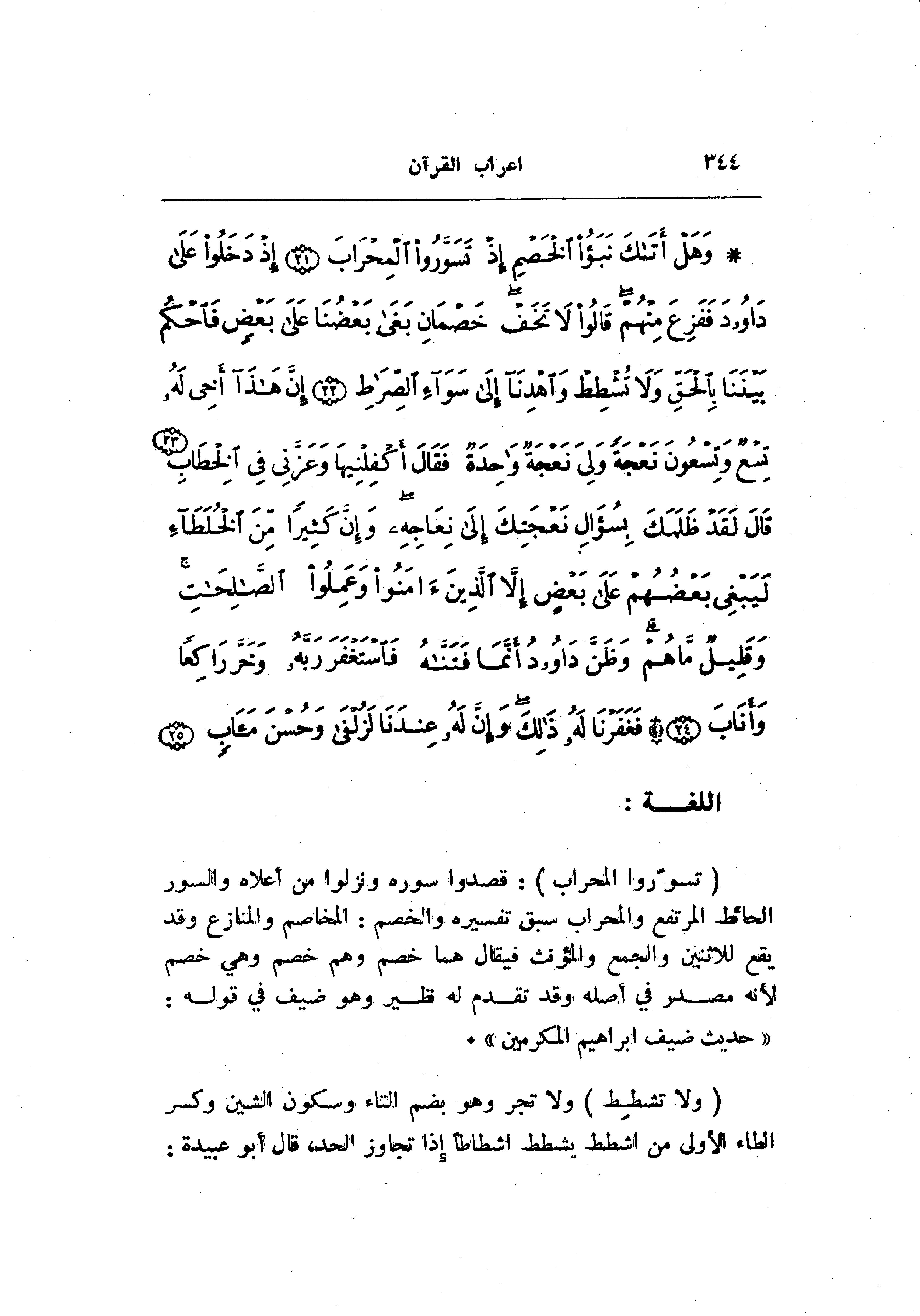 (تَسَوَّرُوا الْمِحْرابَ) : قصدوا سوره ونزلوا من أعلاه والسور الحائط المرتفع والمحراب سبق تفسيره والخصم: المخاصم والمنازع وقد يقع للاثنين والجمع والمؤنث فيقال هما خصم وهم خصم وهي خصم لأنه مصدر في أصله وقد تقدم له نظير وهو ضيف في قوله: