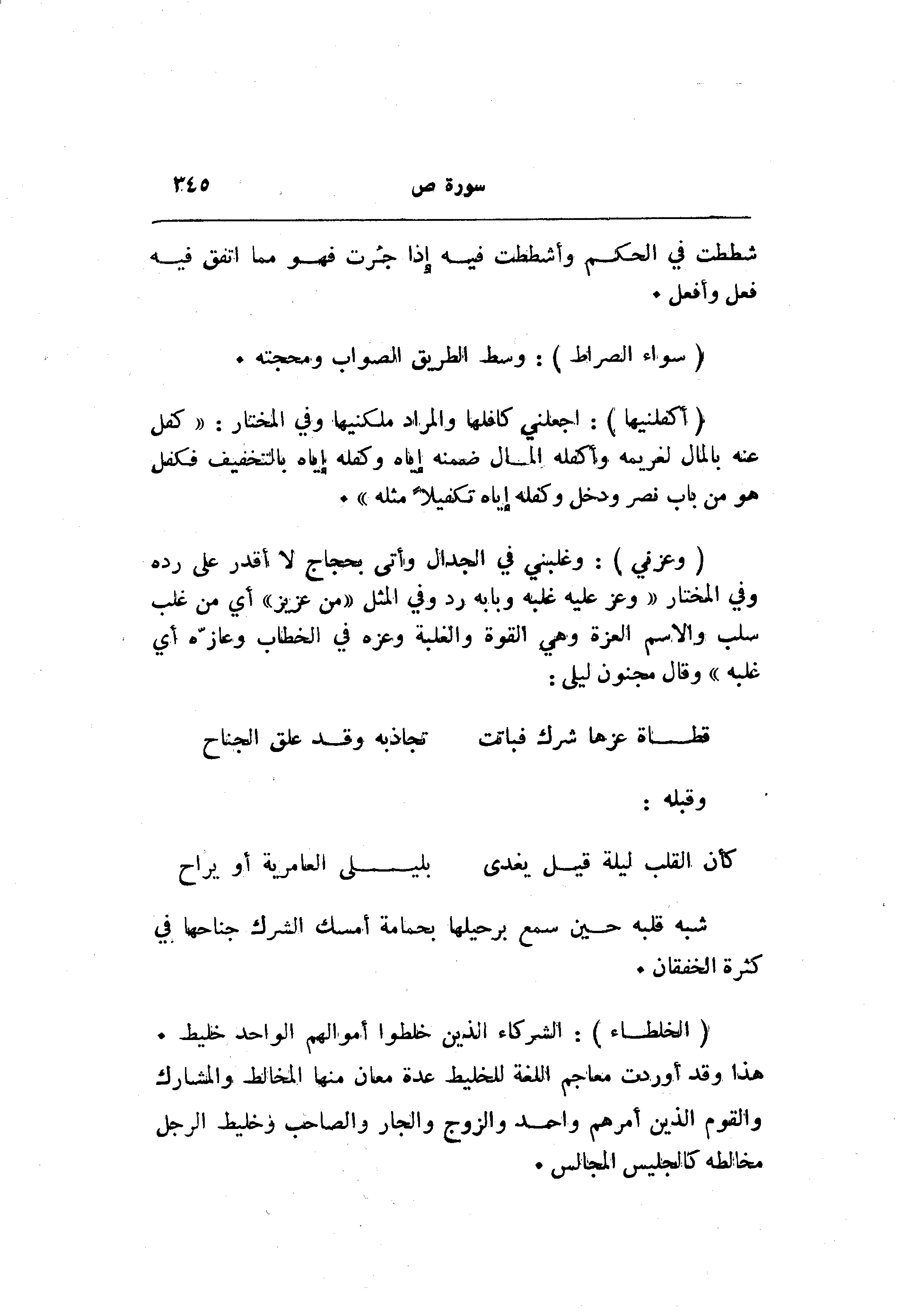 (وَعَزَّنِي) : وغلبني في الجدال وأتى بحجاج لا أقدر على رده وفي المختار «وعز عليه غلبه وبابه رد وفي المثل «من عزيز» أي من غلب سلب والاسم العزة وهي القوة والغلبة وعزه في الخطاب وعازّه أي غلبه» وقال مجنون ليلى: