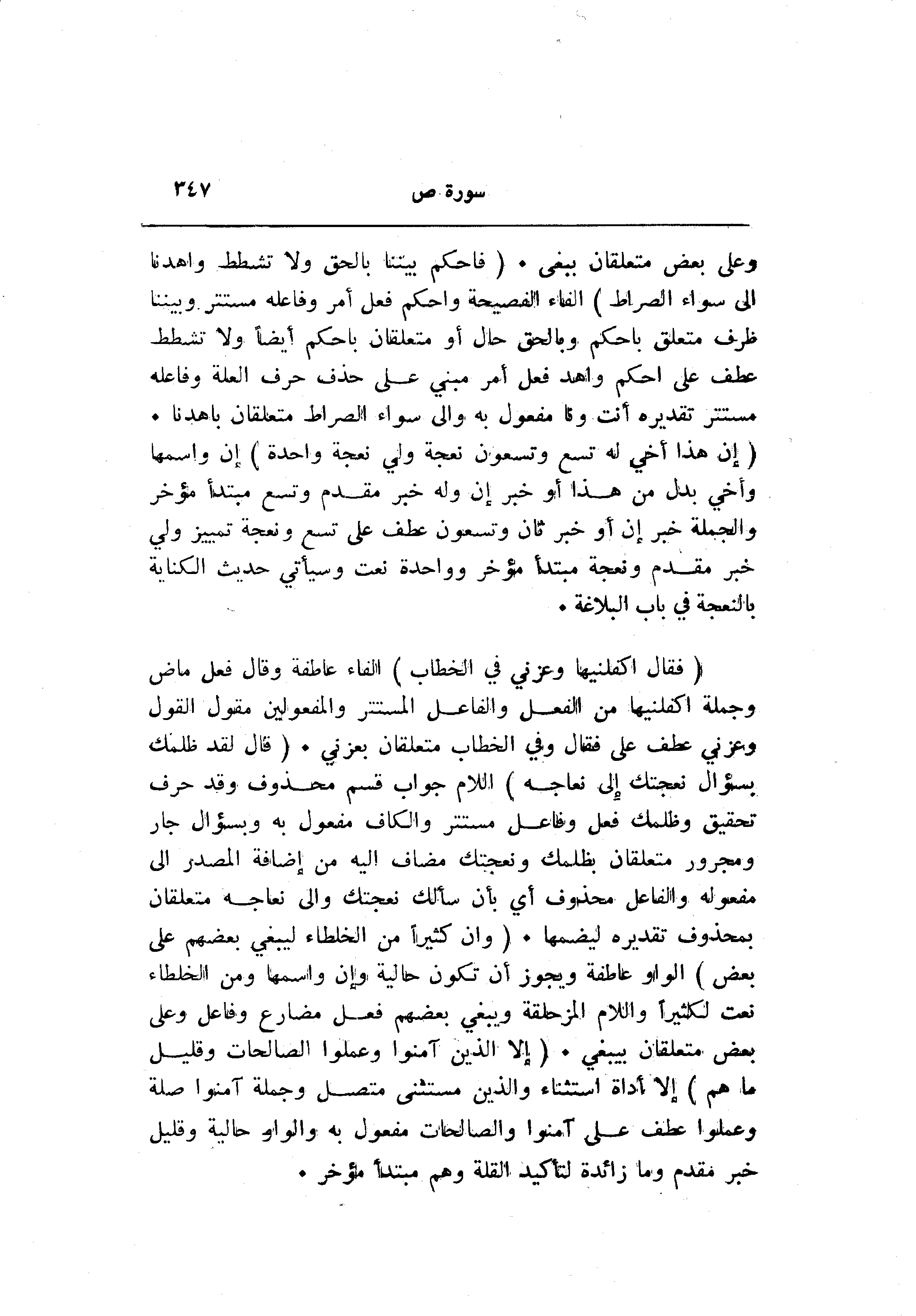 (فَقالَ أَكْفِلْنِيها وَعَزَّنِي فِي الْخِطابِ) الفاء عاطفة وقال فعل ماض وجملة أكفلنيها من الفعل والفاعل المستتر والمفعولين مقول القول وعزني عطف على فقال وفي الخطاب متعلقان بعزني. (قالَ لَقَدْ ظَلَمَكَ بِسُؤالِ نَعْجَتِكَ إِلى نِعاجِهِ) اللام جواب قسم محذوف وقد حرف تحقيق وظلمك فعل وفاعل مستتر والكاف مفعول به وبسؤال جار ومجرور متعلقان بظلمك ونعجتك مضاف اليه من إضافة المصدر الى مفعوله والفاعل محذوف أي بأن سألك نعجتك والى نعاجه متعلقان بمحذوف تقديره ليضمها. (وَإِنَّ كَثِيراً مِنَ الْخُلَطاءِ لَيَبْغِي بَعْضُهُمْ عَلى بَعْضٍ) الواو عاطفة ويجوز أن تكون حالية وإن واسمها ومن الخلطاء نعت لكثيرا واللام المزحلقة ويبغي بعضهم فعل مضارع وفاعل وعلى بعض متعلقان بيبغي. (إِلَّا الَّذِينَ آمَنُوا وَعَمِلُوا الصَّالِحاتِ وَقَلِيلٌ ما هُمْ) إلا أداة استثناء والذين مستثنى متصل وجملة آمنوا صلة وعملوا عطف على آمنوا والصالحات مفعول به والواو حالية وقليل خبر مقدم وما زائدة لتأكيد القلة وهم مبتدأ مؤخر.