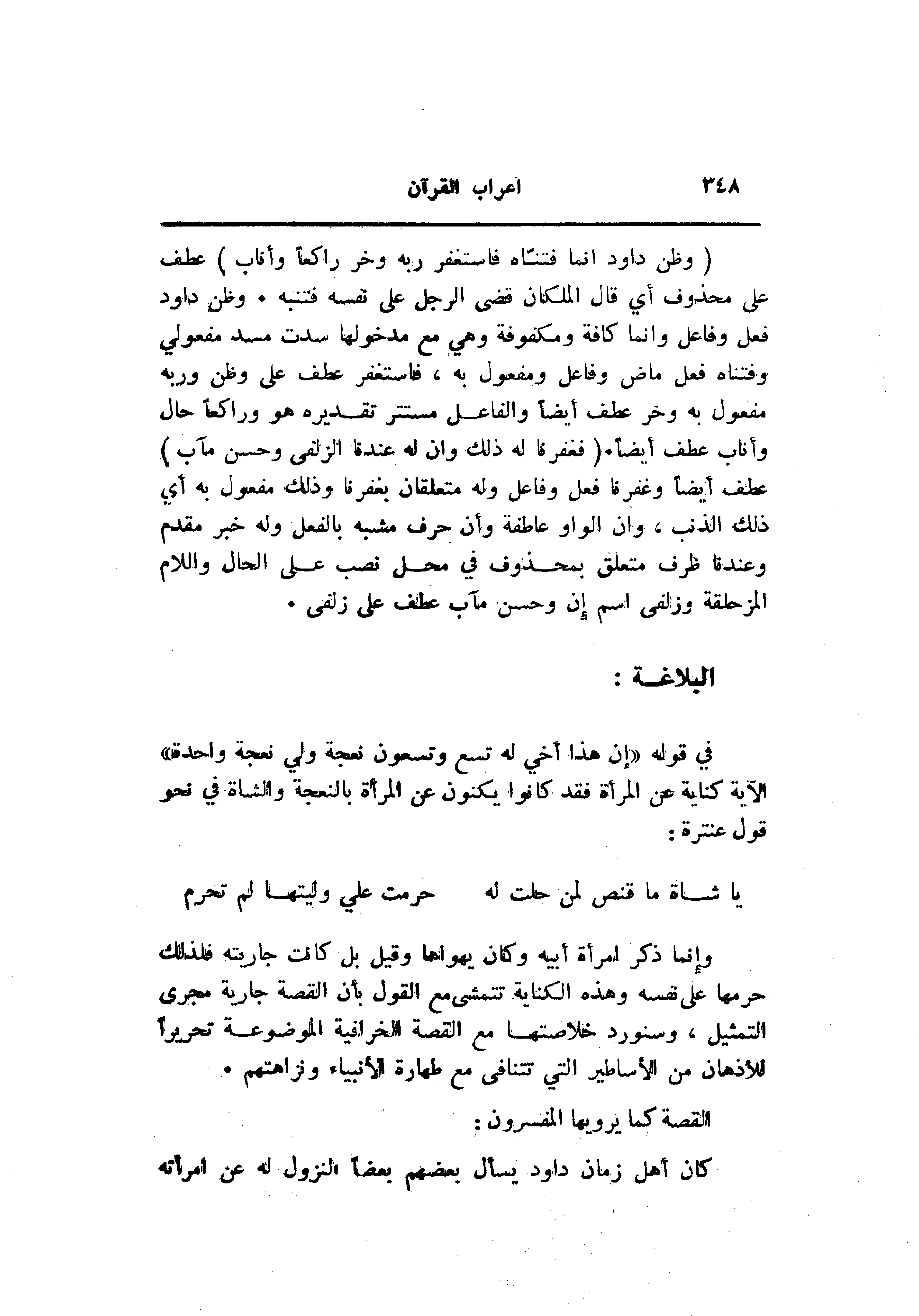 (وَظَنَّ داوُدُ أَنَّما فَتَنَّاهُ فَاسْتَغْفَرَ رَبَّهُ وَخَرَّ راكِعاً وَأَنابَ) عطف على محذوف أي قال الملكان قضى الرجل على نفسه فتنبه. وظن داود فعل وفاعل وانما كافة ومكفوفة وهي مع مدخولها سدت مسد مفعولي وفتناه فعل ماض وفاعل ومفعول به، فاستغفر عطف على وظن وربه مفعول به وخر عطف أيضا والفاعل مستتر تقديره هو وراكعا حال وأناب عطف أيضا. (فَغَفَرْنا لَهُ ذلِكَ وَإِنَّ لَهُ عِنْدَنا لَزُلْفى وَحُسْنَ مَآبٍ) عطف أيضا وغفرنا فعل وفاعل وله متعلقان بغفرنا وذلك مفعول به أي ذلك الذنب، وان الواو عاطفة وأن حرف مشبه بالفعل وله خبر مقدم وعندنا ظرف متعلق بمحذوف في محل نصب على الحال واللام المزحلقة وزلفى اسم إن وحسن مآب عطف على زلفى.
