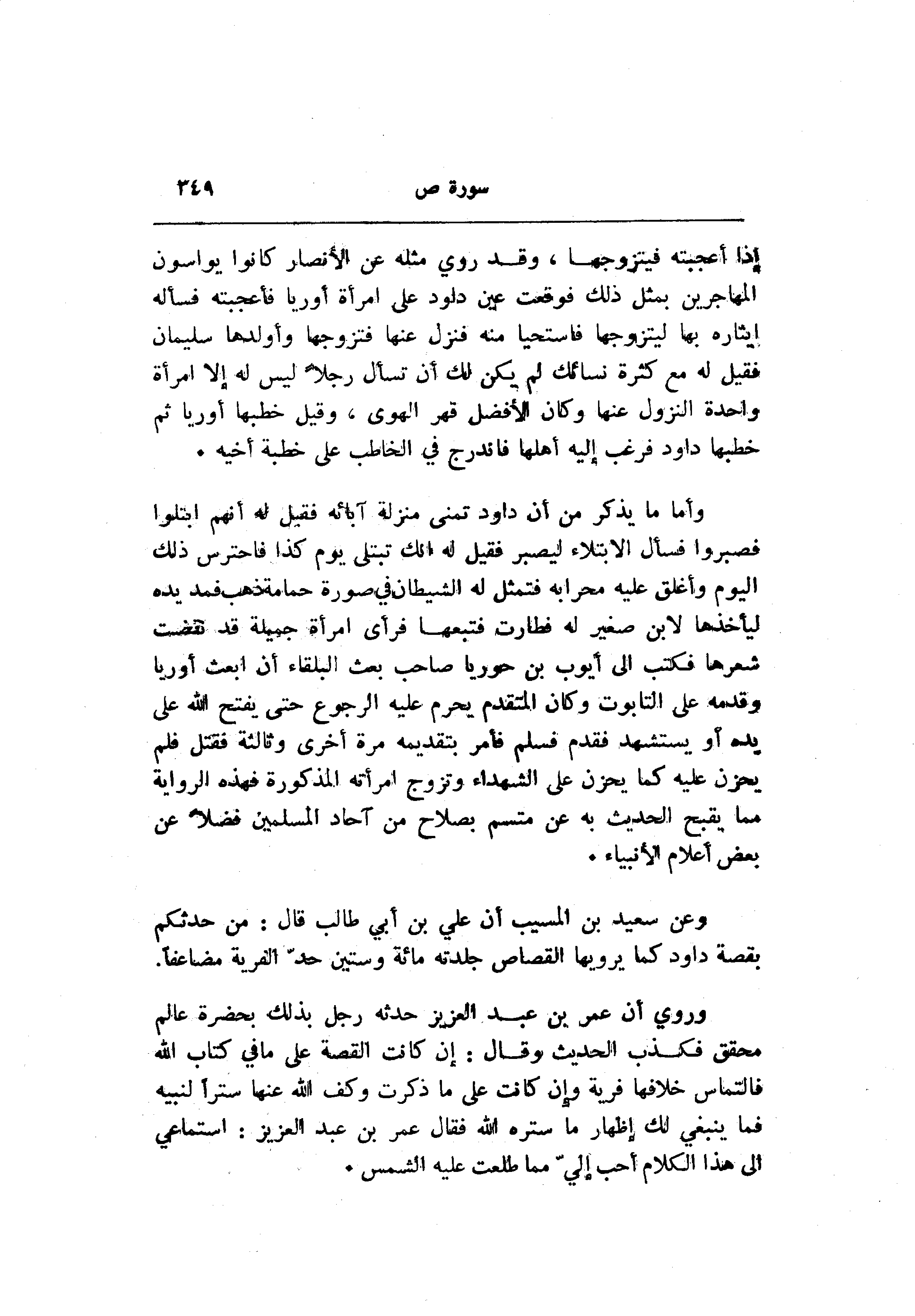 إذا أعجبته فيتزوجها، وقد روي مثله عن الأنصار كانوا يواسون المهاجرين بمثل ذلك فوقعت عين داود على امرأة أوريا فأعجبته فسأله إيثاره بها ليتزوجها فاستحيا منه فنزل عنها فتزوجها وأولدها سليمان فقيل له مع كثرة نسائك لم يكن لك أن تسأل رجلا ليس له إلا امرأة واحدة النزول عنها وكان الأفضل قهر الهوى، وقيل خطبها أوريا ثم خطبها داود فرغب إليه أهلها فاندرج في الخاطب على خطبة أخيه.