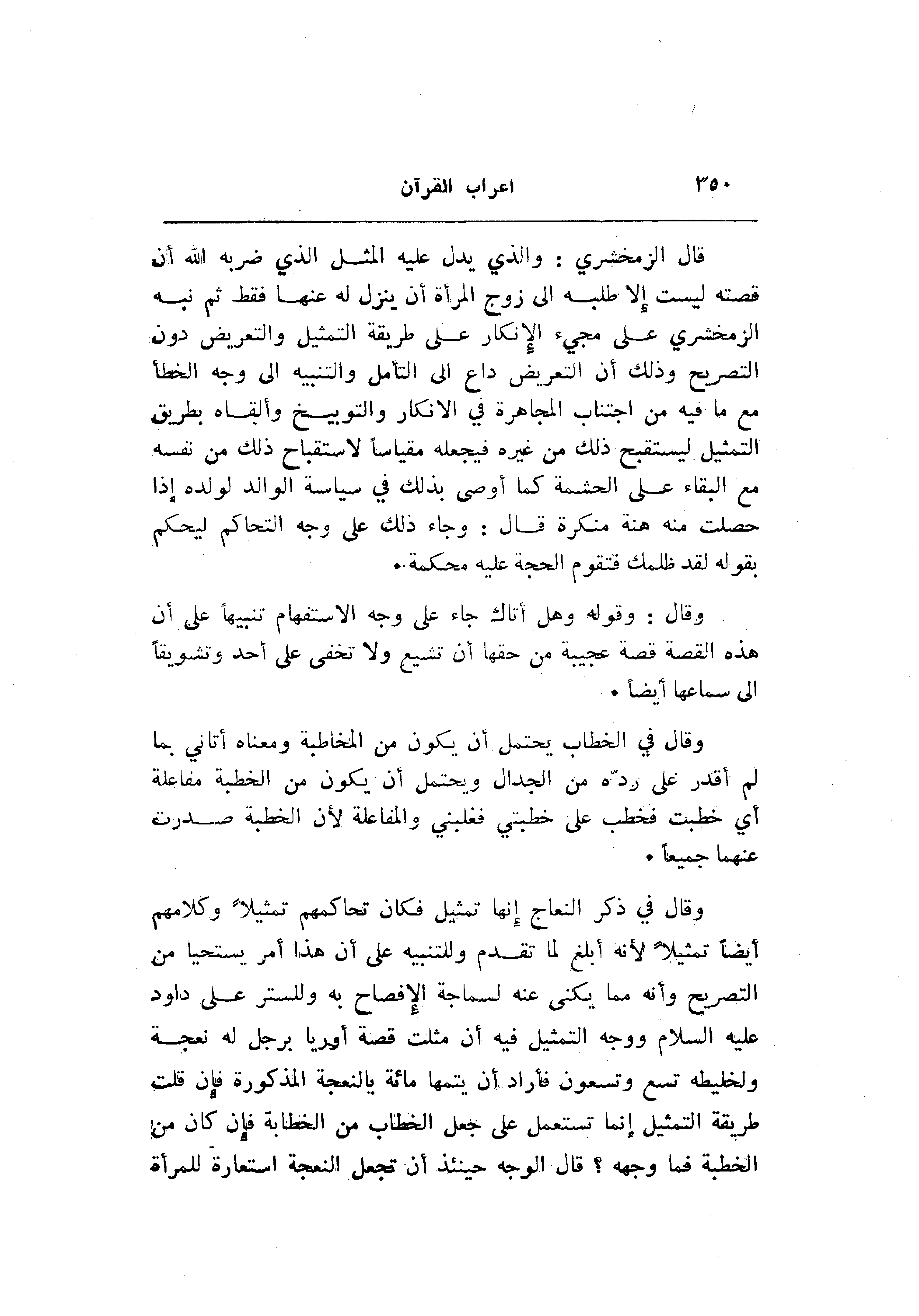 قال الزمخشري: والذي يدل عليه المثل الذي ضربه الله أن قصته ليست إلا طلبه الى زوج المرأة أن ينزل له عنها فقط ثم نبه الزمخشري على مجيء الإنكار على طريقة التمثيل والتعريض دون التصريح وذلك أن التعريض داع الى التأمل والتنبيه الى وجه الخطأ مع ما فيه من اجتناب المجاهرة في الإنكار والتوبيخ وألقاه بطريق التمثيل ليستقبح ذلك من غيره فيجعله مقياسا لاستقباح ذلك من نفسه مع البقاء على الحشمة كما أوصى بذلك في سياسة الوالد لولده إذا حصلت منه هنة منكرة قال: وجاء ذلك على وجه التحاكم ليحكم بقوله لقد ظلمك فتقوم الحجة عليه محكمة.