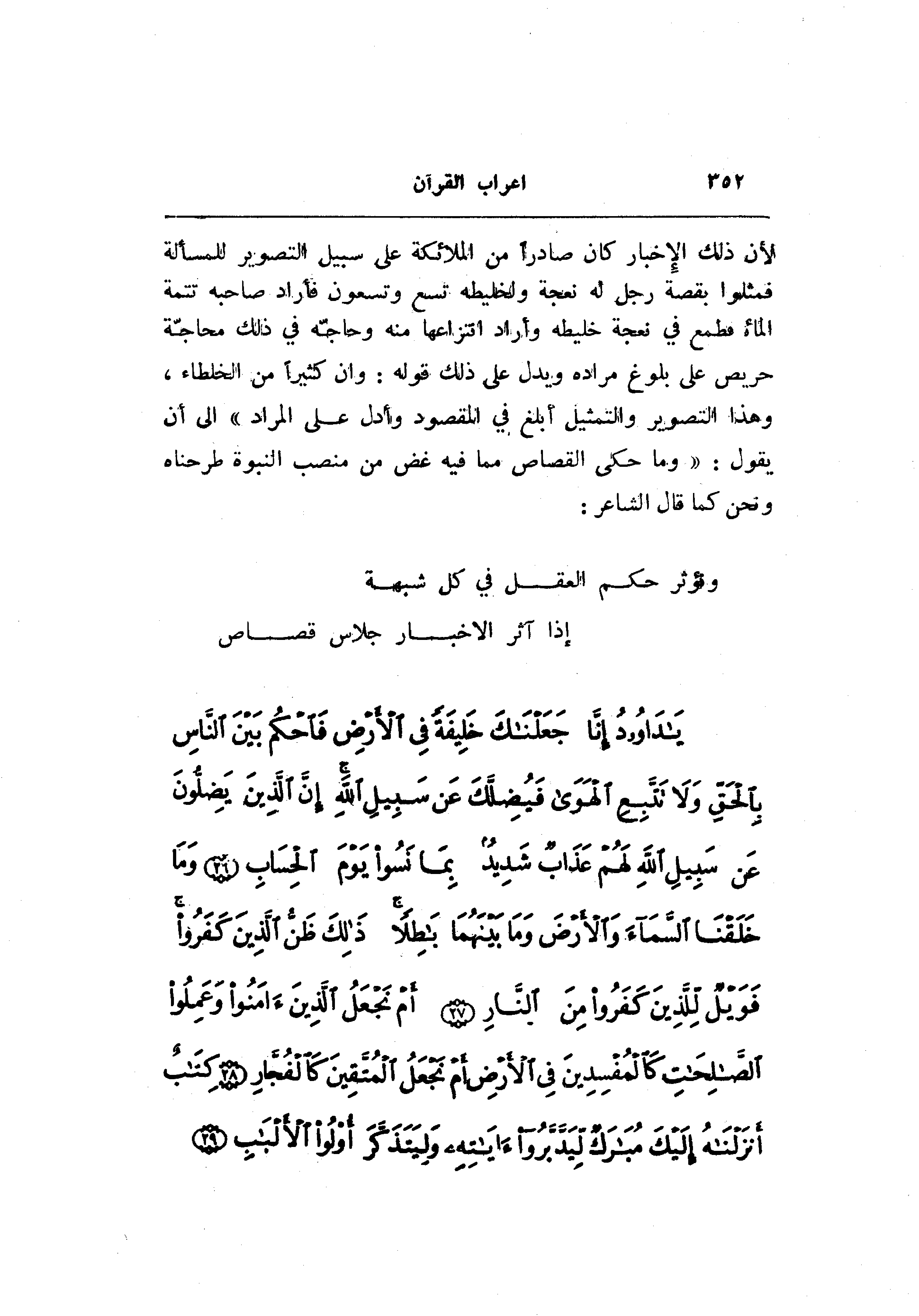 لأن ذلك الإخبار كان صادرا من الملائكة على سبيل التصوير للمسألة فمثلوا بقصة رجل له نعجة ولخليطه تسع وتسعون فأراد صاحبه تتمة الماء فطمع في نعجة خليطه وأراد انتزاعها منه وحاجّه في ذلك محاجّة حريص على بلوغ مراده ويدل على ذلك قوله: وان كثيرا من الخلطاء، وهذا التصوير والتمثيل أبلغ في المقصود وأدل على المراد» الى أن يقول: «وما حكى القصاص مما فيه غض من منصب النبوة طرحناه ونحن كما قال الشاعر: