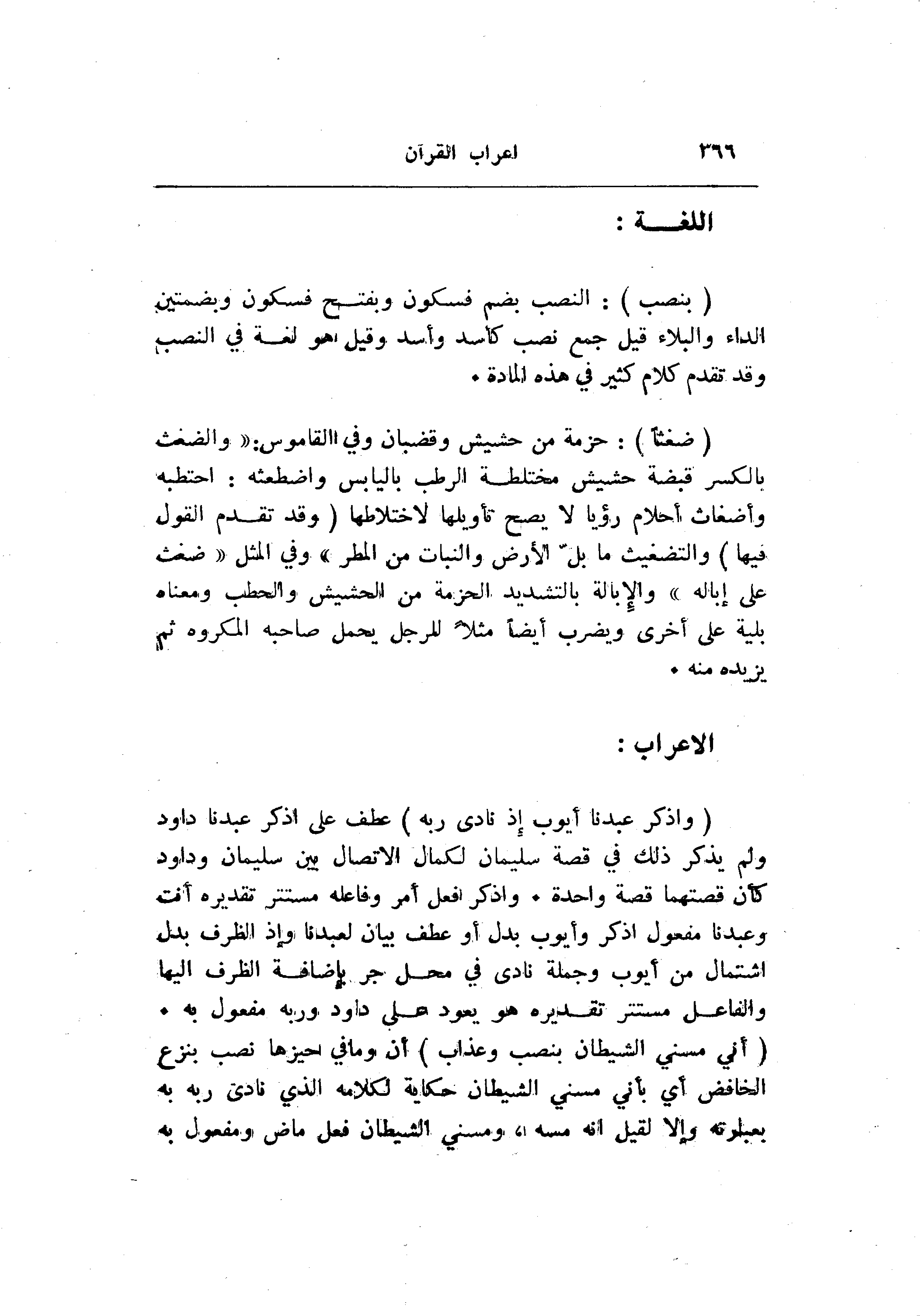 (بِنُصْبٍ) : النصب بضم فسكون وبفتح فسكون وبضمتين الداء والبلاء قيل جمع نصب كاسد وأسد وقيل هو لغة في النصب وقد تقدم كلام كثير في هذه المادة.