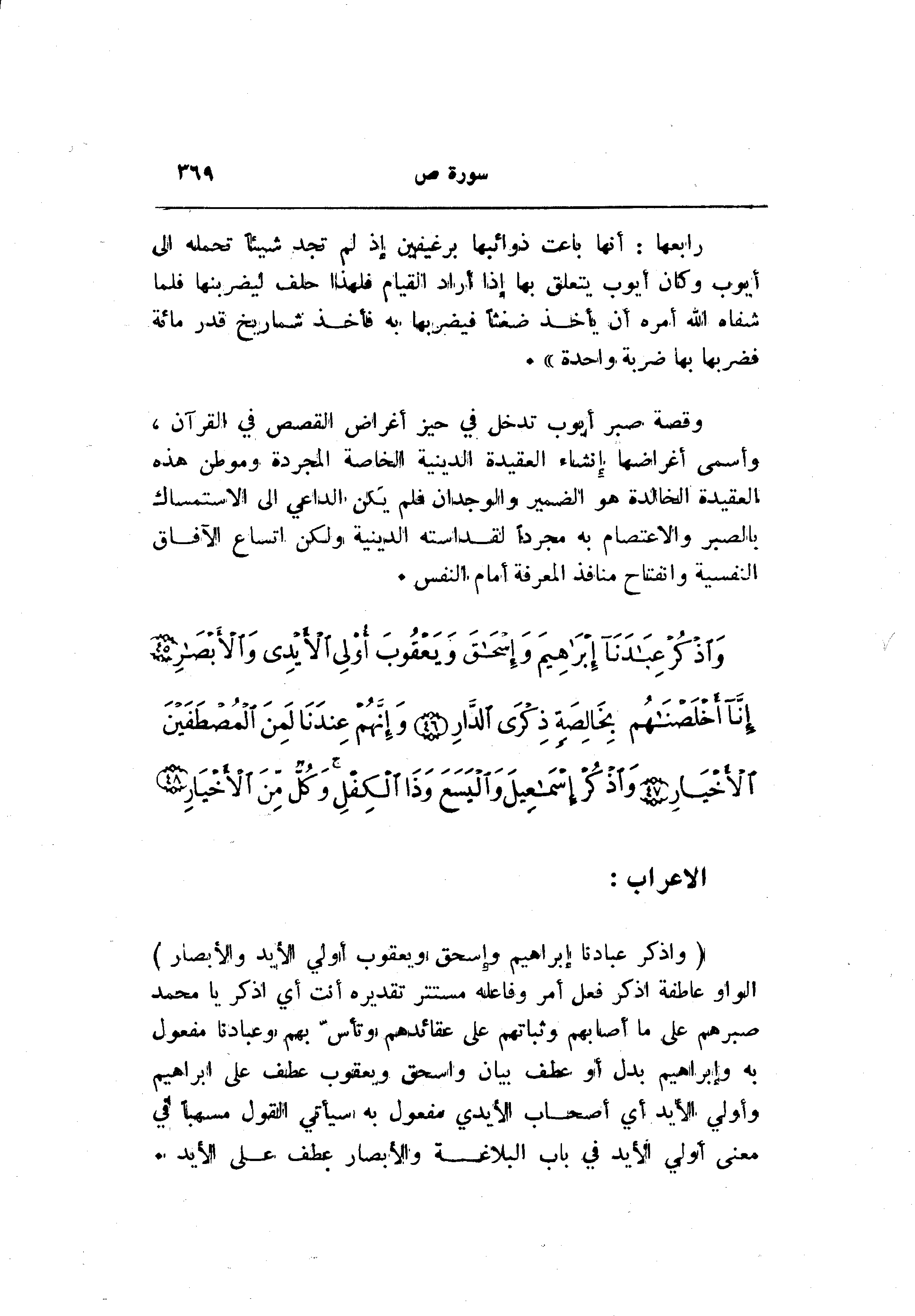 (وَاذْكُرْ عِبادَنا إِبْراهِيمَ وَإِسْحاقَ وَيَعْقُوبَ أُولِي الْأَيْدِي وَالْأَبْصارِ) الواو عاطفة اذكر فعل أمر وفاعله مستتر تقديره أنت أي اذكر يا محمد صبرهم على ما أصابهم وثباتهم على عقائدهم وتأسّ بهم وعبادنا مفعول به وإبراهيم بدل أو عطف بيان واسحق ويعقوب عطف على ابراهيم وأولي الأيد أي أصحاب الأيدي مفعول به سيأتي القول مسهبا في معنى أولي الأيد في باب البلاغة والأبصار عطف على الأيد.