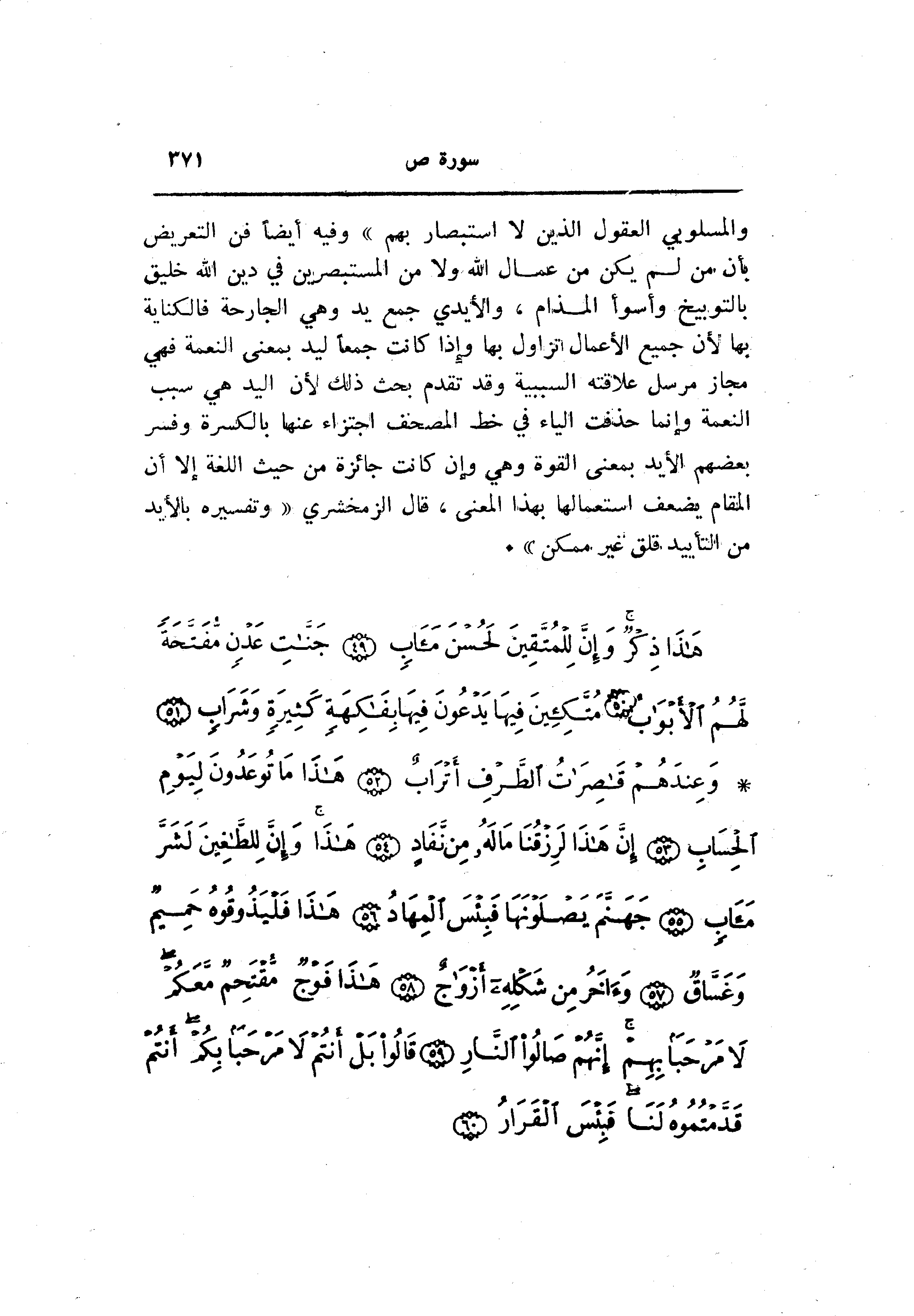 هذا ذِكْرٌ وَإِنَّ لِلْمُتَّقِينَ لَحُسْنَ مَآبٍ (49) جَنَّاتِ عَدْنٍ مُفَتَّحَةً لَهُمُ الْأَبْوابُ (50) مُتَّكِئِينَ فِيها يَدْعُونَ فِيها بِفاكِهَةٍ كَثِيرَةٍ وَشَرابٍ (51) وَعِنْدَهُمْ قاصِراتُ الطَّرْفِ أَتْرابٌ (52) هذا ما تُوعَدُونَ لِيَوْمِ الْحِسابِ (53)