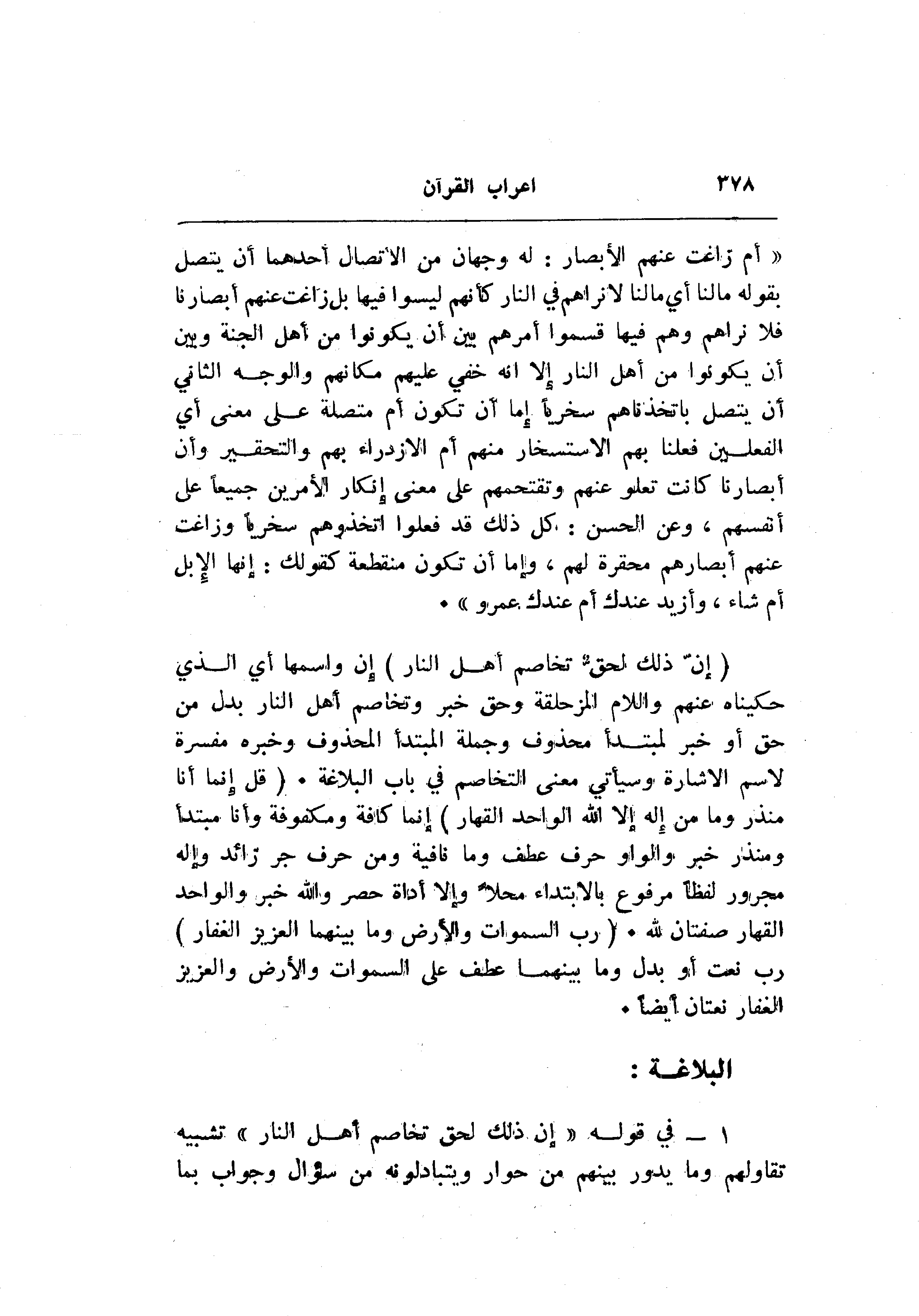 (إِنَّ ذلِكَ لَحَقٌّ تَخاصُمُ أَهْلِ النَّارِ) إن واسمها أي الذي حكيناه عنهم واللام المزحلقة وحق خبر وتخاصم أهل النار بدل من حق أو خبر لمبتدأ محذوف وجملة المبتدأ المحذوف وخبره مفسرة لاسم الاشارة وسيأتي معنى التخاصم في باب البلاغة. (قُلْ إِنَّما أَنَا مُنْذِرٌ وَما مِنْ إِلهٍ إِلَّا اللَّهُ الْواحِدُ الْقَهَّارُ) إنما كافة ومكفوفة وأنا مبتدأ ومنذر خبر والواو حرف عطف وما نافية ومن حرف جر زائد وإله مجرور لفظا مرفوع بالابتداء محلا وإلا أداة حصر والله خبر والواحد القهار صفتان لله. (رَبُّ السَّماواتِ وَالْأَرْضِ وَما بَيْنَهُمَا الْعَزِيزُ الْغَفَّارُ) رب نعت أو بدل وما بينهما عطف على السموات والأرض والعزيز الغفار نعتان أيضا.