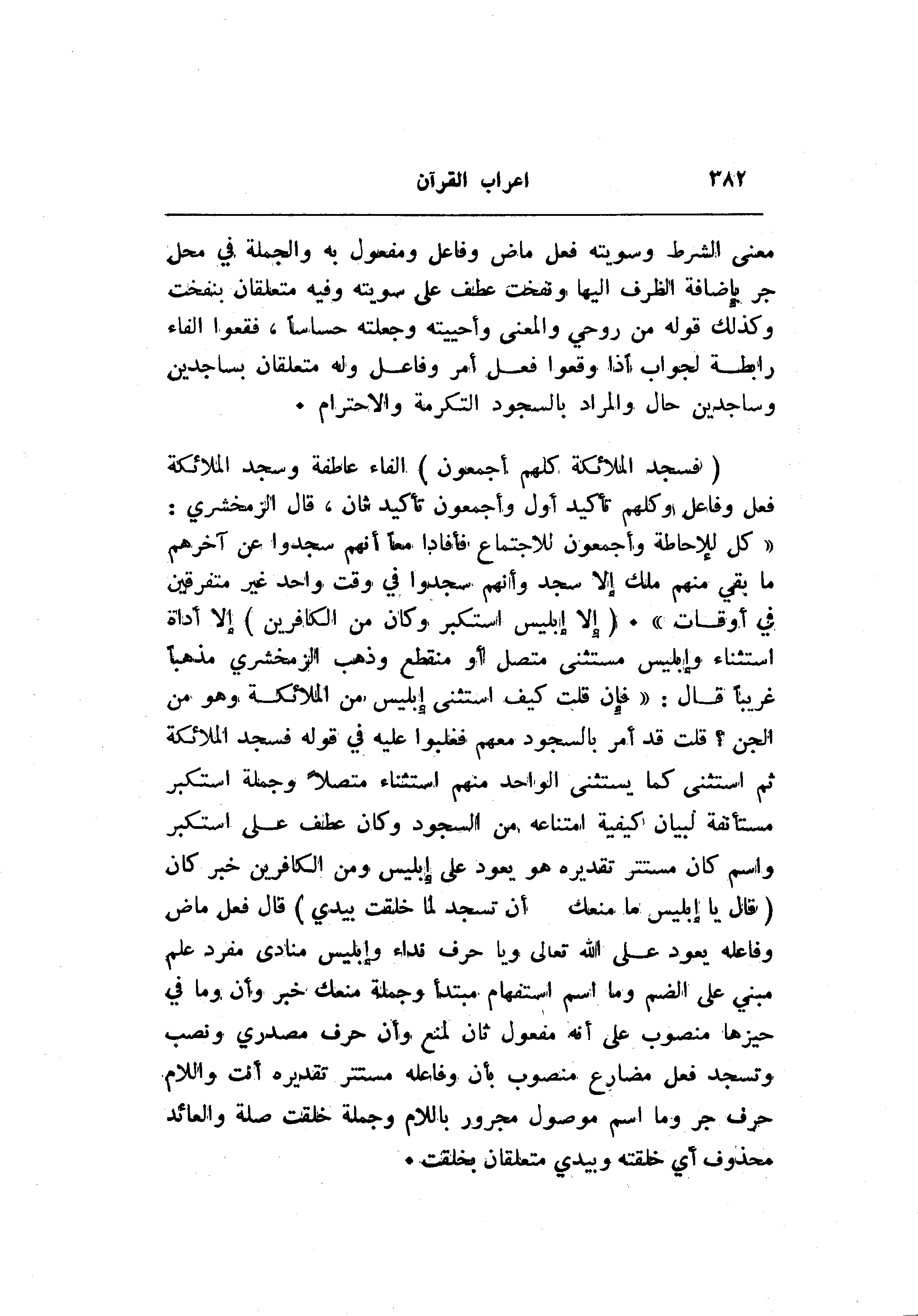 إلا أداة استثناء وإبليس مستثنى متصل أو منقطع وذهب الزمخشري مذهبا غريبا قال: «فإن قلت كيف استثنى إبليس من الملائكة وهو من الجن؟ قلت قد أمر بالسجود معهم فغلبوا عليه في قوله فسجد الملائكة ثم استثنى كما يستثنى الواحد منهم استثناء متصلا وجملة استكبر مستأنفة لبيان كيفية امتناعه من السجود وكان عطف على استكبر واسم كان مستتر تقديره هو يعود على إبليس ومن الكافرين خبر كان (قالَ يا إِبْلِيسُ ما مَنَعَكَ أَنْ تَسْجُدَ لِما خَلَقْتُ بِيَدَيَّ) قال فعل ماض وفاعله يعود على الله تعالى ويا حرف نداء وإبليس منادى مفرد علم مبني على الضم وما اسم استفهام مبتدأ وجملة منعك خبر وأن وما في حيزها منصوب على أنه مفعول ثان لمنع وأن حرف مصدري ونصب وتسجد فعل مضارع منصوب بأن وفاعله مستتر تقديره أنت واللام حرف جر وما اسم موصول مجرور باللام وجملة خلقت صلة والعائد محذوف أي خلقته وبيدي متعلقان بخلقت.