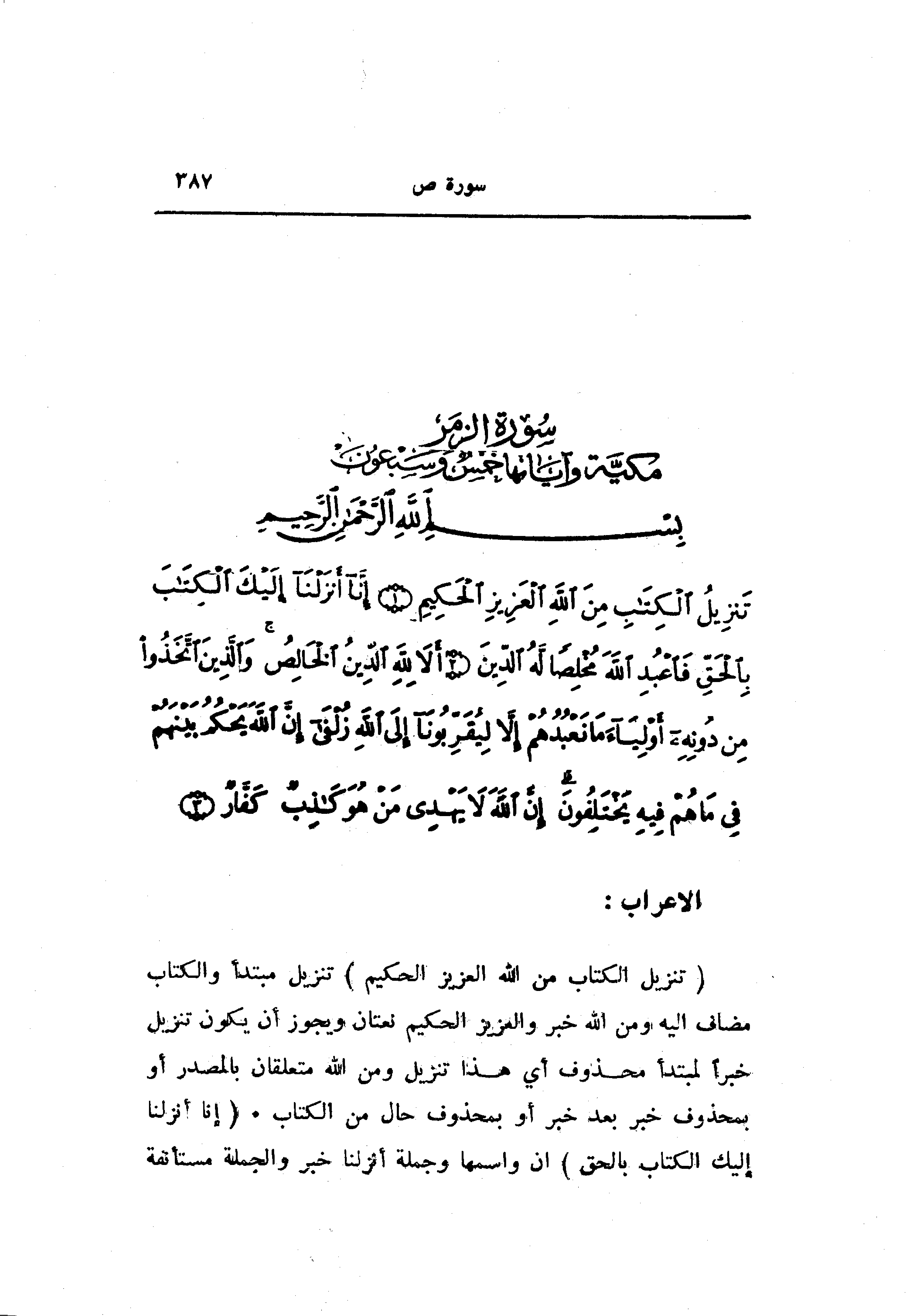 تَنْزِيلُ الْكِتابِ مِنَ اللَّهِ الْعَزِيزِ الْحَكِيمِ) تنزيل مبتدأ والكتاب مضاف اليه ومن الله خبر والعزيز الحكيم نعتان ويجوز أن يكون تنزيل خبرا لمبتدأ محذوف أي هذا تنزيل ومن الله متعلقان بالمصدر أو بمحذوف خبر بعد خبر أو بمحذوف حال من الكتاب. (إِنَّا أَنْزَلْنا إِلَيْكَ الْكِتابَ بِالْحَقِّ) ان واسمها وجملة أنزلنا خبر والجملة مستأنفة