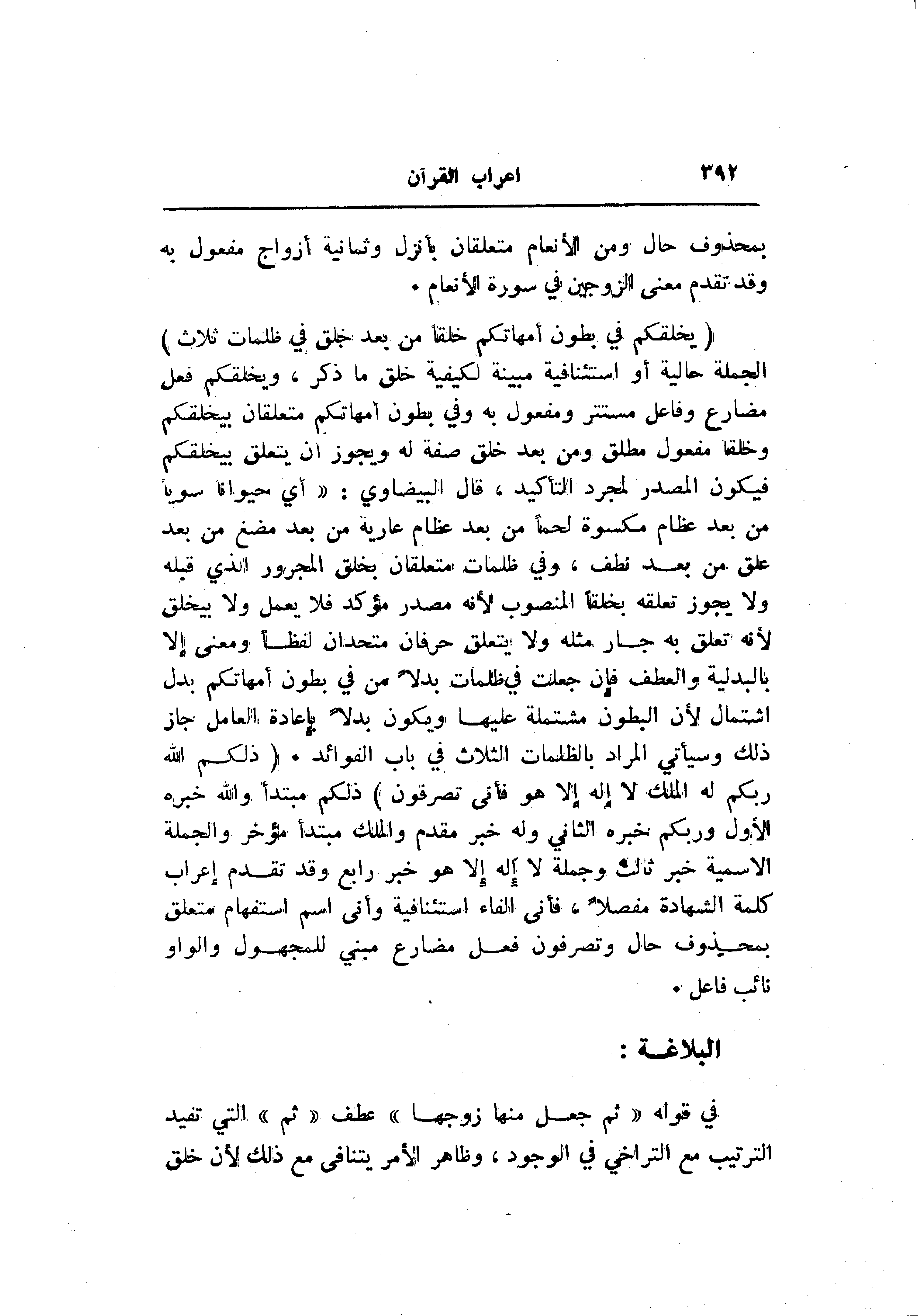 (يَخْلُقُكُمْ فِي بُطُونِ أُمَّهاتِكُمْ خَلْقاً مِنْ بَعْدِ خَلْقٍ فِي ظُلُماتٍ ثَلاثٍ) الجملة حالية أو استئنافية مبينة لكيفية خلق ما ذكر، ويخلقكم فعل مضارع وفاعل مستتر ومفعول به وفي بطون أمهاتكم متعلقان بيخلقكم وخلقا مفعول مطلق ومن بعد خلق صفة له ويجوز أن يتعلق بيخلقكم فيكون المصدر لمجرد التأكيد، قال البيضاوي: «أي حيوانا سويا من بعد عظام مكسوة لحما من بعد عظام عارية من بعد مضغ من بعد علق من بعد نطف، وفي ظلمات متعلقان بخلق المجرور الذي قبله ولا يجوز تعلقه بخلقا المنصوب لأنه مصدر مؤكد فلا يعمل ولا بيخلق لأنه تعلق به جار مثله ولا يتعلق حرفان متحدان لفظا ومعنى إلا بالبدلية والعطف فإن جعلت في ظلمات بدلا من في بطون أمهاتكم بدل اشتمال لأن البطون مشتملة عليها ويكون بدلا بإعادة العامل جاز ذلك وسيأتي المراد بالظلمات الثلاث في باب الفوائد. (ذلِكُمُ اللَّهُ رَبُّكُمْ لَهُ الْمُلْكُ لا إِلهَ إِلَّا هُوَ فَأَنَّى تُصْرَفُونَ) ذلكم مبتدأ والله خبره الأول وربكم خبره الثاني وله خبر مقدم والملك مبتدأ مؤخر والجملة الاسمية خبر ثالث وجملة لا إله إلا هو خبر رابع وقد تقدم إعراب كلمة الشهادة مفصلا، فأنى الفاء استئنافية وأنى اسم استفهام متعلق بمحذوف حال وتصرفون فعل مضارع مبني للمجهول والواو نائب فاعل.