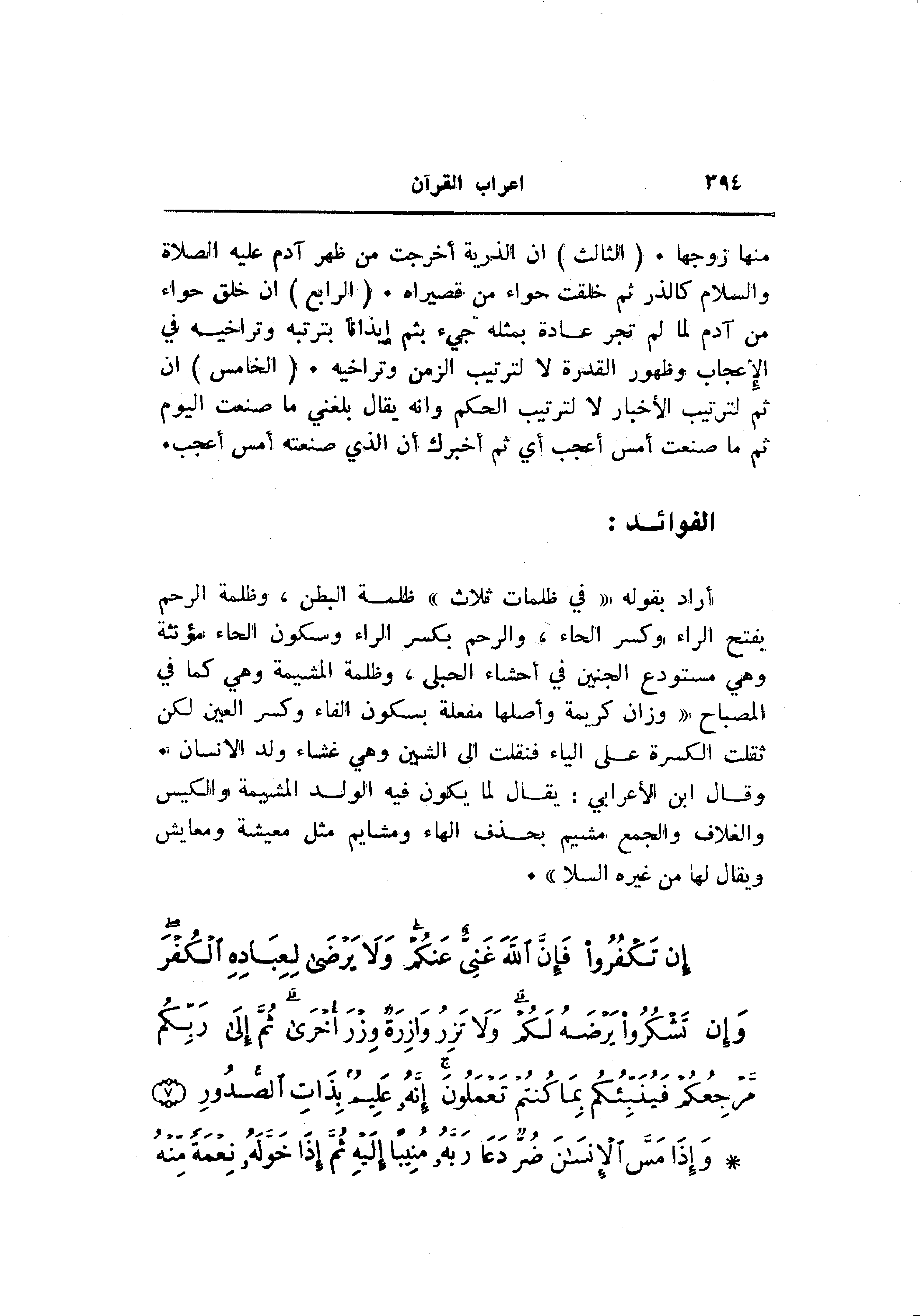 منها زوجها. (الثالث) ان الذرية أخرجت من ظهر آدم عليه الصلاة والسلام كالذر ثم خلقت حواء من قصيراه. (الرابع) ان خلق حواء من آدم لما لم تجر عادة بمثله جيء بثم إيذانا بترتبه وتراخيه في الإعجاب وظهور القدرة لا لترتيب الزمن وتراخيه. (الخامس) ان ثم لترتيب الأخبار لا لترتيب الحكم وانه يقال بلغني ما صنعت اليوم ثم ما صنعت أمس أعجب أي ثم أخبرك أن الذي صنعته أمس أعجب.