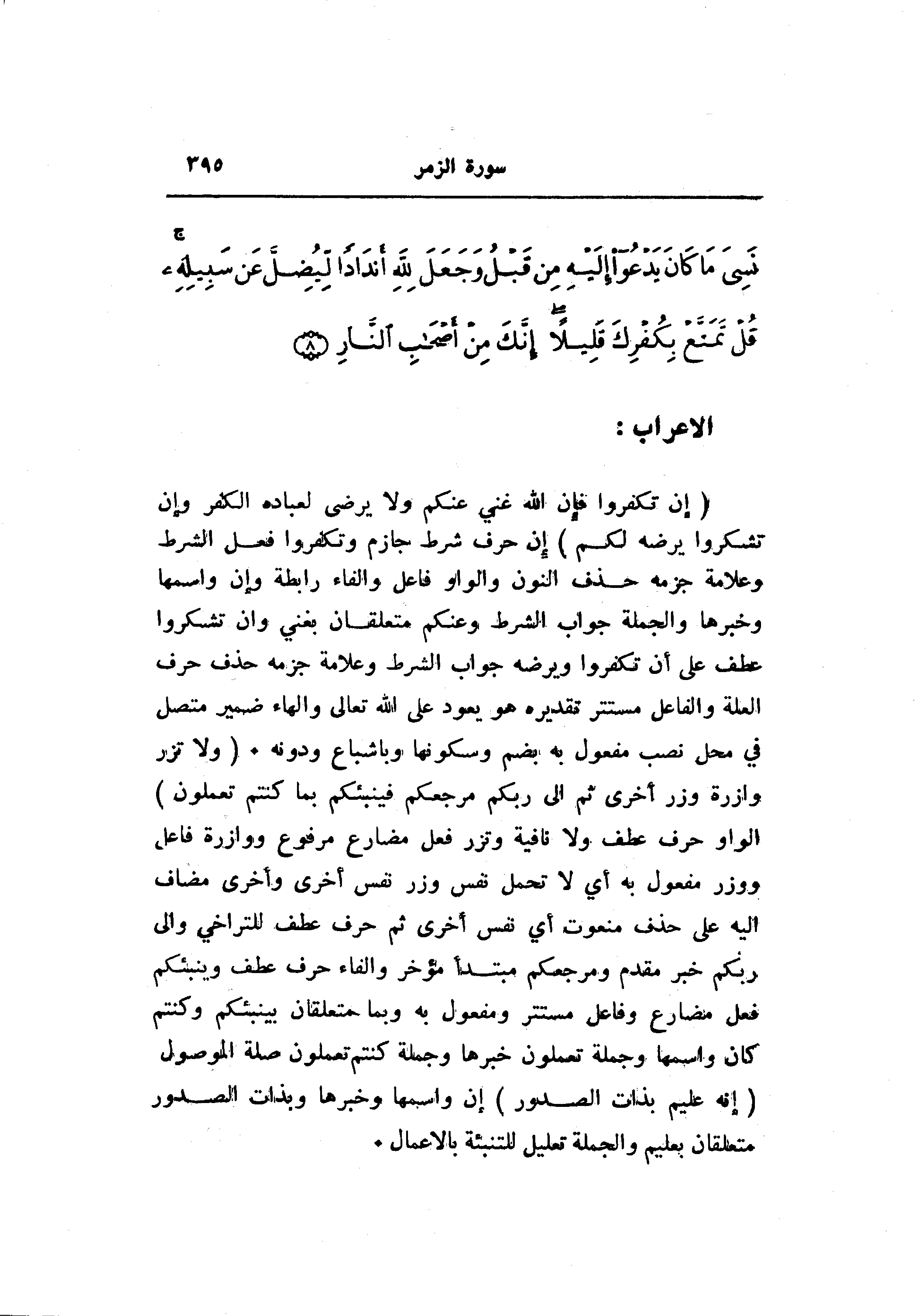 (إِنْ تَكْفُرُوا فَإِنَّ اللَّهَ غَنِيٌّ عَنْكُمْ وَلا يَرْضى لِعِبادِهِ الْكُفْرَ وَإِنْ تَشْكُرُوا يَرْضَهُ لَكُمْ) إن حرف شرط جازم وتكفروا فعل الشرط وعلامة جزمه حذف النون والواو فاعل والفاء رابطة وإن واسمها وخبرها والجملة جواب الشرط وعنكم متعلقان بغني وان تشكروا عطف على أن تكفروا ويرضه جواب الشرط وعلامة جزمه حذف حرف العلة والفاعل مستتر تقديره هو يعود على الله تعالى والهاء ضمير متصل في محل نصب مفعول به بضم وسكونها وبإشباع ودونه. (وَلا تَزِرُ وازِرَةٌ وِزْرَ أُخْرى ثُمَّ إِلى رَبِّكُمْ مَرْجِعُكُمْ فَيُنَبِّئُكُمْ بِما كُنْتُمْ تَعْمَلُونَ) الواو حرف عطف ولا نافية وتزر فعل مضارع مرفوع ووازرة فاعل ووزر مفعول به أي لا تحمل نفس وزر نفس أخرى وأخرى مضاف اليه على حذف منعوت أي نفس أخرى ثم حرف عطف للتراخي والى ربكم خبر مقدم ومرجعكم مبتدأ مؤخر والفاء حرف عطف وينبئكم فعل مضارع وفاعل مستتر ومفعول به وبما متعلقان بينبئكم وكنتم كان واسمها وجملة تعملون خبرها وجملة كنتم تعملون صلة الموصول (إِنَّهُ عَلِيمٌ بِذاتِ الصُّدُورِ) إن واسمها وخبرها وبذات الصدور متعلقان بعليم والجملة تعليل للتنبئة بالأعمال.